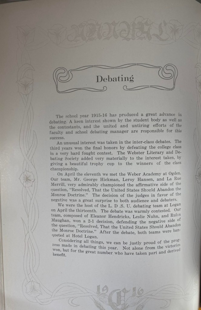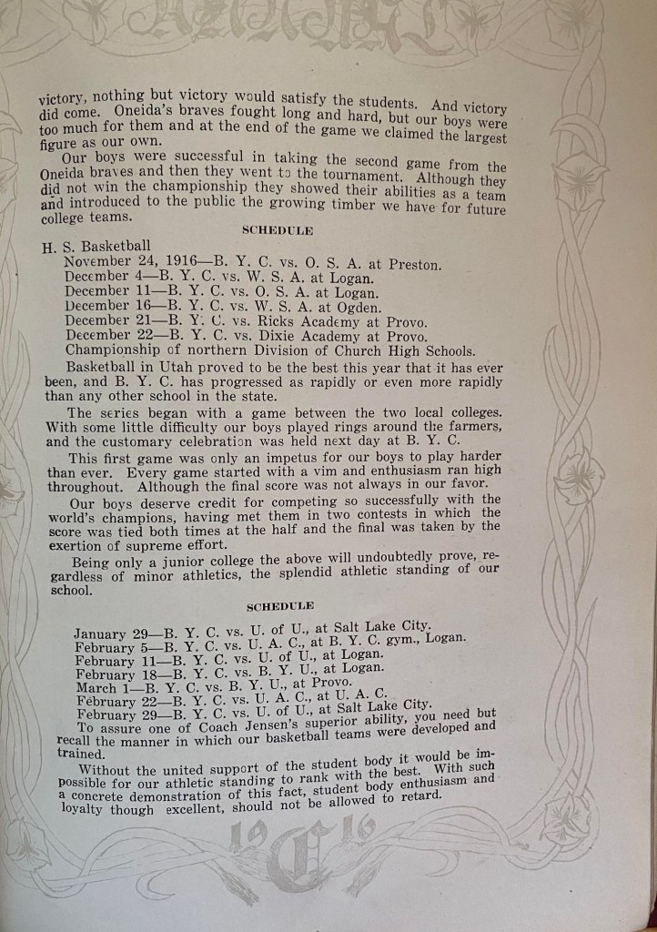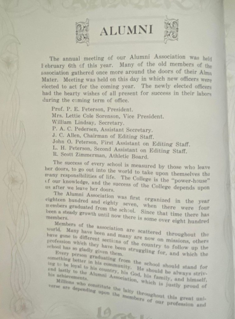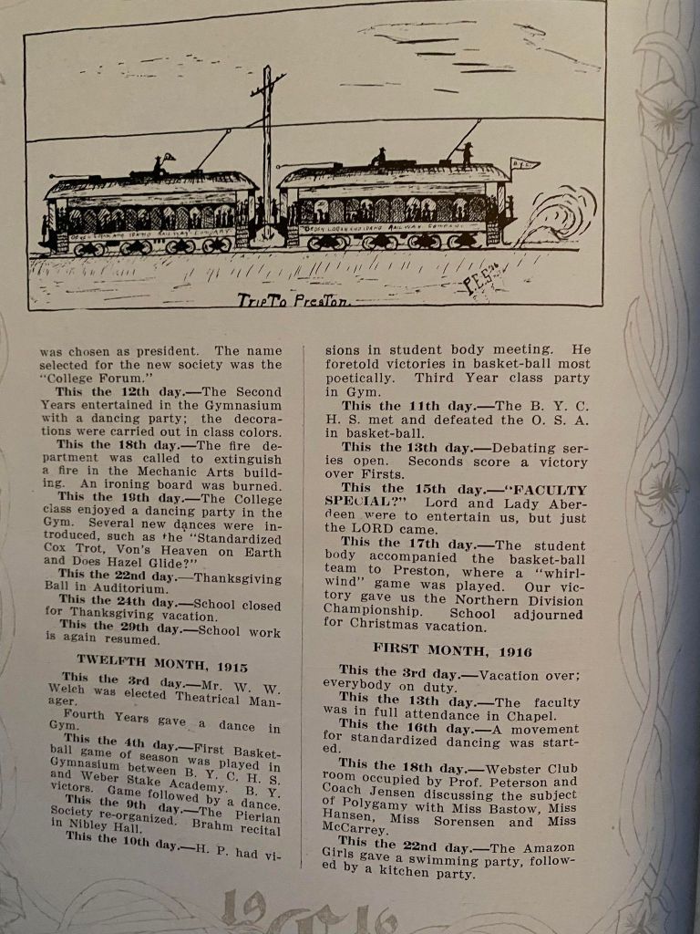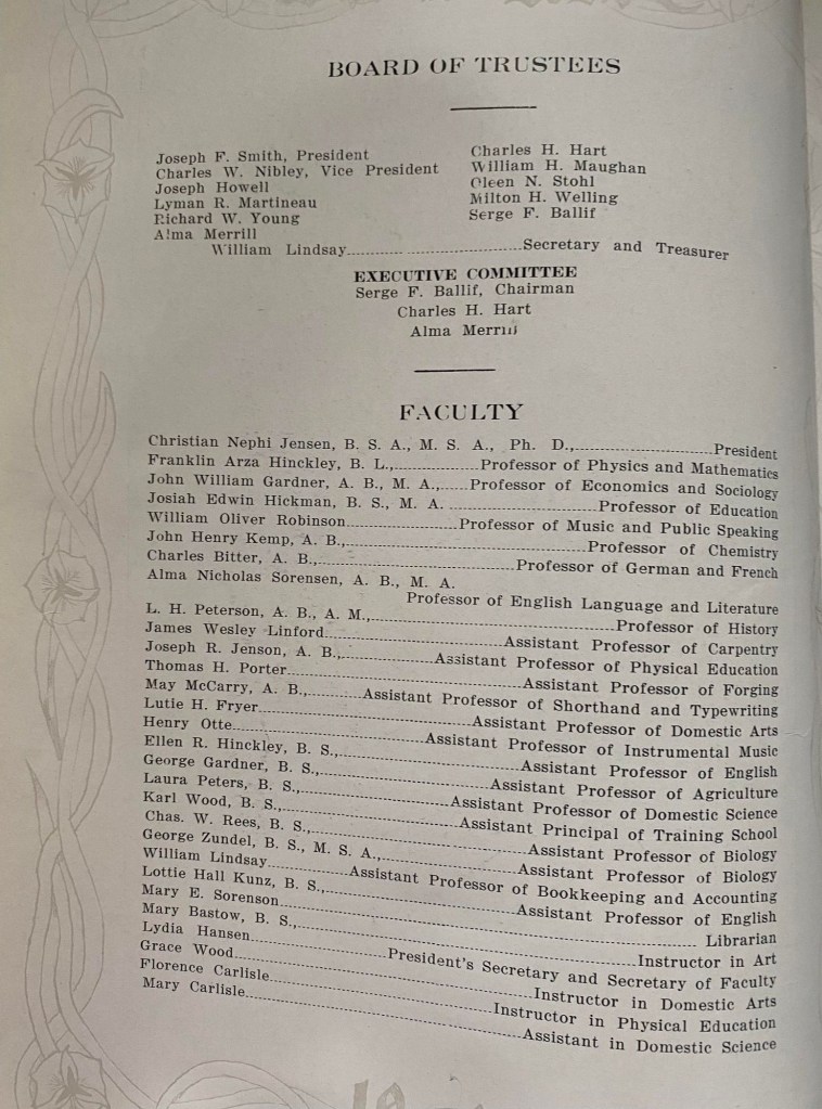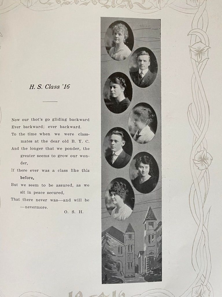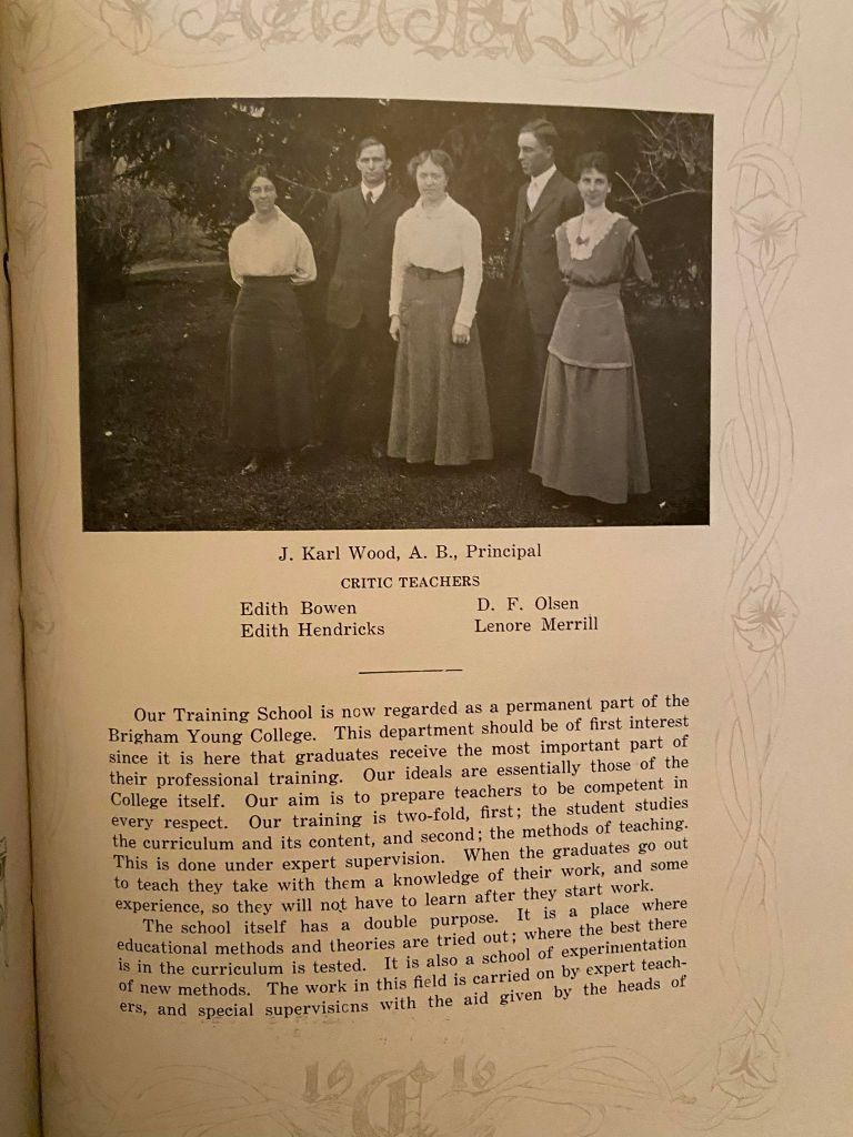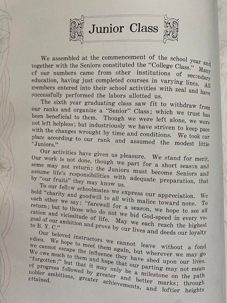 Brigham Young College had nearly 40,000 students in the period of its operation. Initially it was for preparing teachers (1877–1894), then offered college courses and for fifteen years (1894–1909) granted bachelor’s degrees. After 1909, it operated as a high school and junior college.