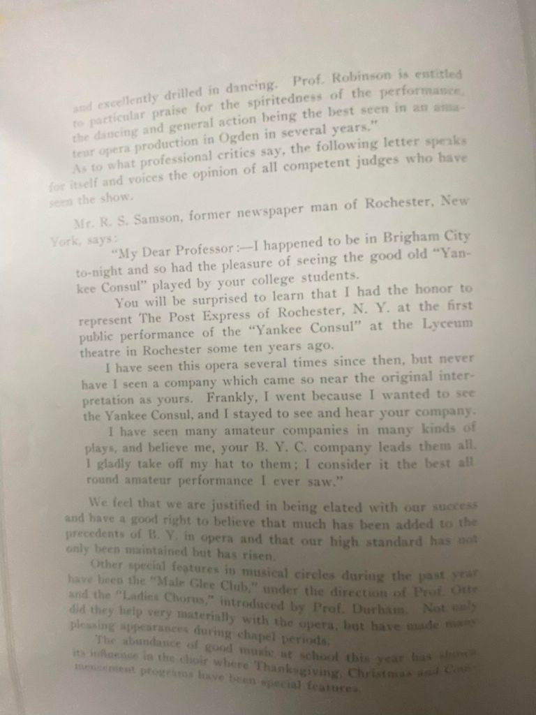 The presentation of “Yankee Consul” was performed in Brigham City and just happened to have the good pleasure of Mr. R. S. Samson, former newspaper man from Rochester, New York in the audience. His review was splendid, especially given that this was a performance from a small town in Northern, Utah.