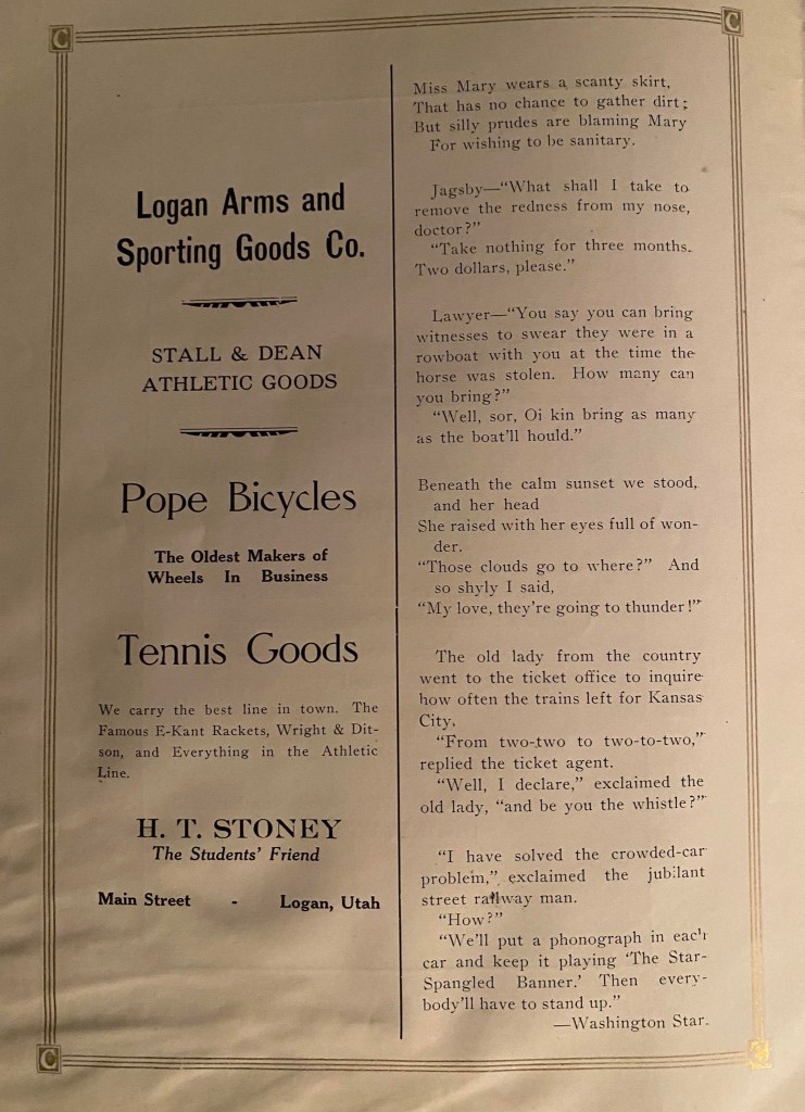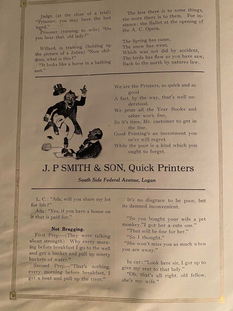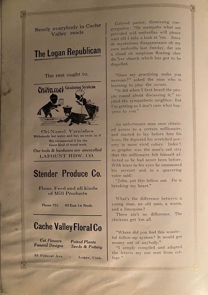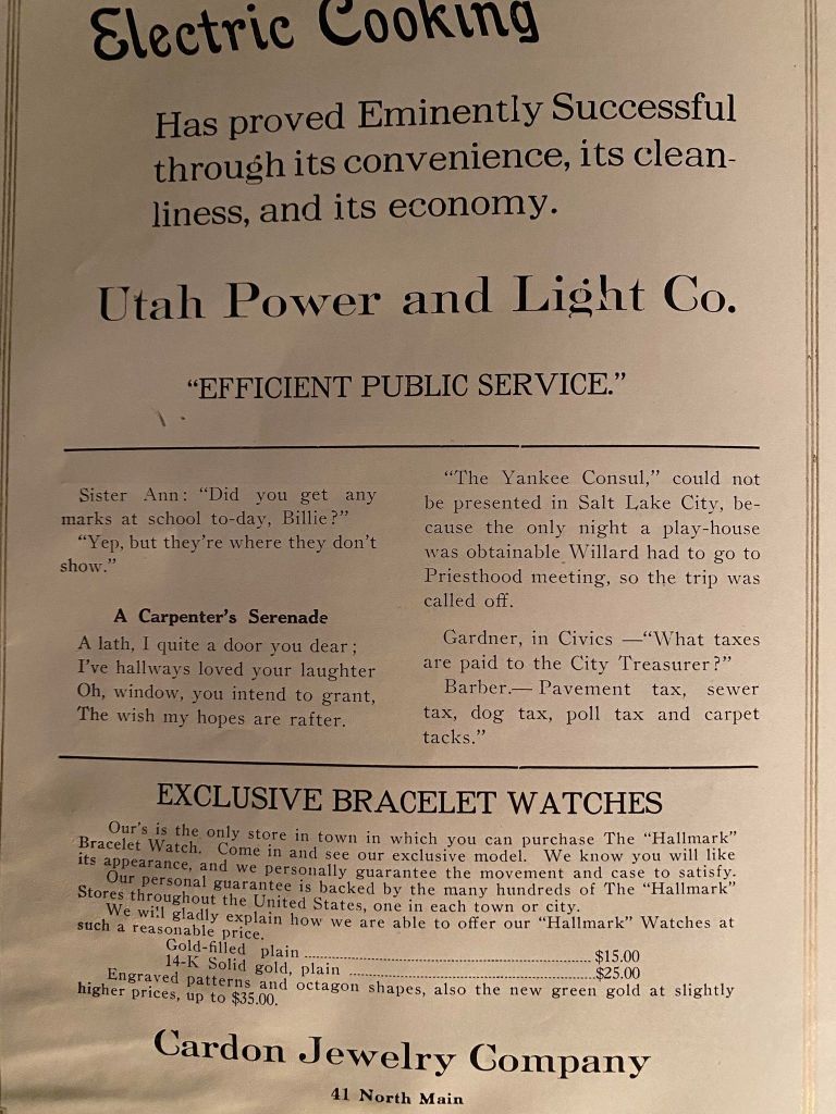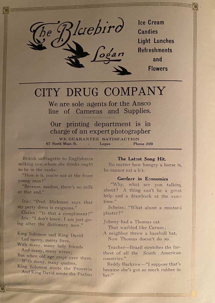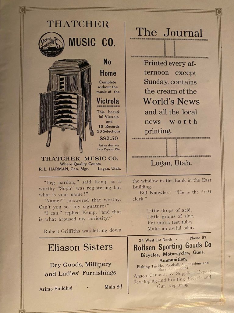 When dashing through the advertisements, stop for a brief moment to notice the humor of the times or how different the addresses and phone numbers were. Yes! Some had that new contraption. It is that “new” contraption that makes putting this website together so much easier, for which I am forever grateful!!!