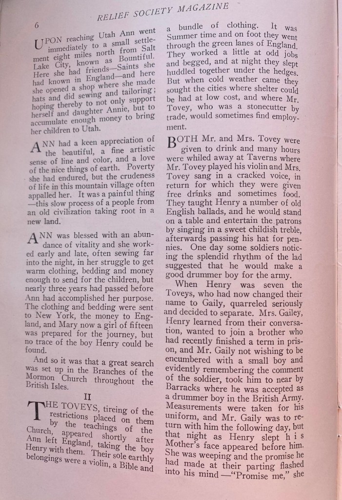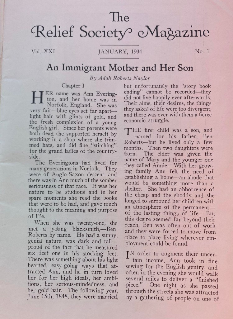 Ann Everington, An Immigrant Mother and Her Son, Adah Roberts Naylor ~January 1934 Relief Society Magazine Share this: Click to share on X (Opens in new window) X Like Loading...
