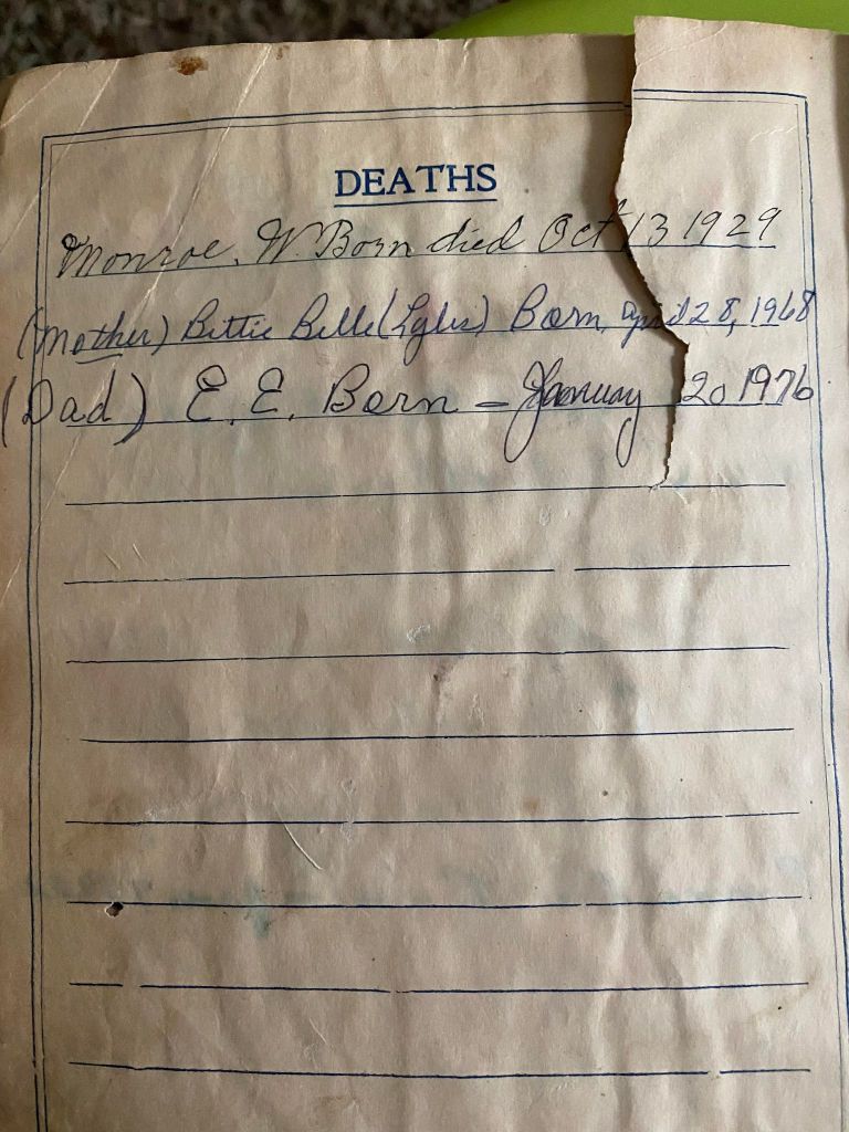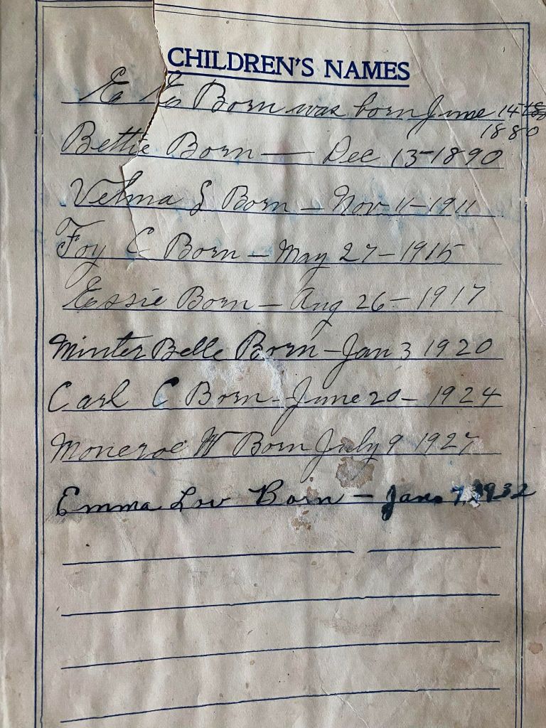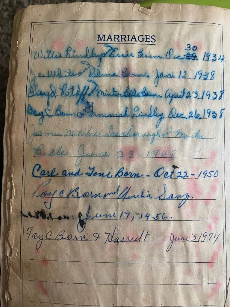“This certifies that E. E. Born of Royland (Rayland?), Texas and Bettie Belle Lyle (?) of Royland (Rayland?), Texas were by me united in Holy Matrimony according to the ordinances of God and the laws of the State of Texas on the 12 day of Feb in the year of Our Lord 1910. Judge Davis.”Marriages: Willie Lindley and Essie Born Dec 30, 1934. Joe White and Velma Born Jan 12, 1938. Floyd Ratliff and Minter Belle Born April 23, 1938. Foy C. Born and Femmah Lindley, Dec 26, 1938. James Mitchell Scarborough and Minter Belle June 23, 1948. Carl and Toni Born Oct 22, 1950. Foy C. Born and Aurelia Sanz June 17, 1956. Foy C, Born and Harriet June 3, 1974. Children’s Names: E. E. Born was born June 14, 1880. Bettie Born-Dec 13, 1890. Velma S Born-Nov 11, 1911. Foy C. Born-May 27, 1915. Essie Born-Aug 26, 1917. Minter Belle Born-Jan 3, 1920. Carl C. Born-June 20, 1924. Moneroe W Born-July 9, 1927. Emma Lou Born-Jan 7, 1932.Deaths: Monroe W Born died Oct 13, 1929. (Mother) Bettie Belle Lyles Born April 28, 1968. (Dad) E. E. Born January 20, 1976.