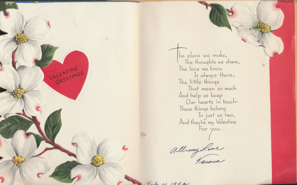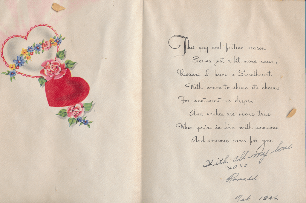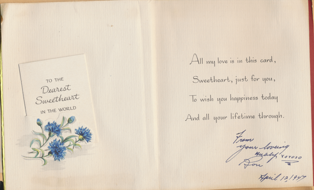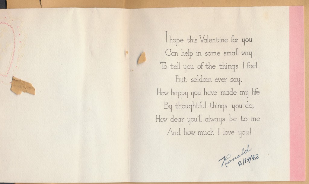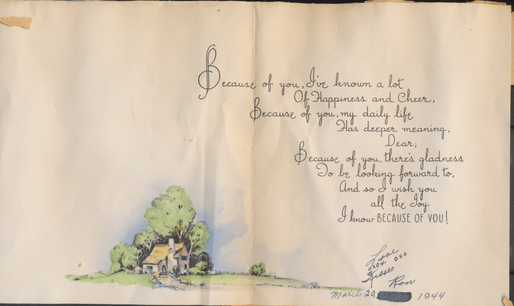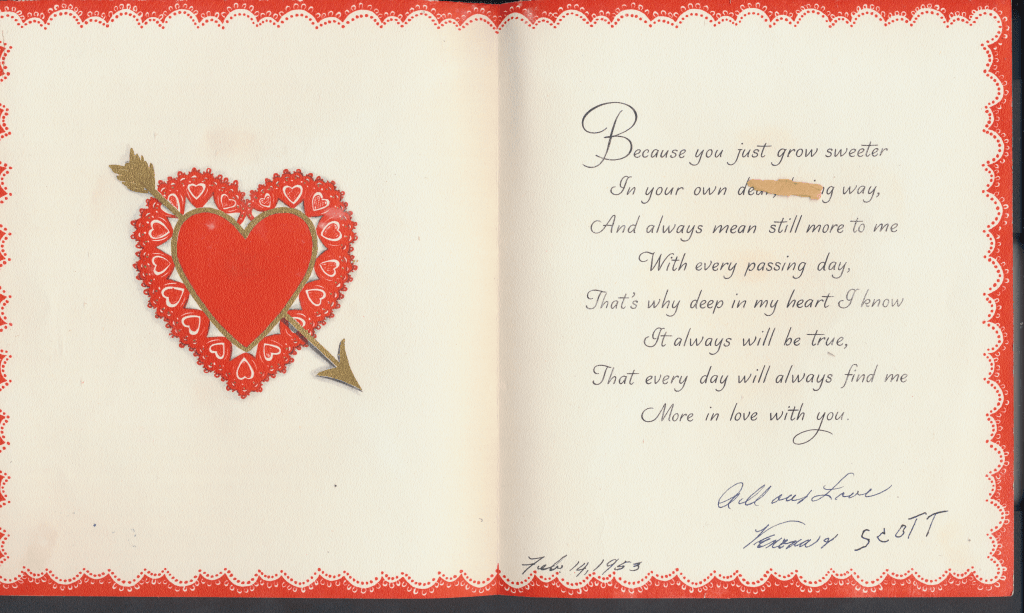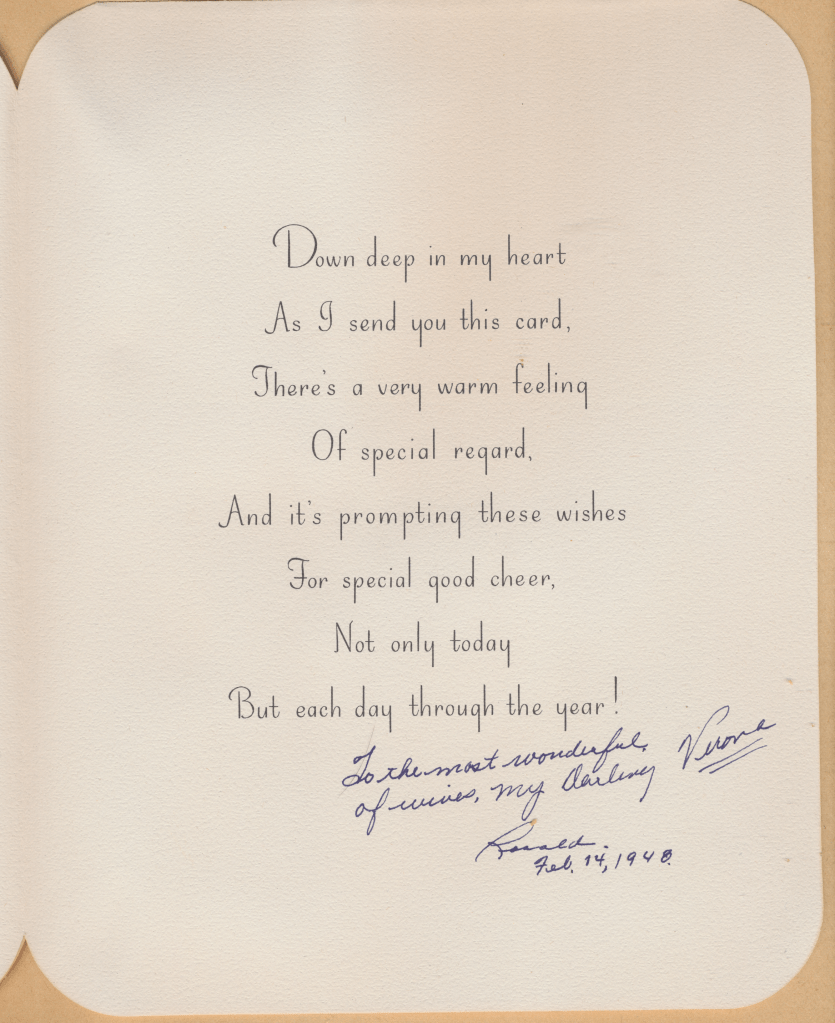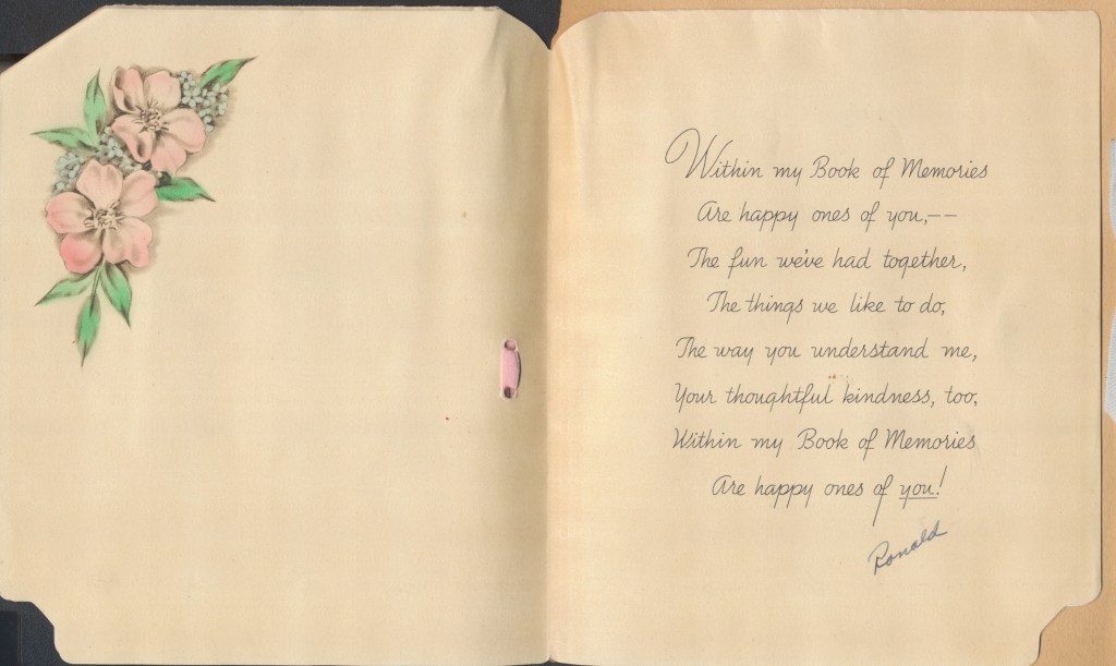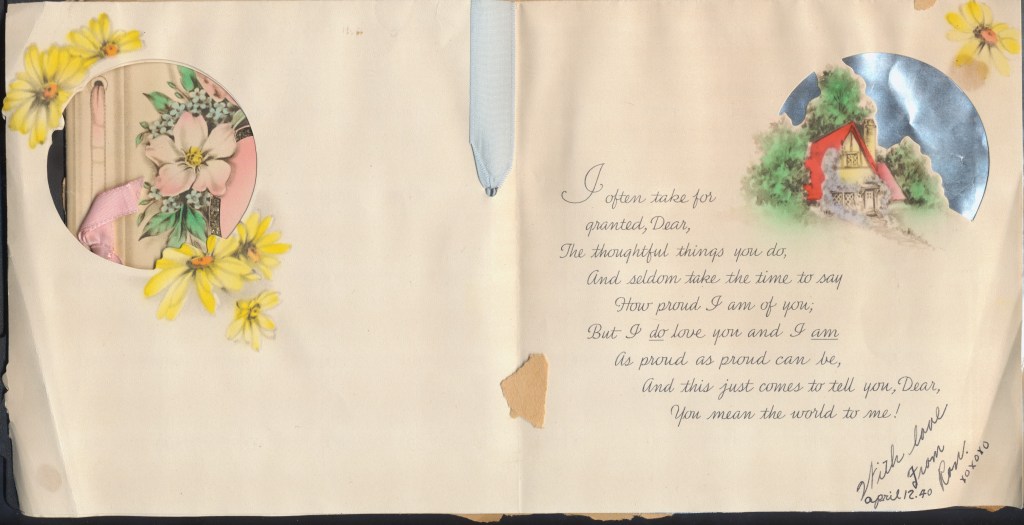 I came across the following treasure of a love story between Ronald and Verona. The cards span from 1937 to 1968. The one clue as to their last name was in a card labeled by their small son, Scott, when he put his full name as little ones do when they are learning to write. Curious, I found more information about them on familysearch.org. There, their daughter, Jan, added photos of this family giving additional life to the cards. Immerse with me as we travel in awe at their devotion to one another. Mystery still surrounds the cards such as what happened to Scott and Jan. And how did I end up with this special song of the heart.