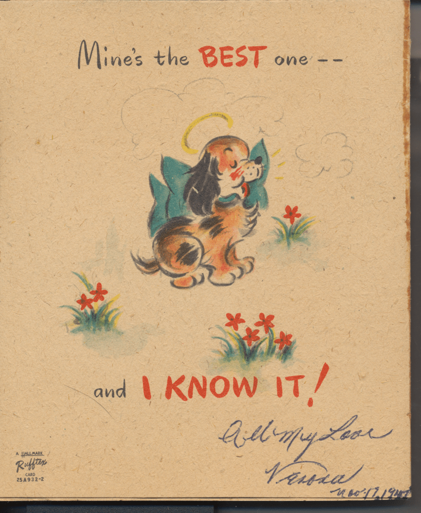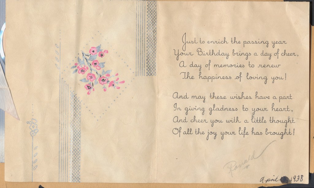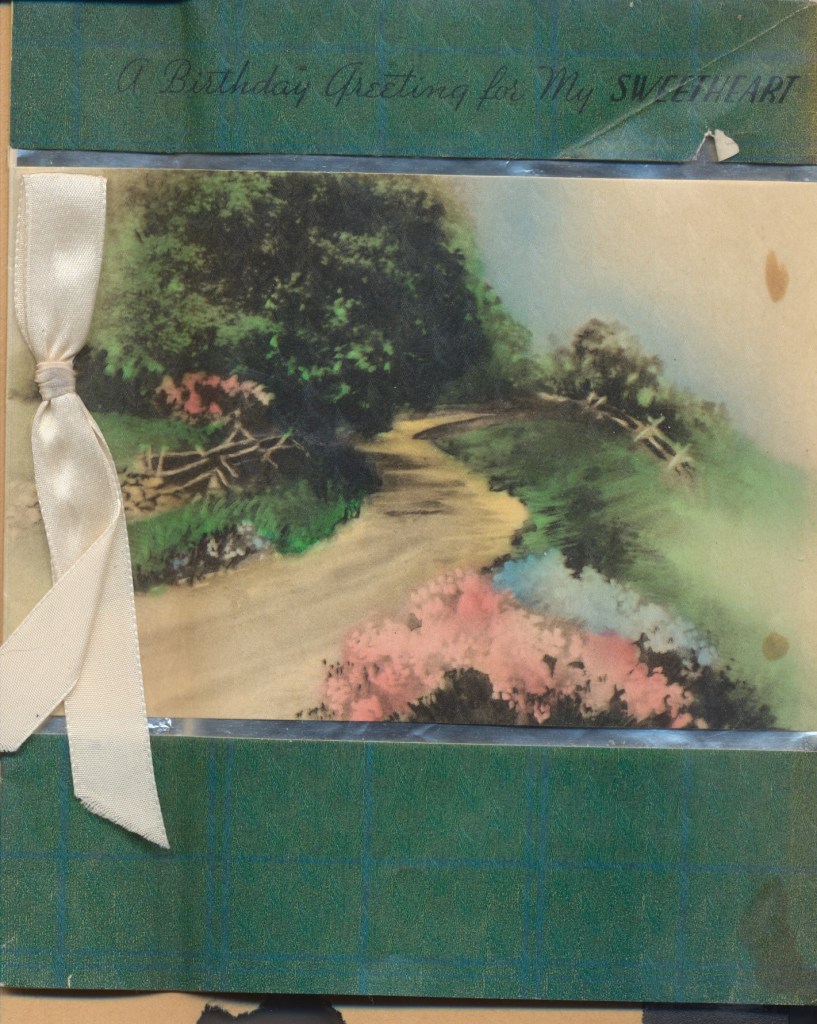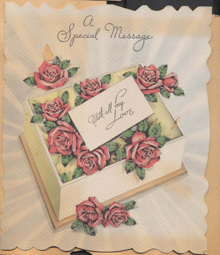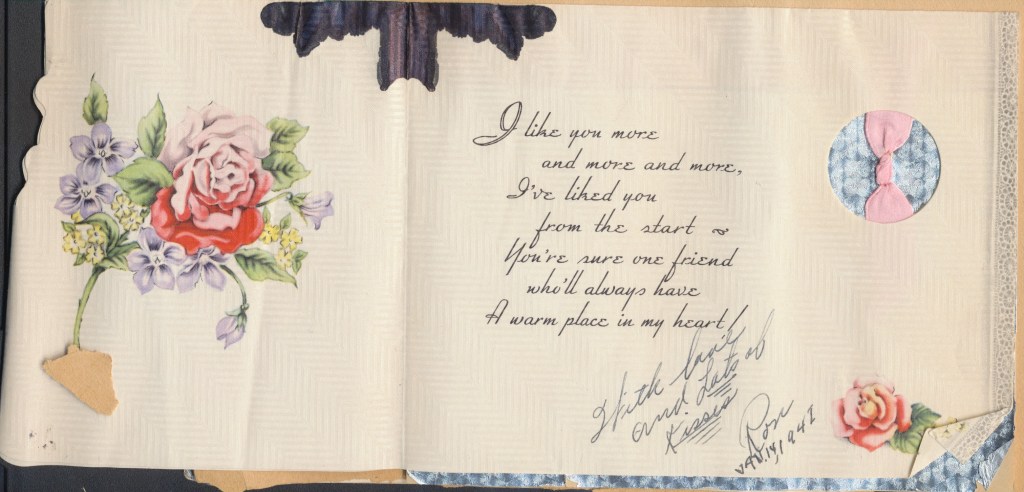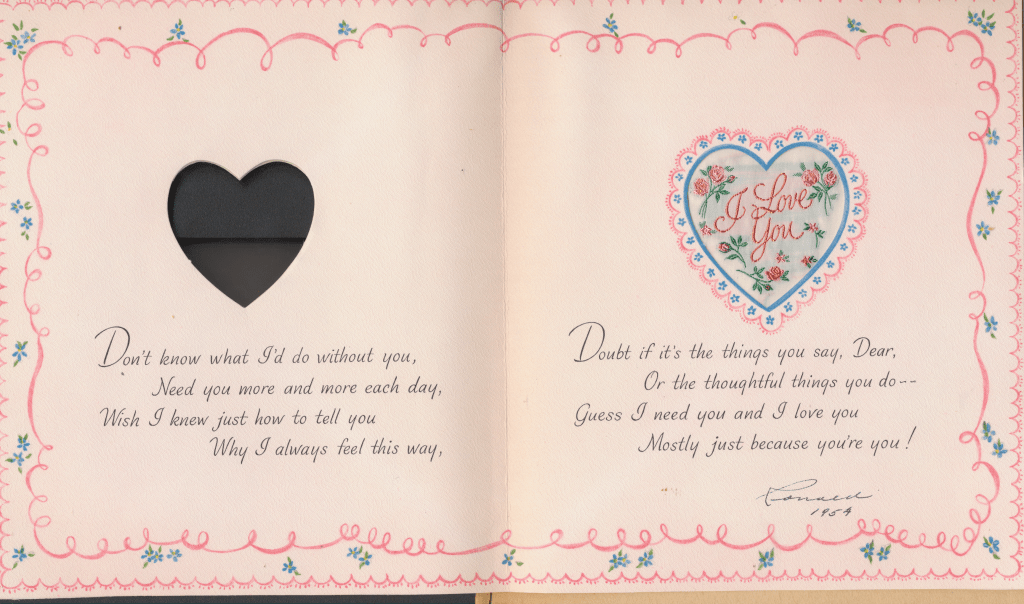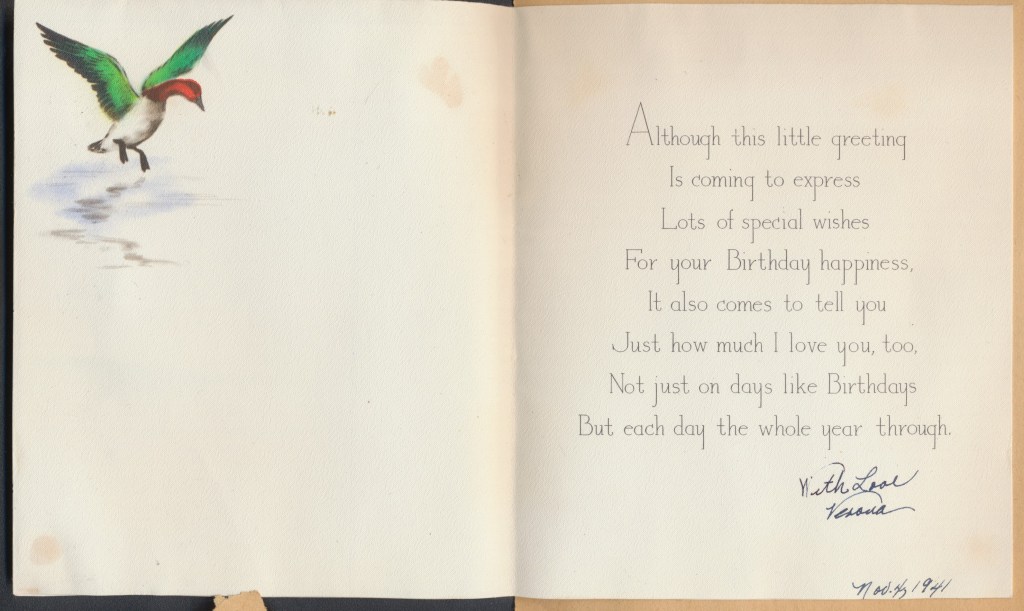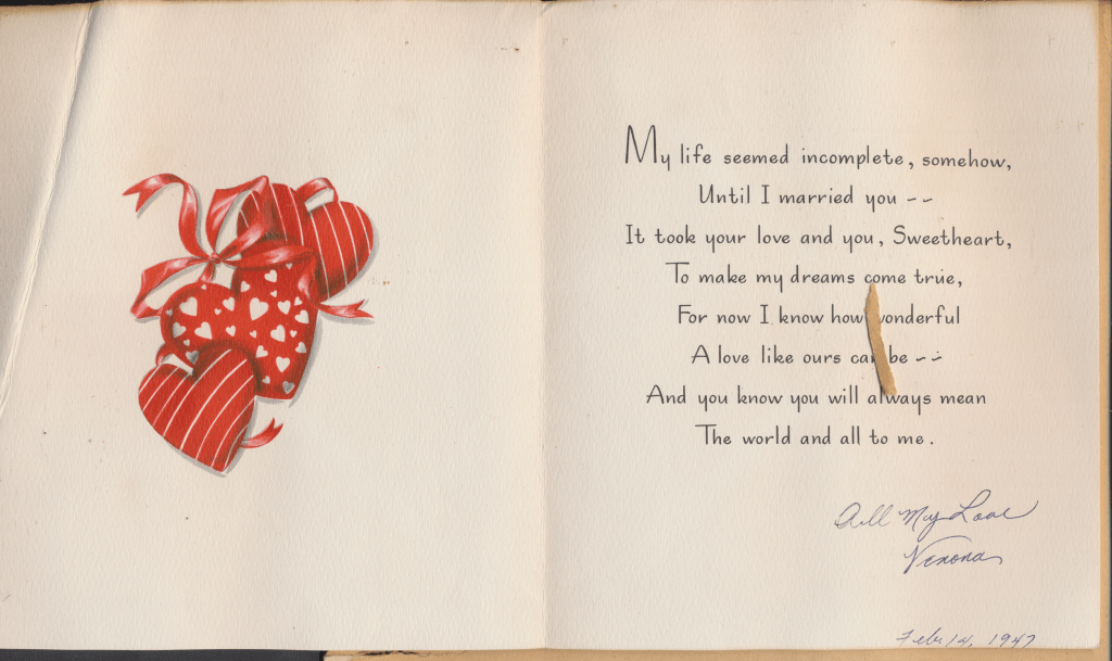 I came across the following treasure of a love story between Ronald and Verona. The cards span from 1937 to 1968. The one clue as to their last name was in a card labeled by their small son, Scott, when he put his full name as little ones do when they are learning to write. Curious, I found more information about them on familysearch.org. There, their daughter, Jan, added photos of this family giving additional life to the cards. Immerse with me as we travel in awe at their devotion to one another. Mystery still surrounds the cards such as what happened to Scott and Jan. And how did I end up with this special song of the heart.