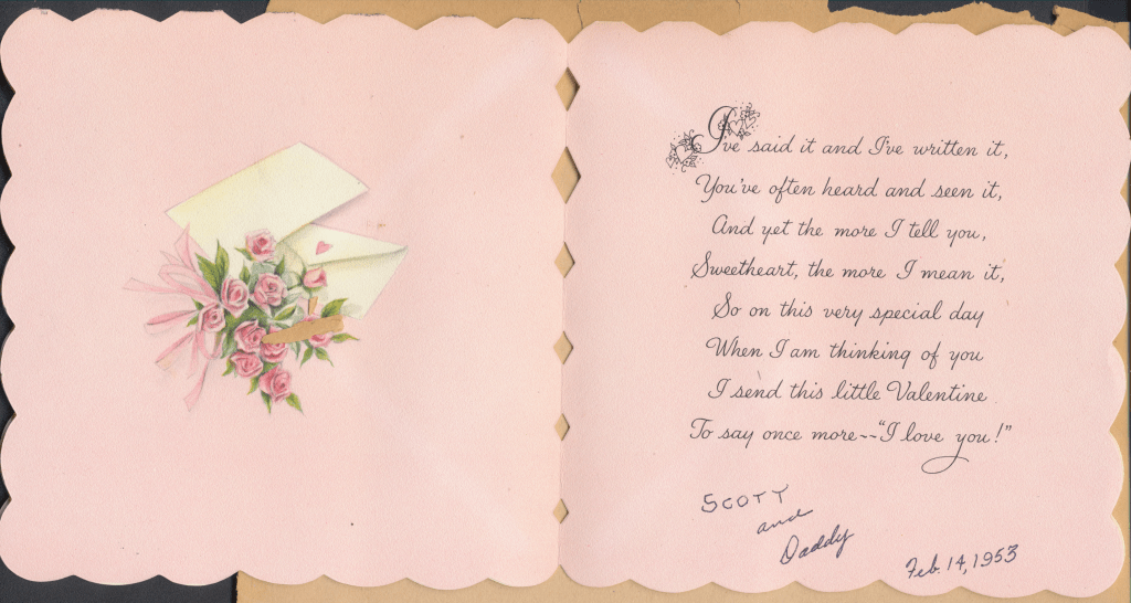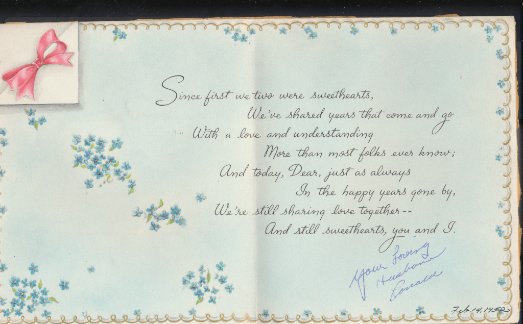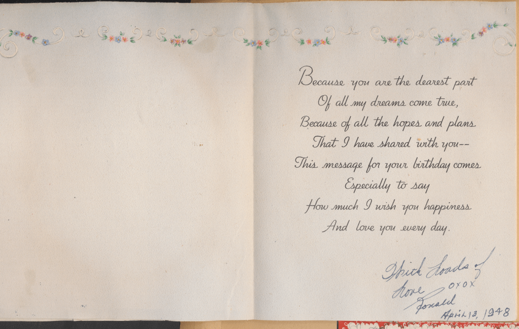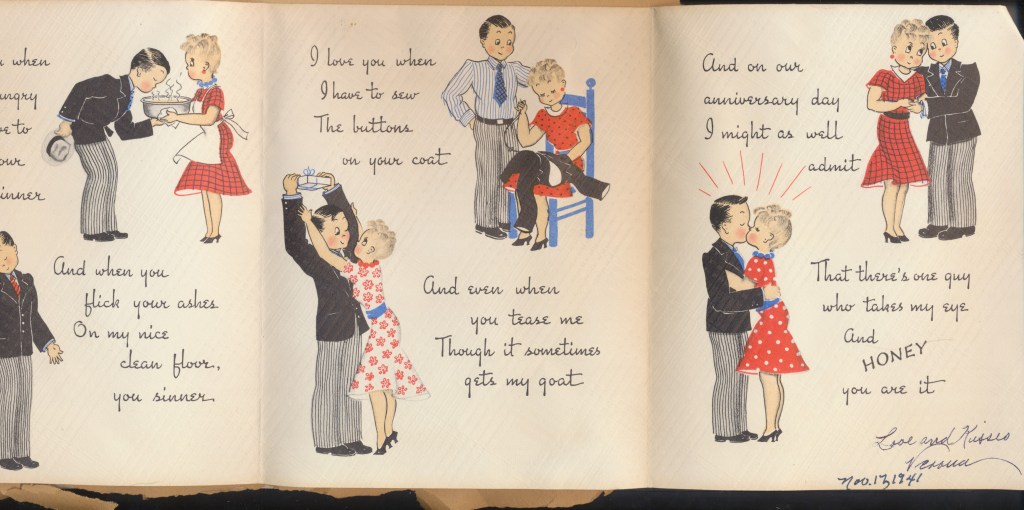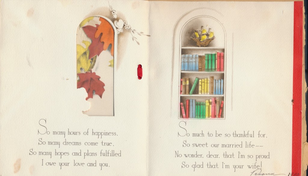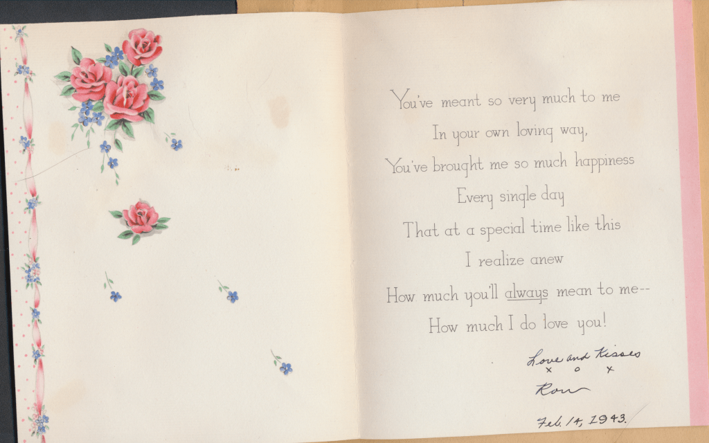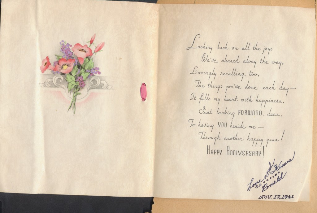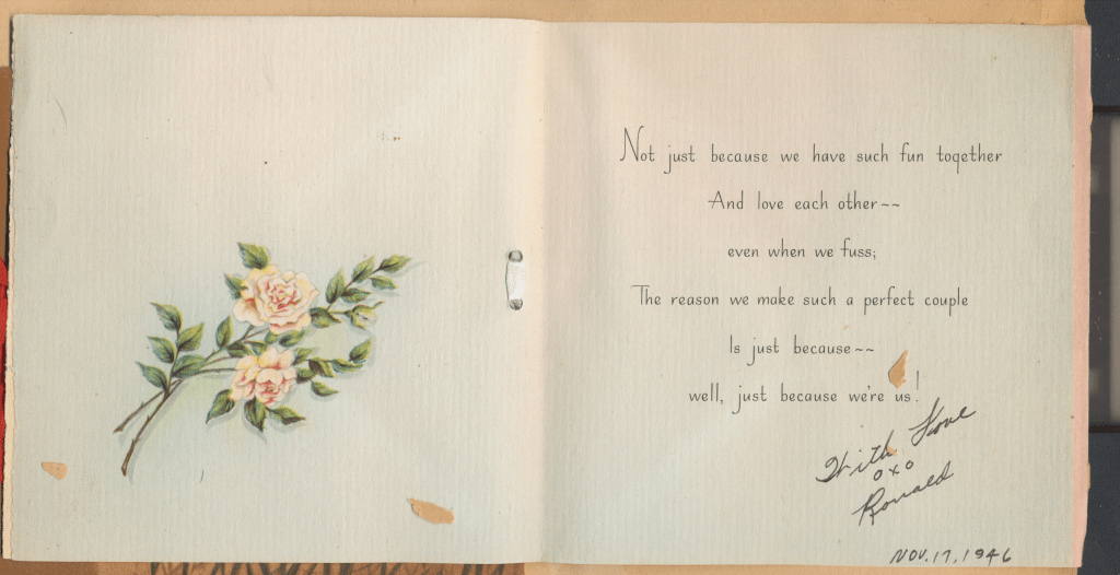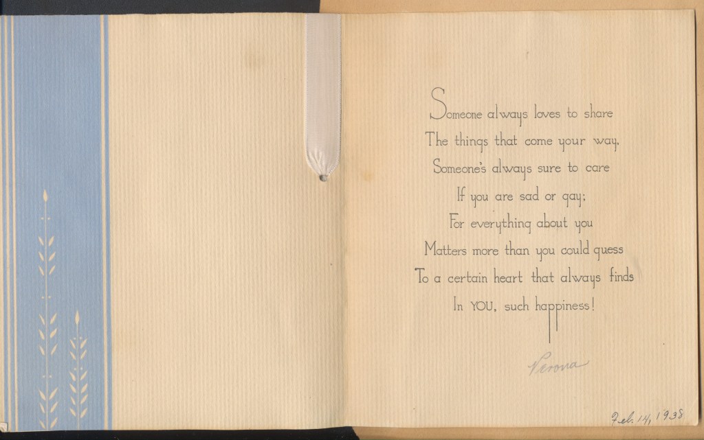 I came across the following treasure of a love story between Ronald and Verona. The cards span from 1937 to 1968. The one clue as to their last name was in a card labeled by their small son, Scott, when he put his full name as little ones do when they are learning to write. Curious, I found more information about them on familysearch.org. There, their daughter, Jan, added photos of this family giving additional life to the cards. Immerse with me as we travel in awe at their devotion to one another. Mystery still surrounds the cards such as what happened to Scott and Jan. And how did I end up with this special song of the heart.