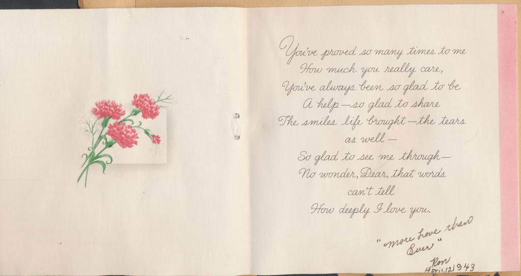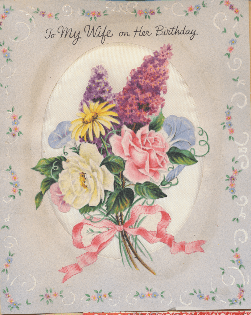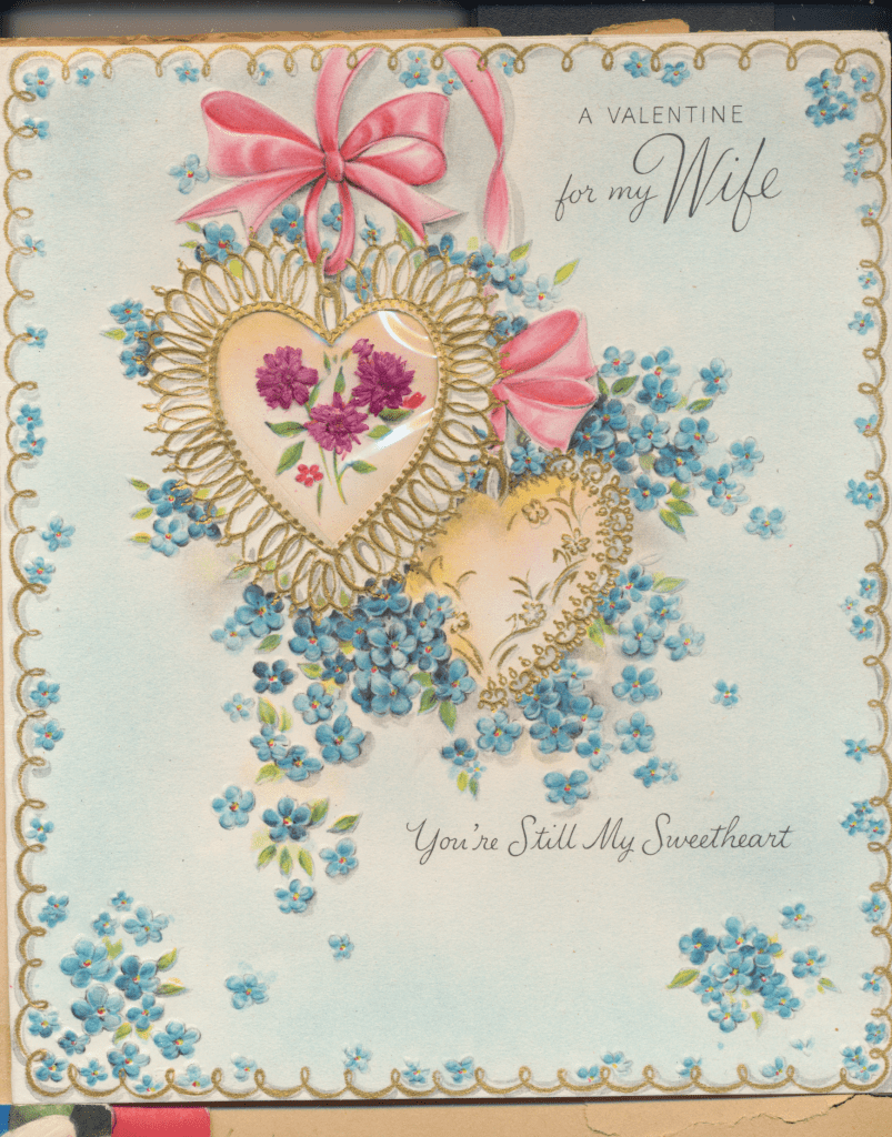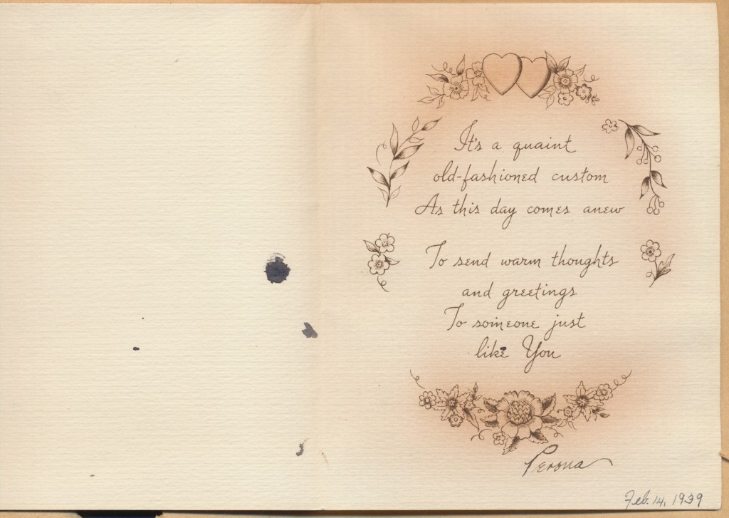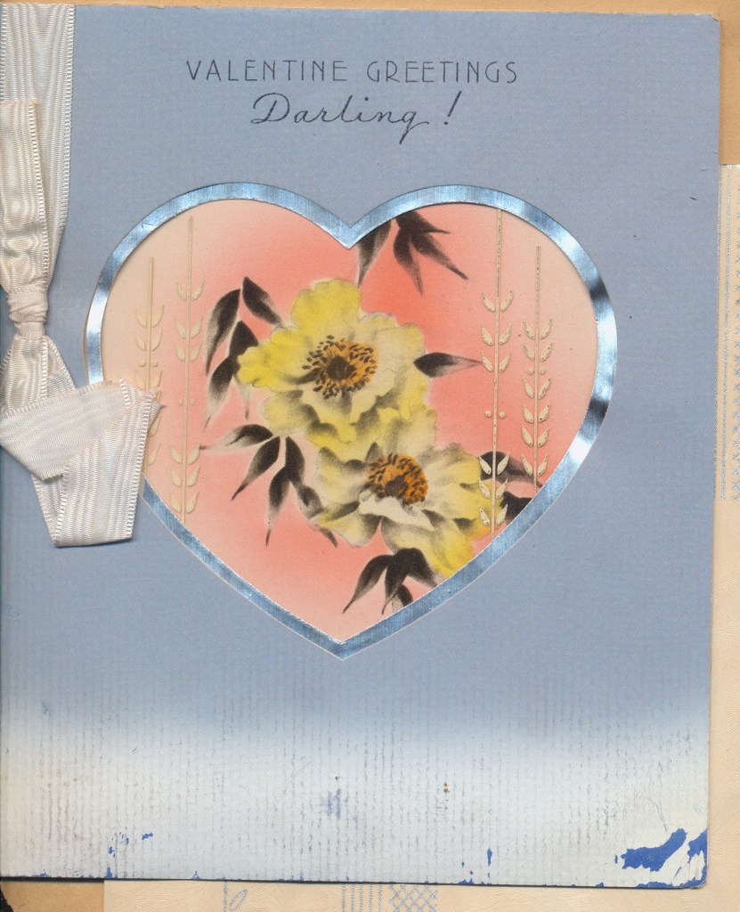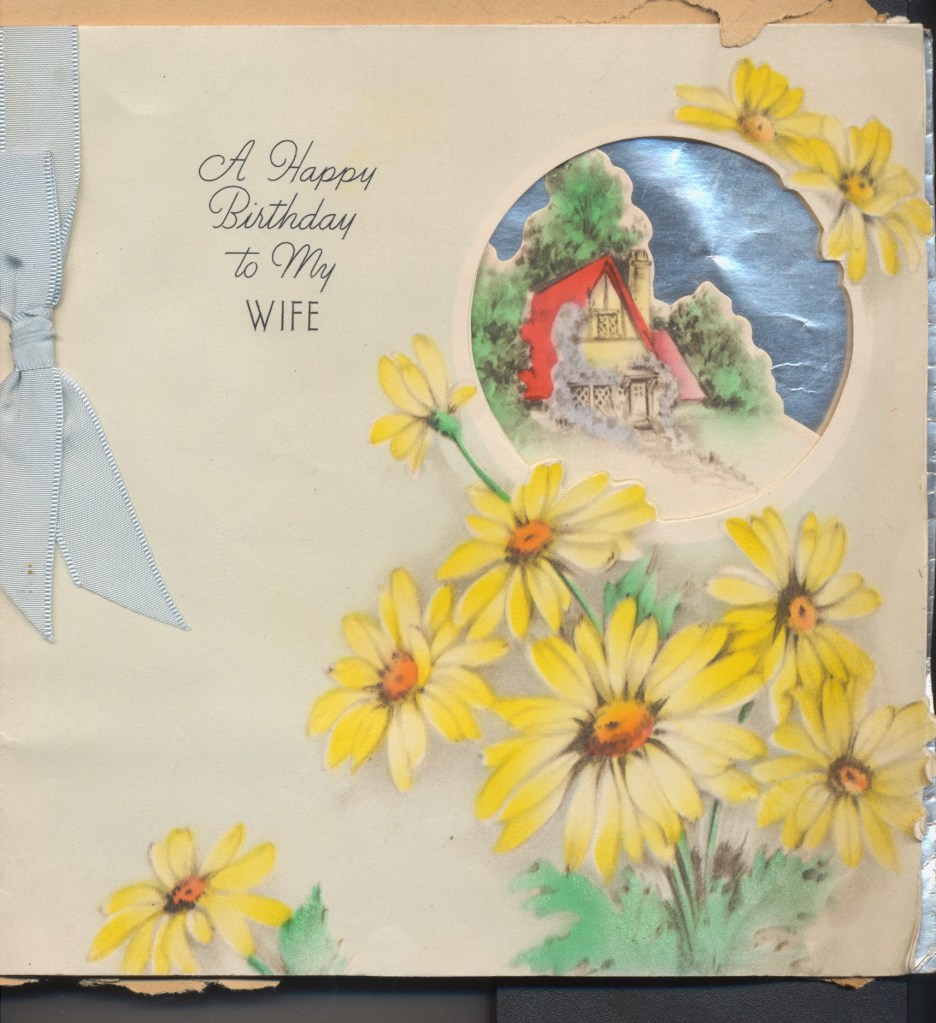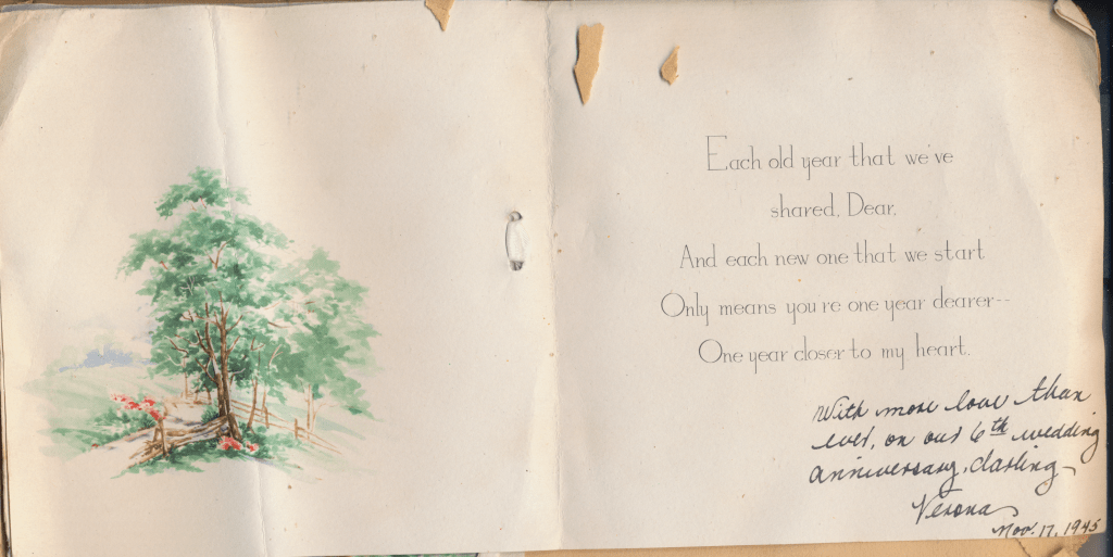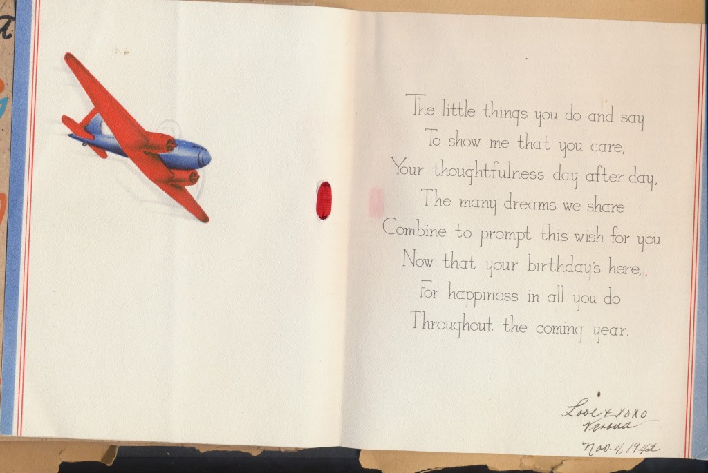 I came across the following treasure of a love story between Ronald and Verona. The cards span from 1937 to 1968. The one clue as to their last name was in a card labeled by their small son, Scott, when he put his full name as little ones do when they are learning to write. Curious, I found more information about them on familysearch.org. There, their daughter, Jan, added photos of this family giving additional life to the cards. Immerse with me as we travel in awe at their devotion to one another. Mystery still surrounds the cards such as what happened to Scott and Jan. And how did I end up with this special song of the heart.