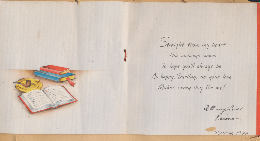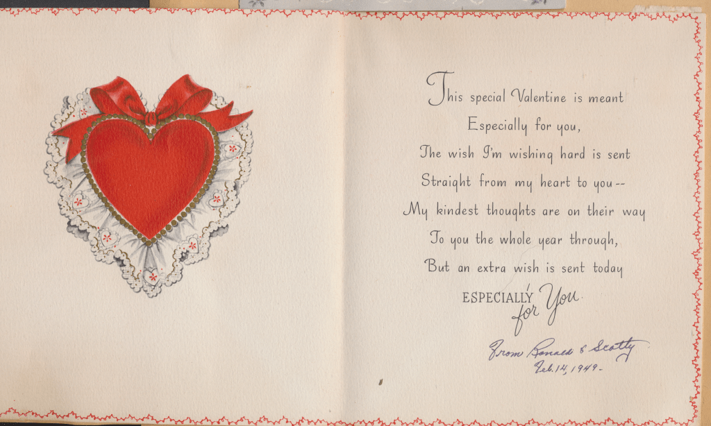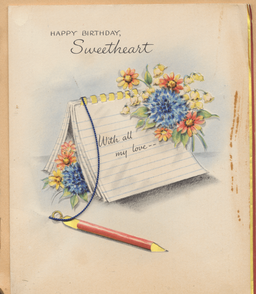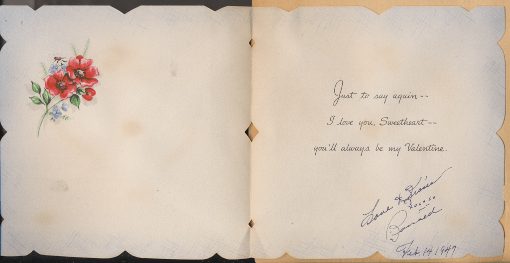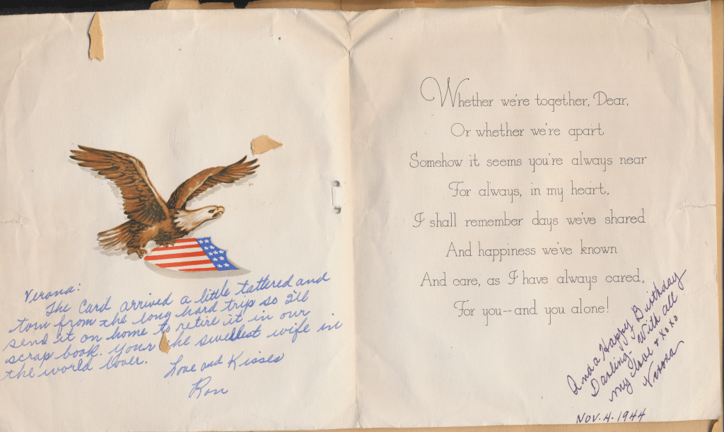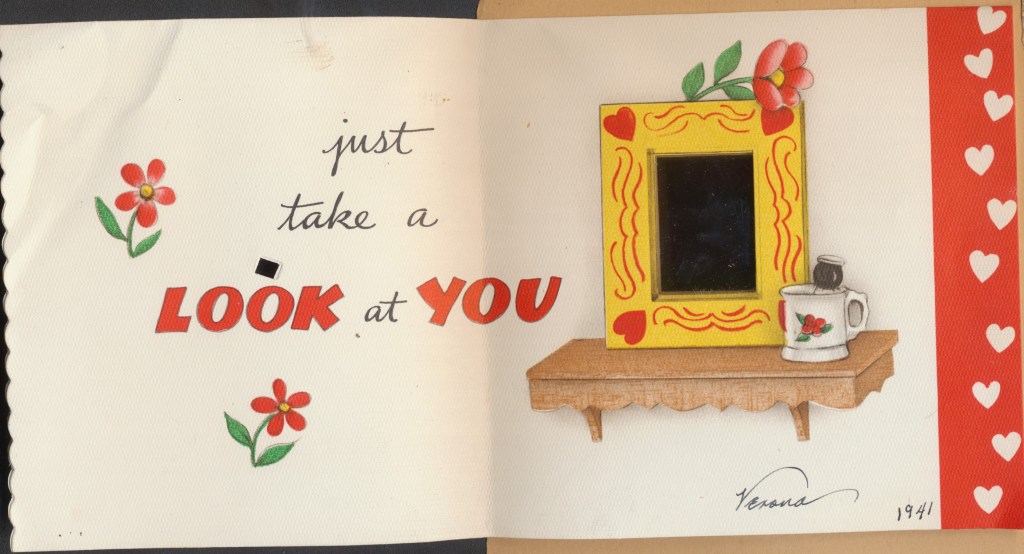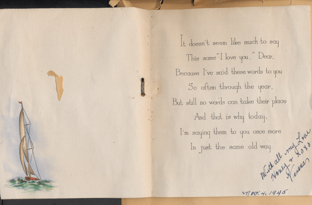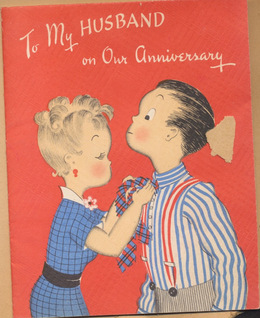 I came across the following treasure of a love story between Ronald and Verona. The cards span from 1937 to 1968. The one clue as to their last name was in a card labeled by their small son, Scott, when he put his full name as little ones do when they are learning to write. Curious, I found more information about them on familysearch.org. There, their daughter, Jan, added photos of this family giving additional life to the cards. Immerse with me as we travel in awe at their devotion to one another. Mystery still surrounds the cards such as what happened to Scott and Jan. And how did I end up with this special song of the heart.
