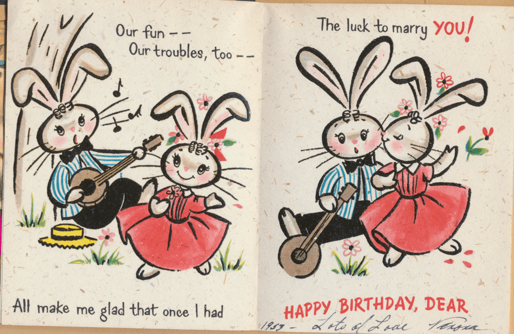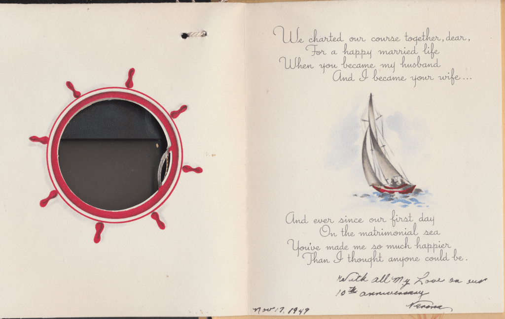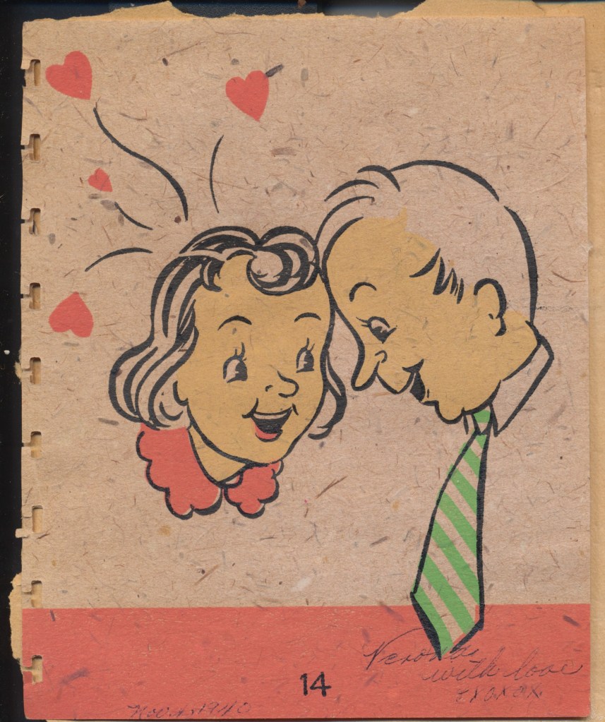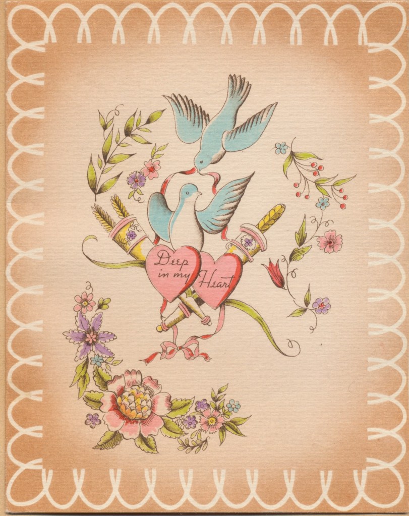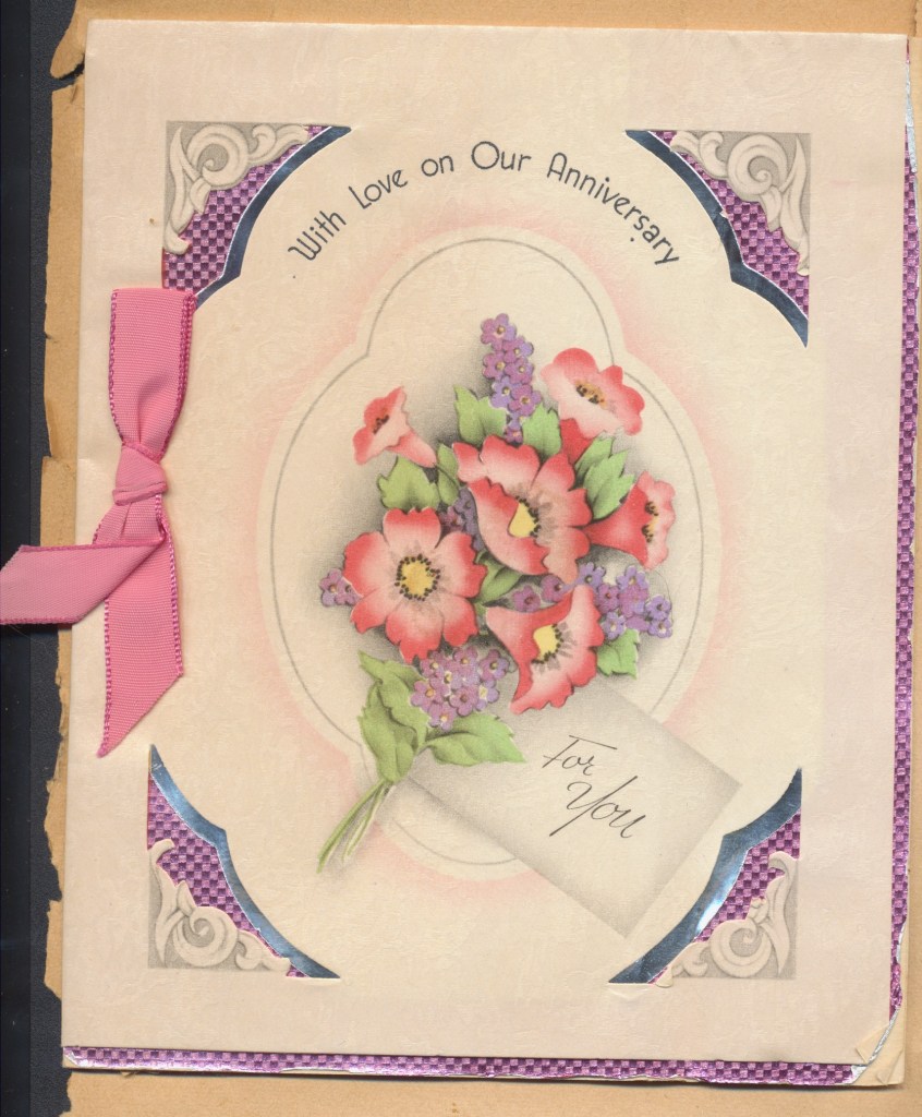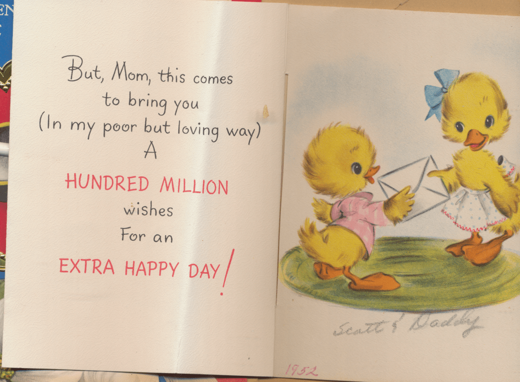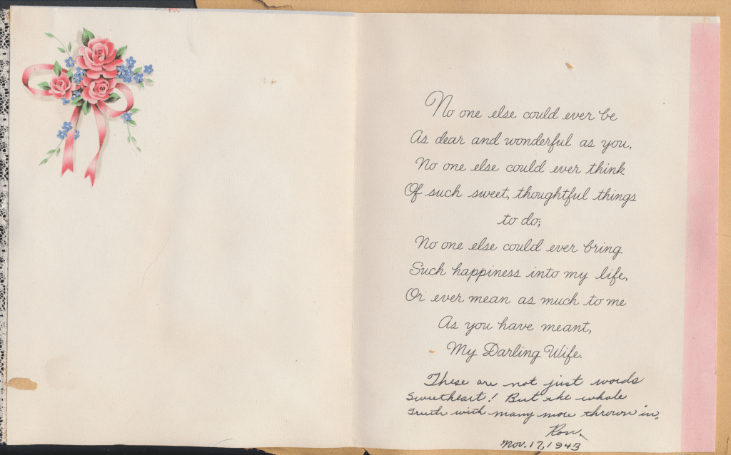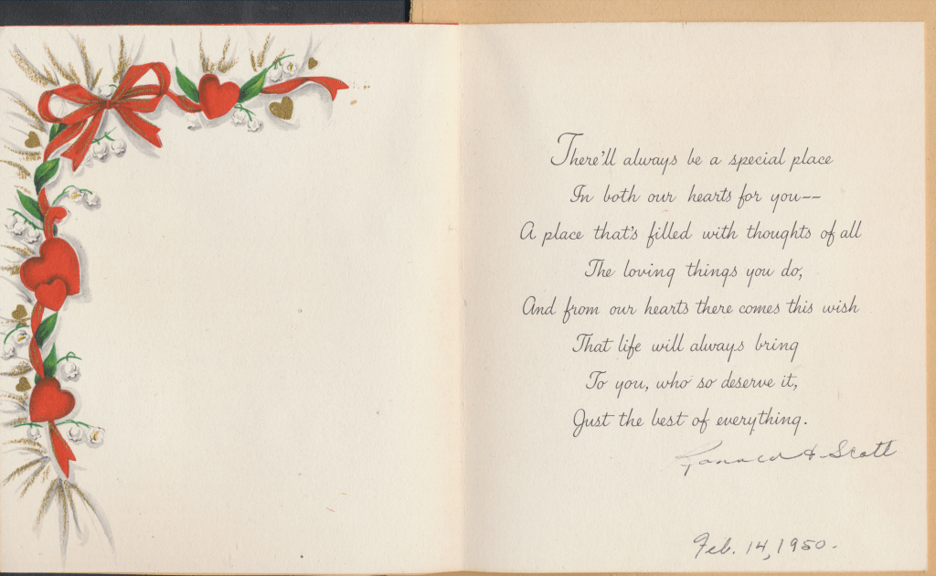 I came across the following treasure of a love story between Ronald and Verona. The cards span from 1937 to 1968. The one clue as to their last name was in a card labeled by their small son, Scott, when he put his full name as little ones do when they are learning to write. Curious, I found more information about them on familysearch.org. There, their daughter, Jan, added photos of this family giving additional life to the cards. Immerse with me as we travel in awe at their devotion to one another. Mystery still surrounds the cards such as what happened to Scott and Jan. And how did I end up with this special song of the heart.