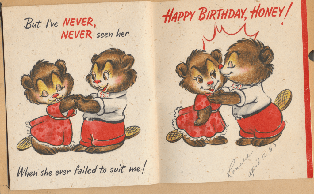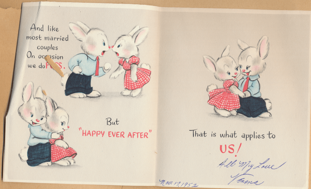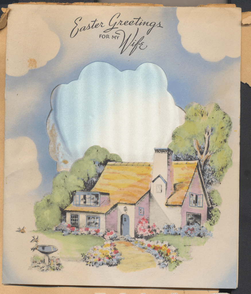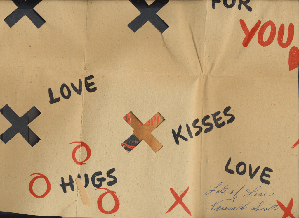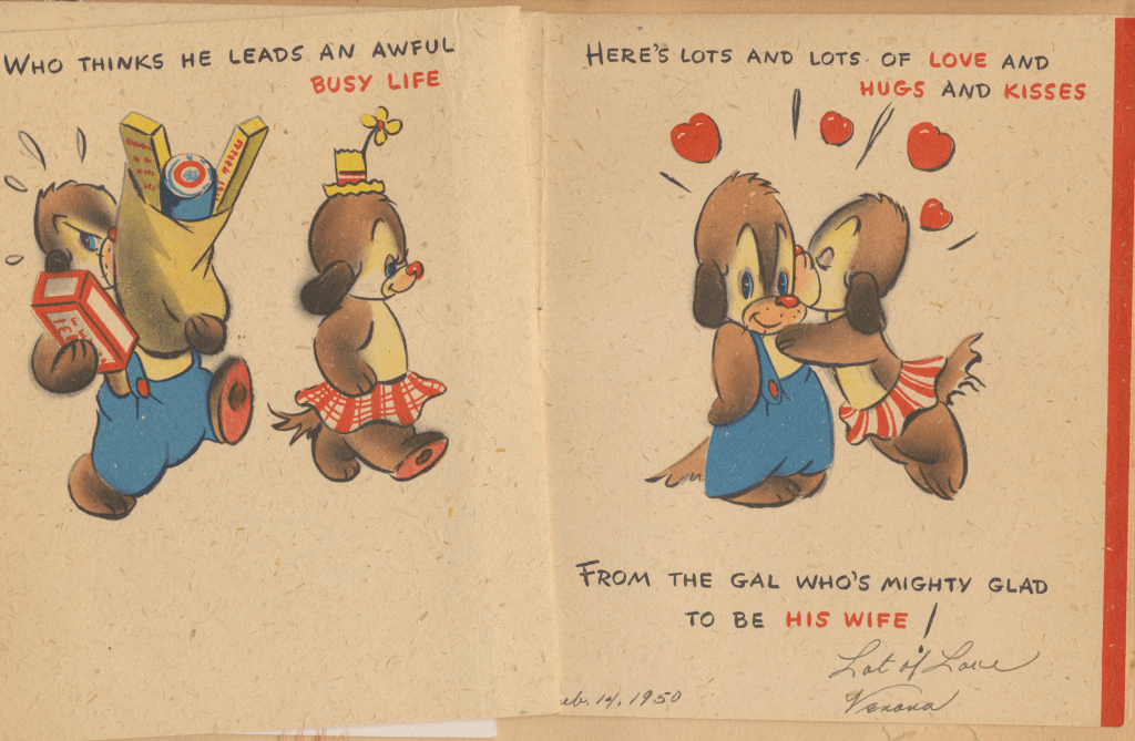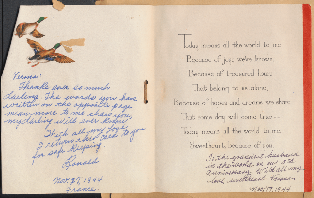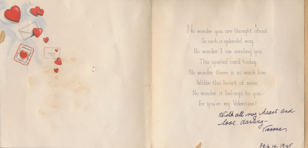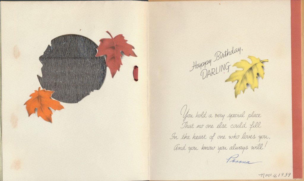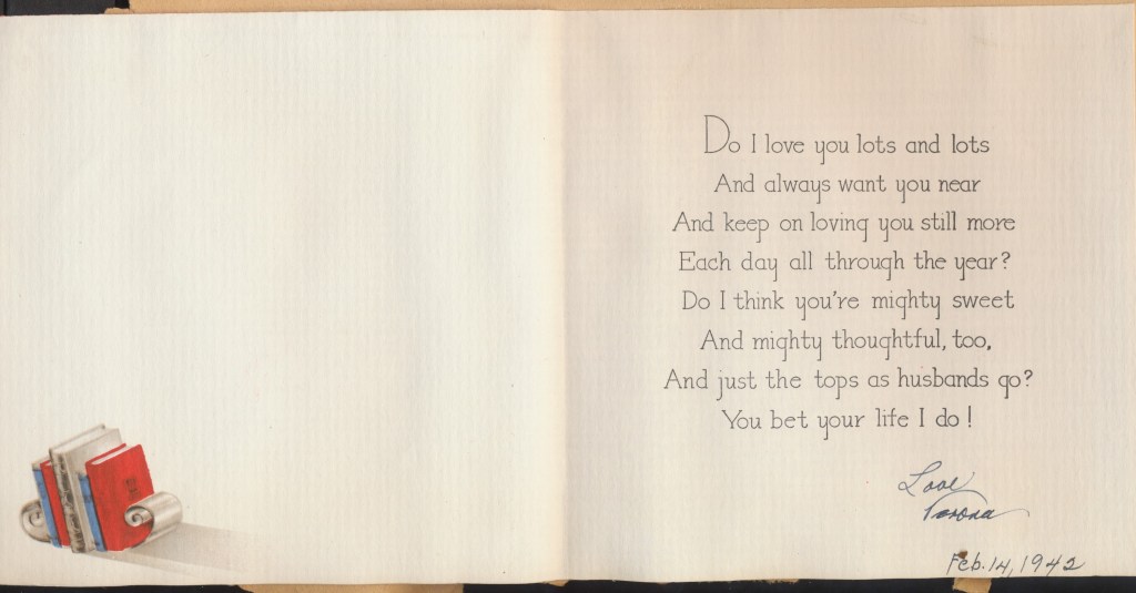 I came across the following treasure of a love story between Ronald and Verona. The cards span from 1937 to 1968. The one clue as to their last name was in a card labeled by their small son, Scott, when he put his full name as little ones do when they are learning to write. Curious, I found more information about them on familysearch.org. There, their daughter, Jan, added photos of this family giving additional life to the cards. Immerse with me as we travel in awe at their devotion to one another. Mystery still surrounds the cards such as what happened to Scott and Jan. And how did I end up with this special song of the heart.