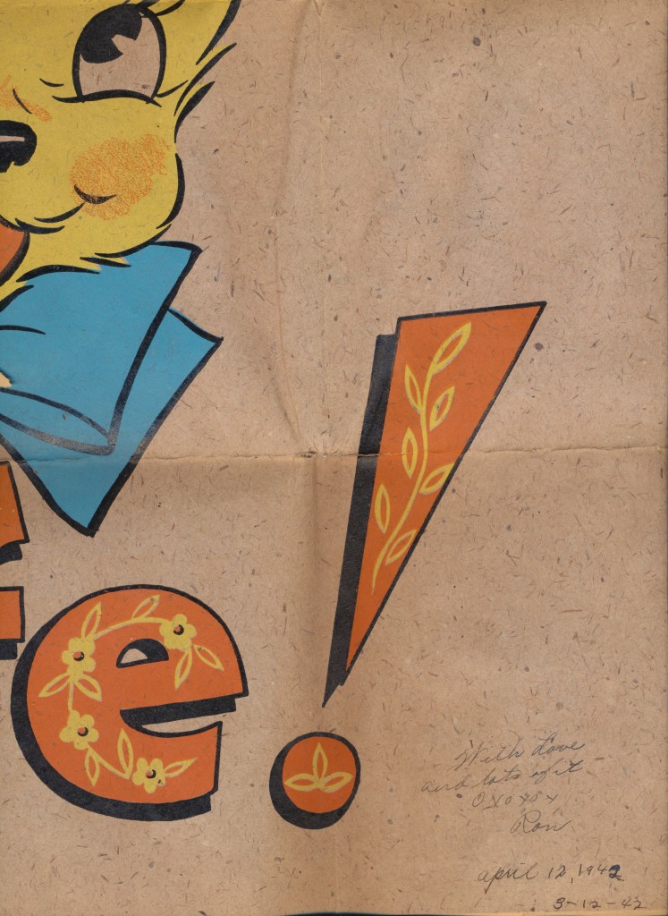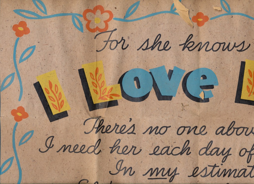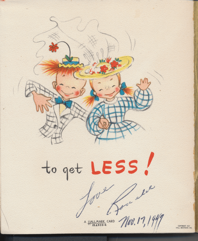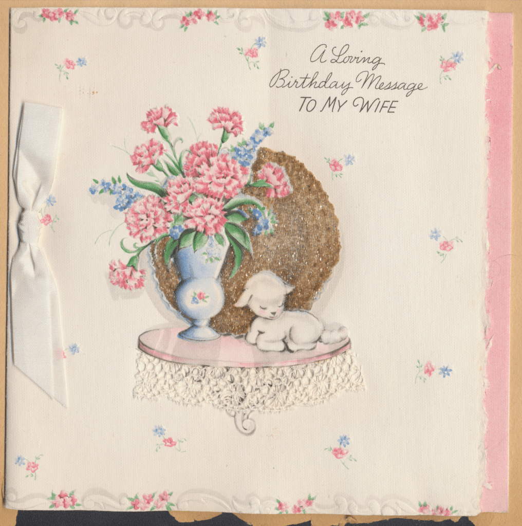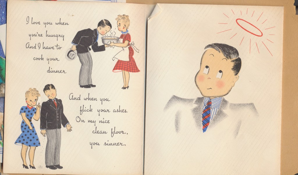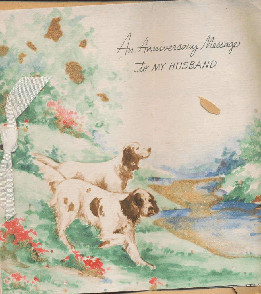 I came across the following treasure of a love story between Ronald and Verona. The cards span from 1937 to 1968. The one clue as to their last name was in a card labeled by their small son, Scott, when he put his full name as little ones do when they are learning to write. Curious, I found more information about them on familysearch.org. There, their daughter, Jan, added photos of this family giving additional life to the cards. Immerse with me as we travel in awe at their devotion to one another. Mystery still surrounds the cards such as what happened to Scott and Jan. And how did I end up with this special song of the heart.