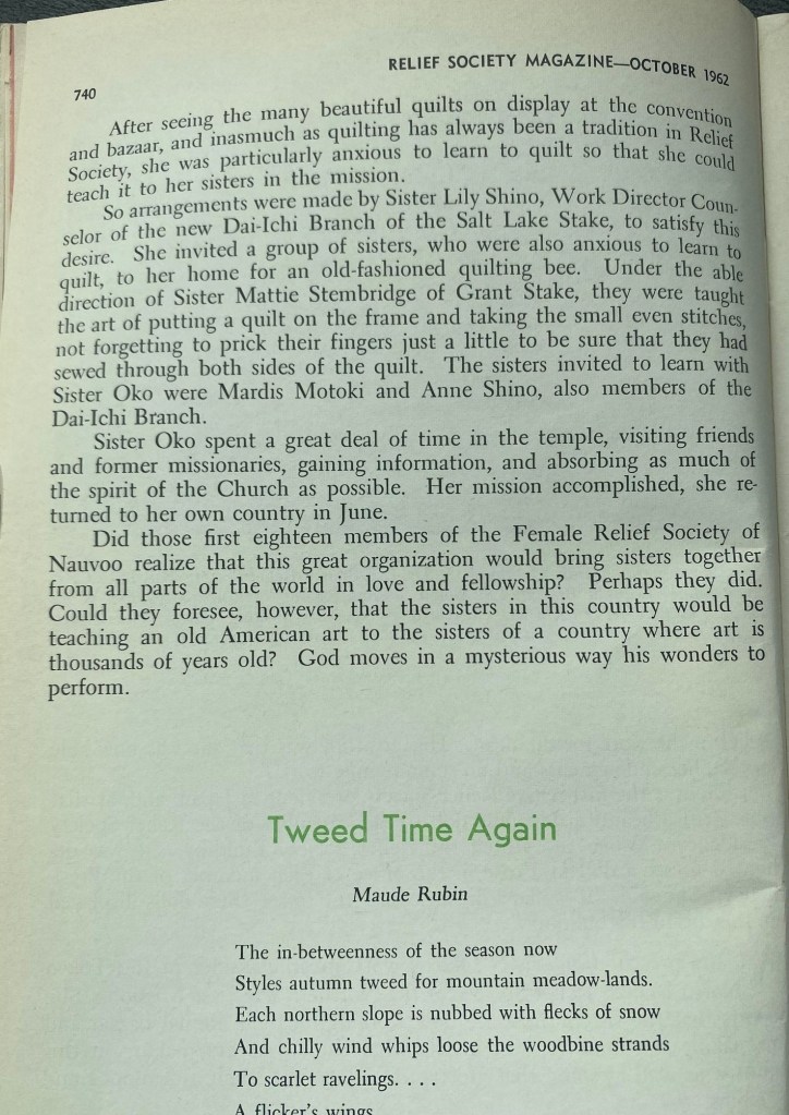 Chiyuko Oko: Hands Across a Quilt Relief Society Magazine, October 1962 Share this: Click to share on X (Opens in new window) X Like Loading...