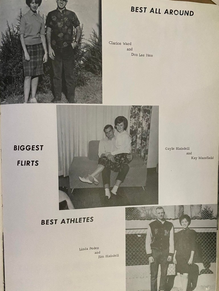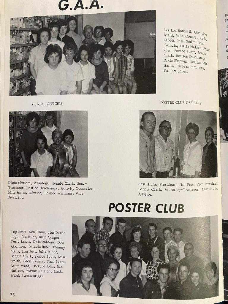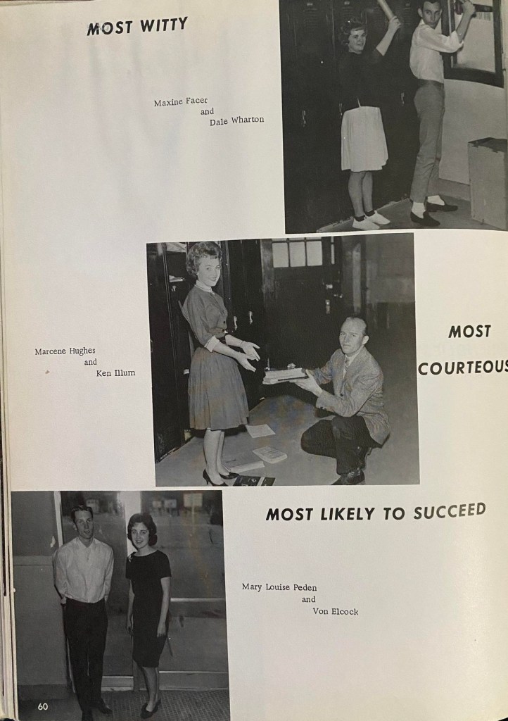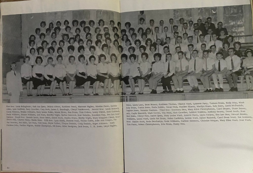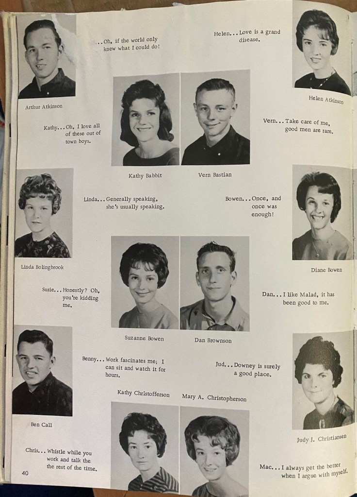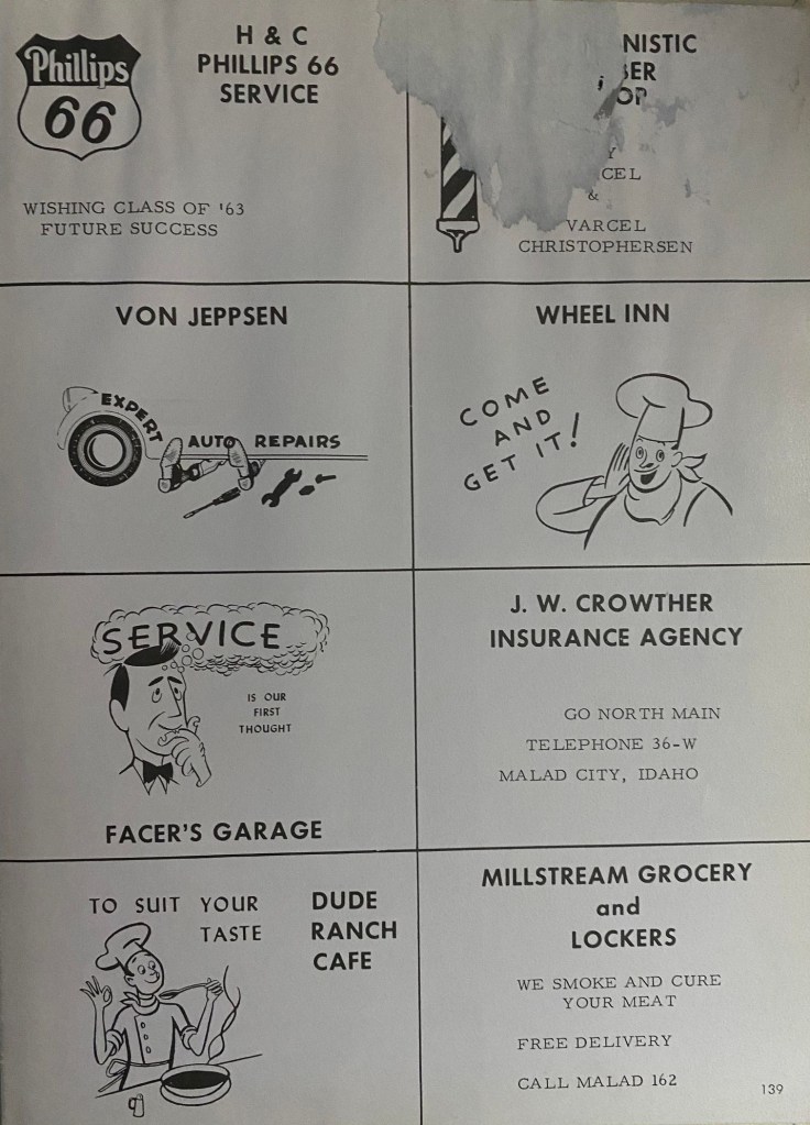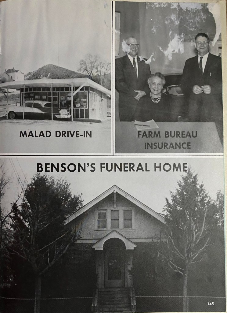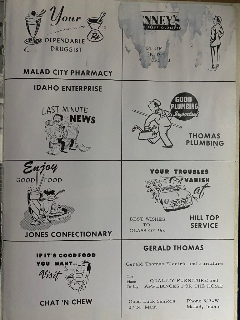 Interesting to note from the advertisements that some things are slow to change. Take the Chat and Chew Inn shorten to the Chat n Chew in the 1963 edition. It was advertised in the 1940 edition. And Evans Co-Op. Compare for yourself what others are the same. Look at the sayings from the Junior’s section. Hard to avoid laughing, such as Ben Call’s “work fascinates me; I can sit and watch it for hours.” Or, Patsy Davis, “I’m nobody’s fool, I can play the part.”