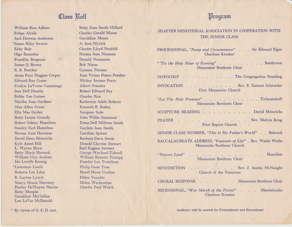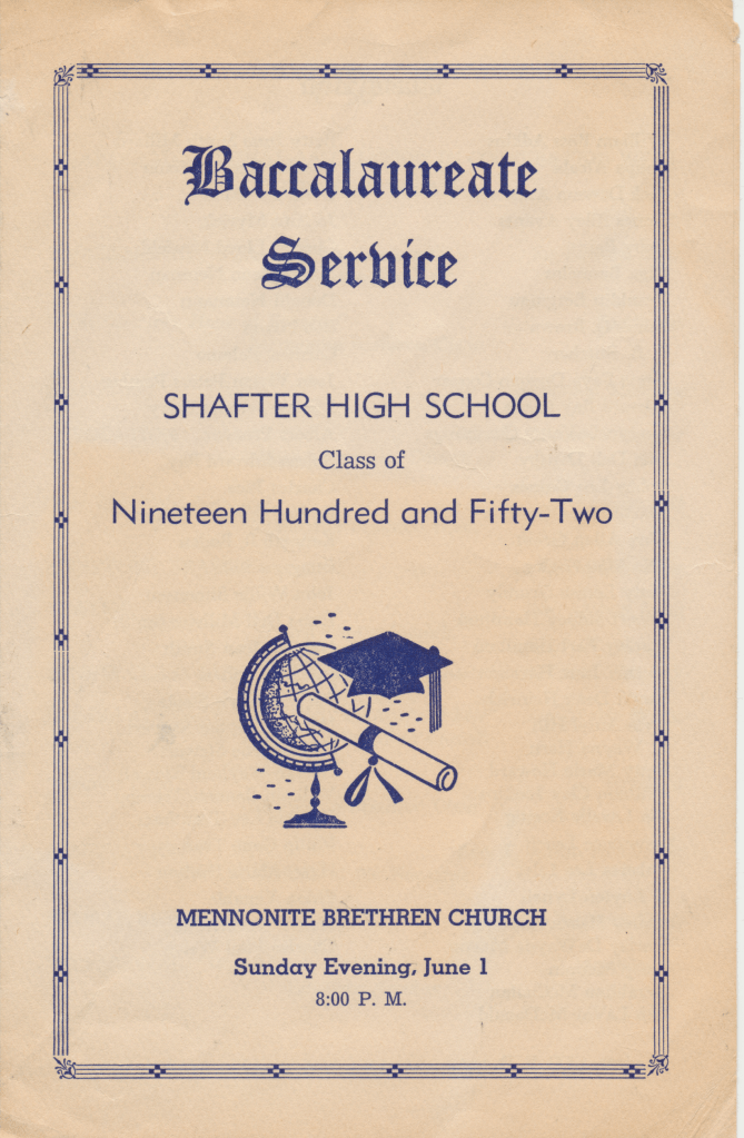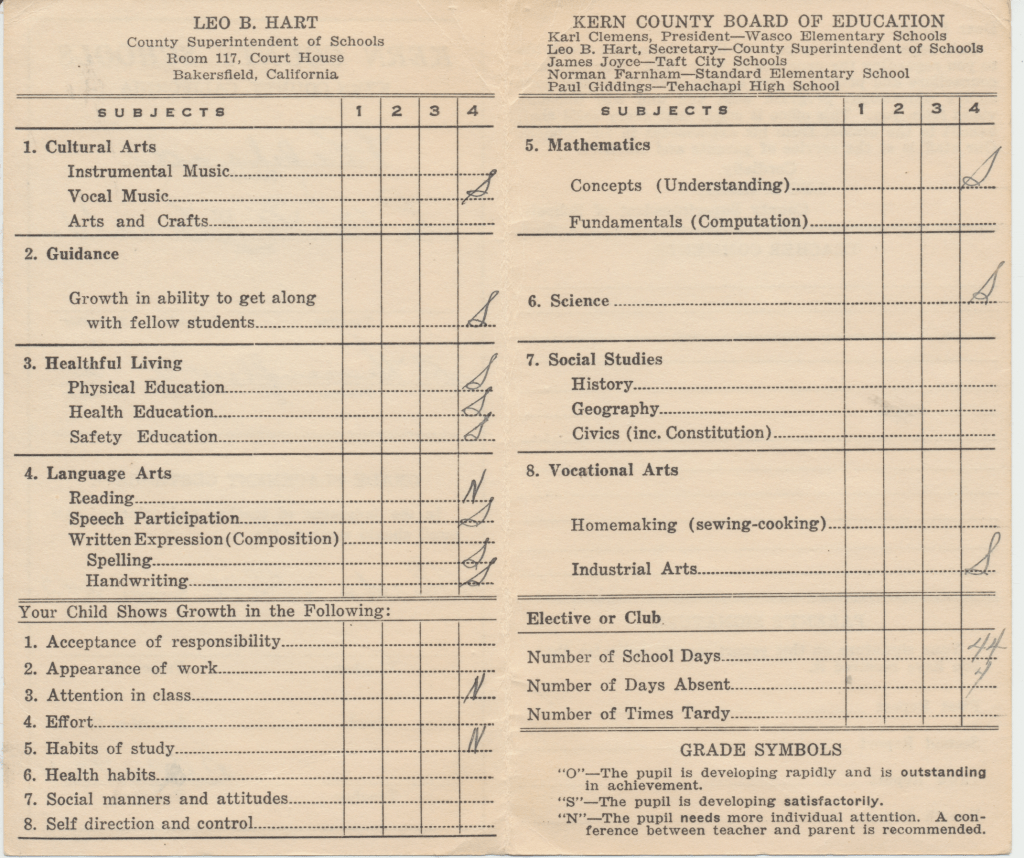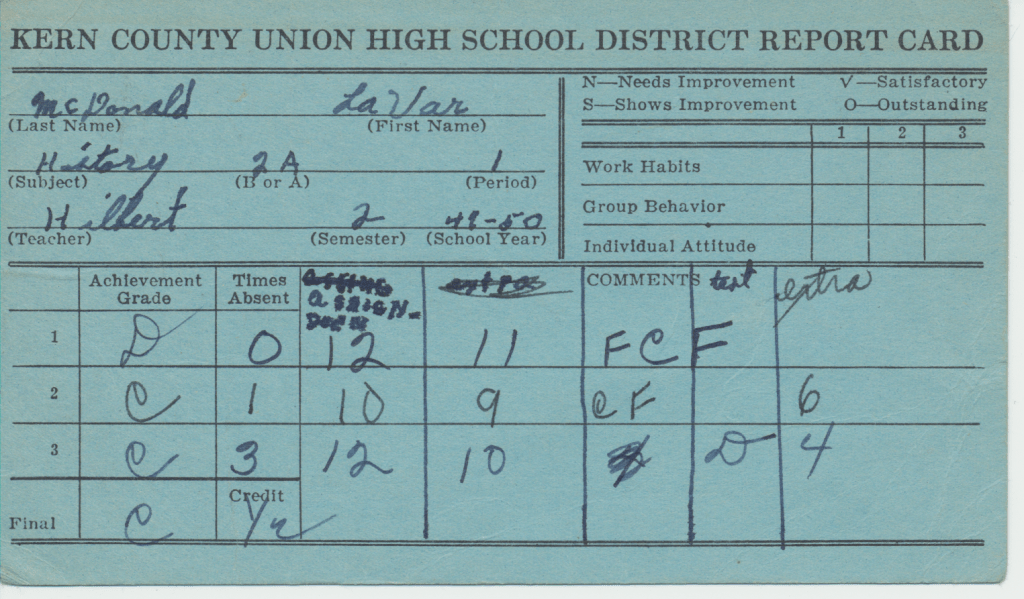 Dad: We lived in Las Vegas, Nevada. Your grandfather, I think actually the name of the town was Whitney(?), some town outside Las Vegas. Your grandfather worked at a magnesium plant. They used magnesium metal during the war. Him and you uncles worked there. Then we moved back to Shafter and we, every time we went back to Shafter we’d live in these Labor Camps, they’re just these little small shacks with outside toilets for everybody and dirt floors, real crude.