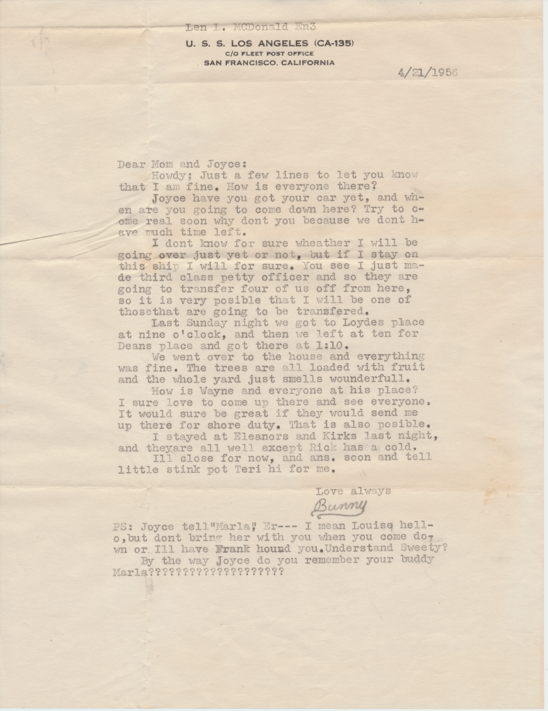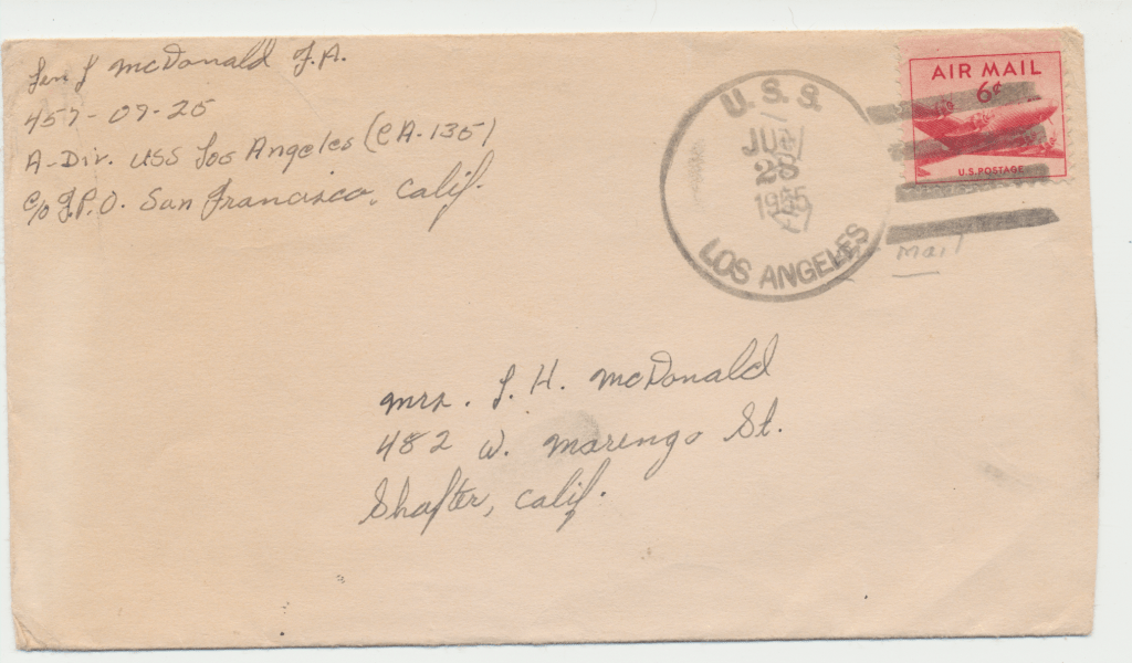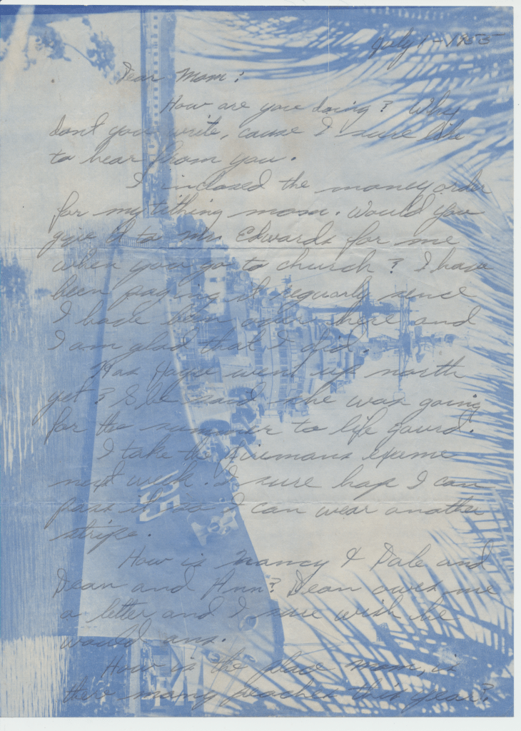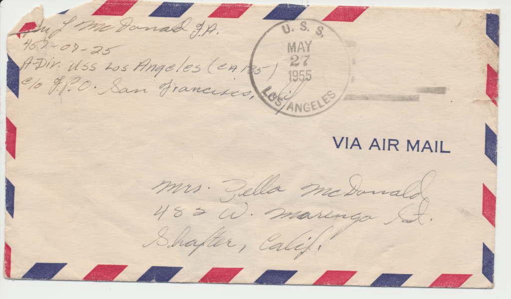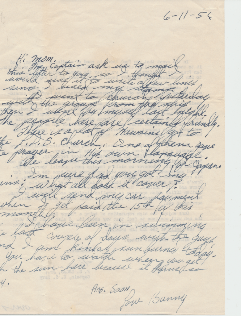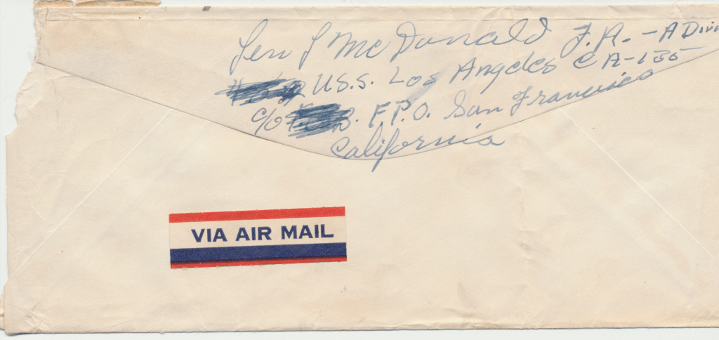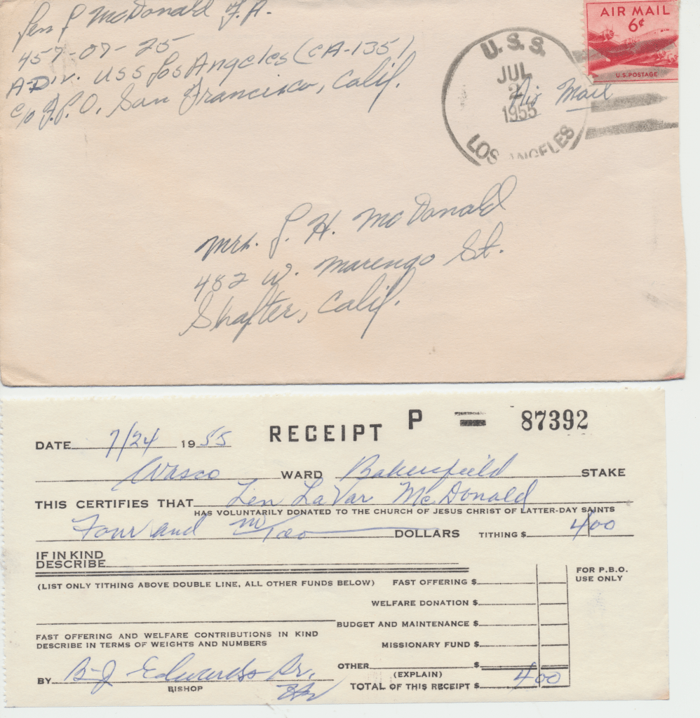 Bunny’s ship, USS Los Angeles. He was in the Navy from 1954 – 1958. This first scene is of the two ships fueling. In letters to his mom, he begged her to talk to the Red Cross about getting him out of the Navy. He hated it, saying, “it was no place for and L.D.S. boy.” He said the guys smoked and drank once on shore. An example of how faithful he was to his religion is in a letter directing $4.00 to go towards his tithing. The receipt still exists.