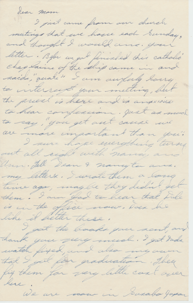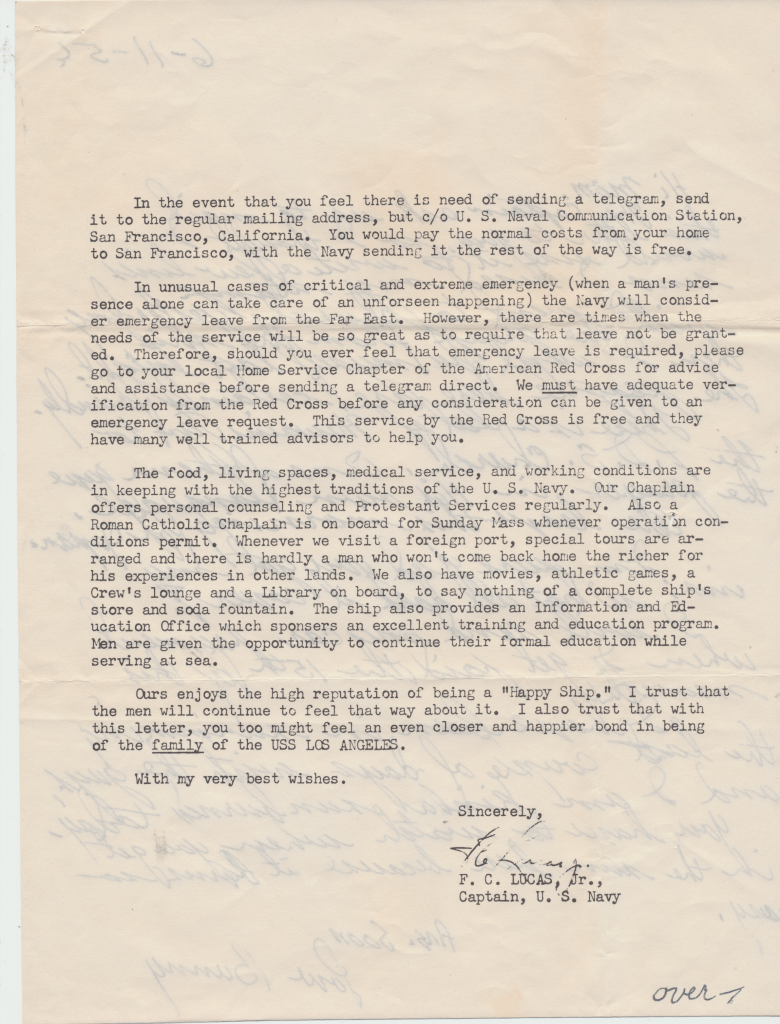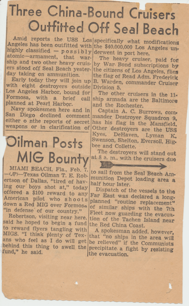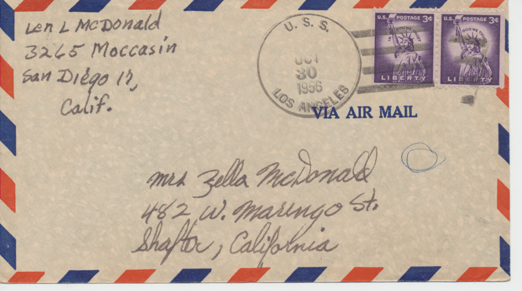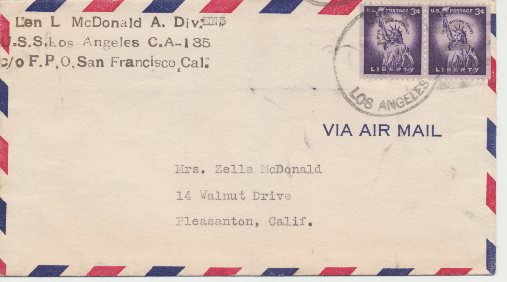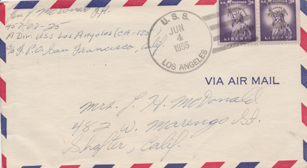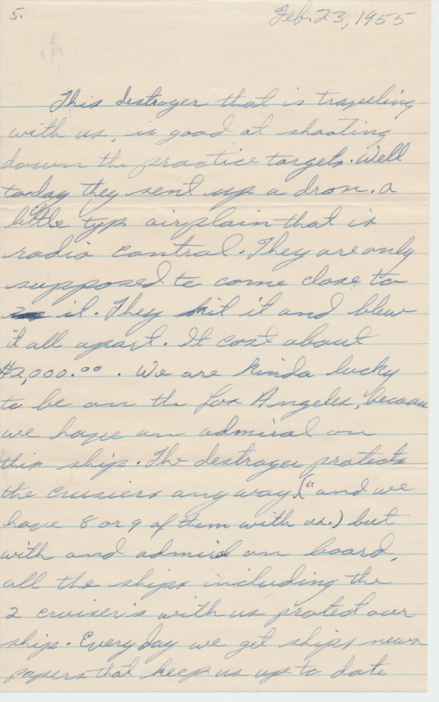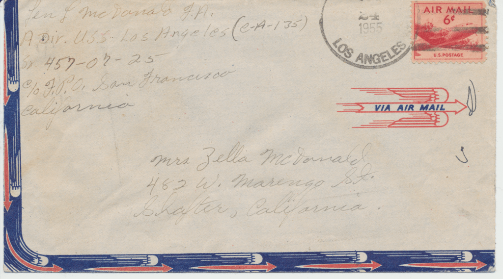 Bunny’s ship, USS Los Angeles. He was in the Navy from 1954 – 1958. This first scene is of the two ships fueling. In letters to his mom, he begged her to talk to the Red Cross about getting him out of the Navy. He hated it, saying, “it was no place for and L.D.S. boy.” He said the guys smoked and drank once on shore. An example of how faithful he was to his religion is in a letter directing $4.00 to go towards his tithing. The receipt still exists.