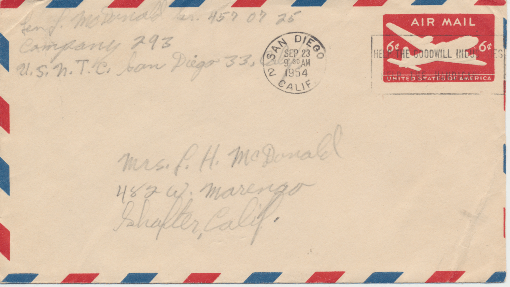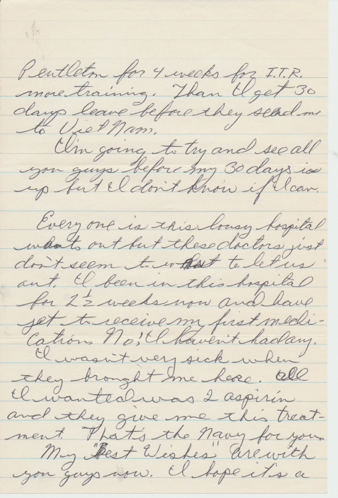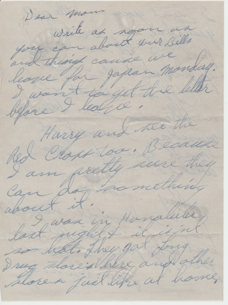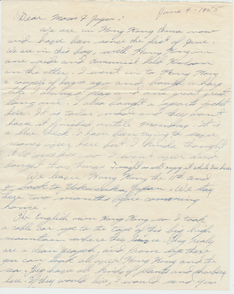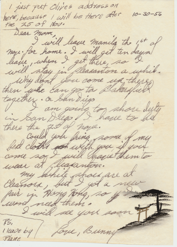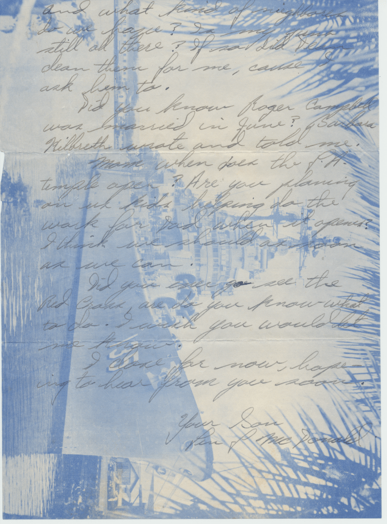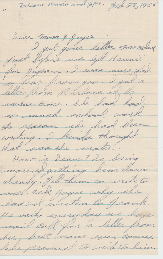 Bunny’s ship, USS Los Angeles. He was in the Navy from 1954 – 1958. This first scene is of the two ships fueling. In letters to his mom, he begged her to talk to the Red Cross about getting him out of the Navy. He hated it, saying, “it was no place for and L.D.S. boy.” He said the guys smoked and drank once on shore. An example of how faithful he was to his religion is in a letter directing $4.00 to go towards his tithing. The receipt still exists.