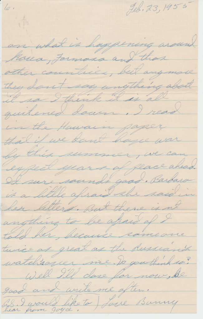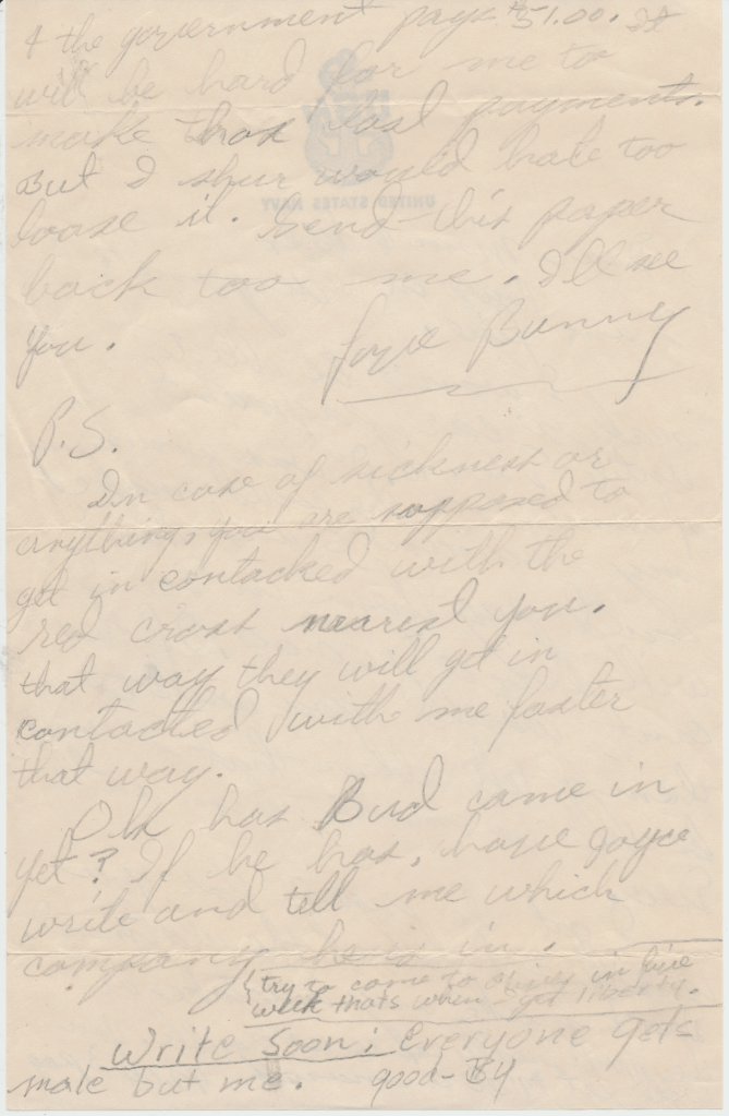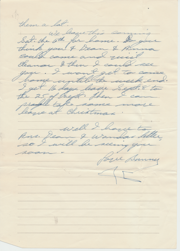 Dad: Yeah, during the war if you went to sleep on guard duty you were shot and killed. That the rule. Homer, I guess hadn’t slept for 2 nights, a long time, I don’t know how long it was, but I guess it was Admiral Hulsey came on their ship to have a meeting and Homer was standing outside their door guarding it and he went to sleep. Just lucky his friend came out before Admiral Hulsey did and woke him up after the meeting they came out of the hatch and his friend woke him up. So that stopped him from getting into trouble.