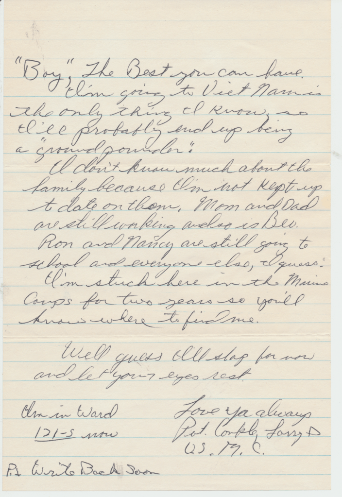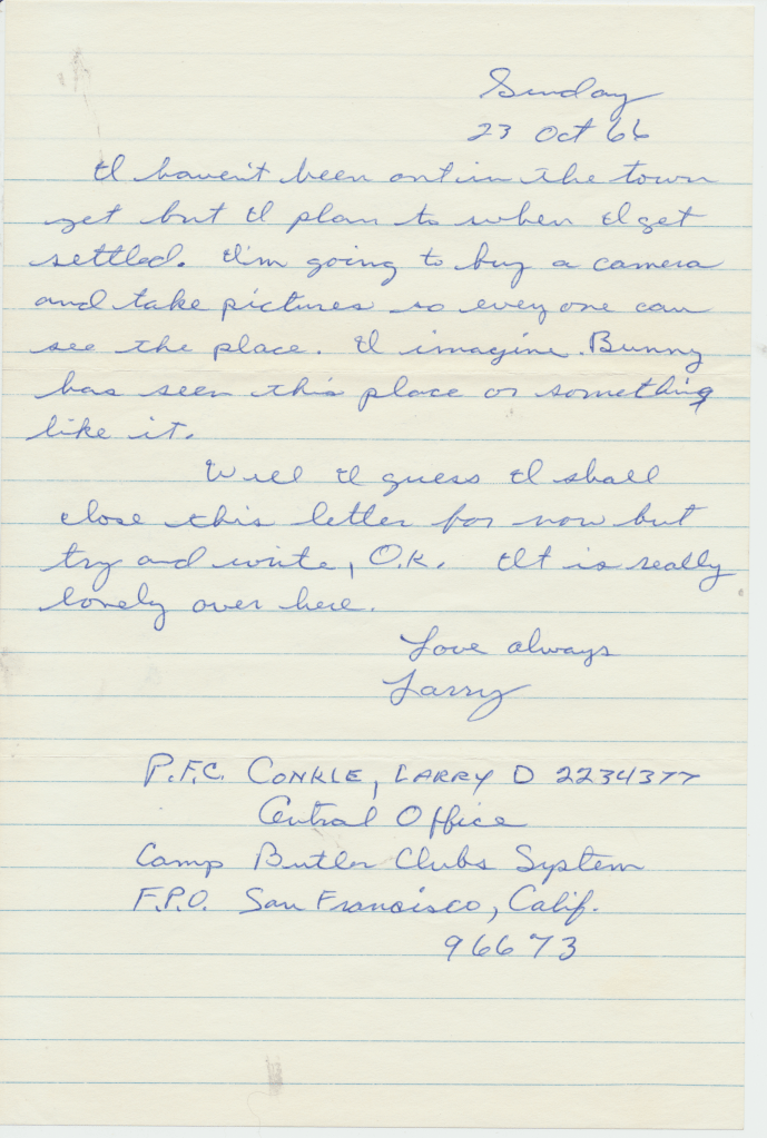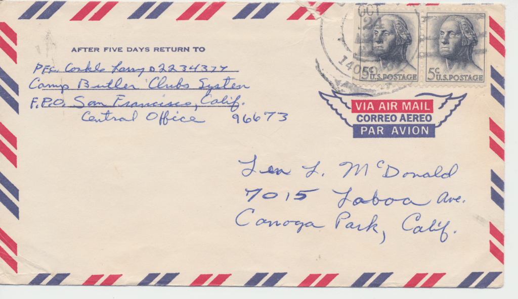 Olive McDonald Conkle’s kids. She was Bunny’s older sister and married to Paul Conkle. They lived in San Diego, California. Ronnie who born November 28, 1944, Nancy Carol is the one with the glasses and was born October 18, 1948, Larry who was born January 20, 1946, Beverly who was born June 2, 1947 is facing towards the ocean, and Randy who was born April 14, 1953. Larry would later serve in the Viet Nam War, including one of the worst battles, The Tet Offense. He tells of having his picture taken in the Commissary before being shipped off to battle and sending the pictures to his mom so that she would think he was working in the Commissary rather than fighting in actual battles. Apparently he never told her the truth. He did not want her to worry.