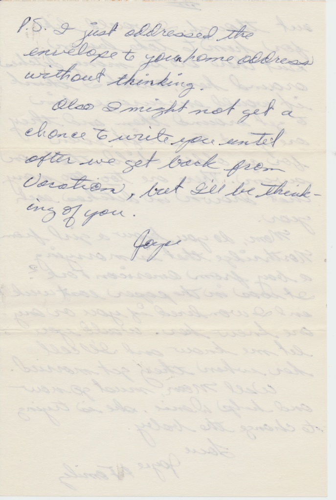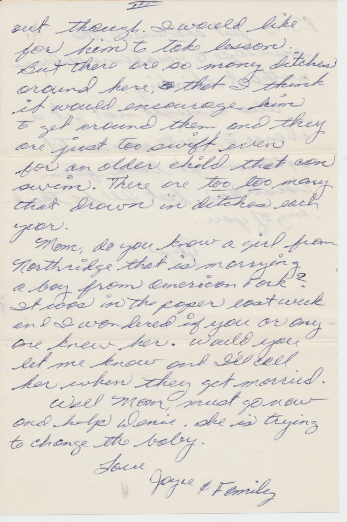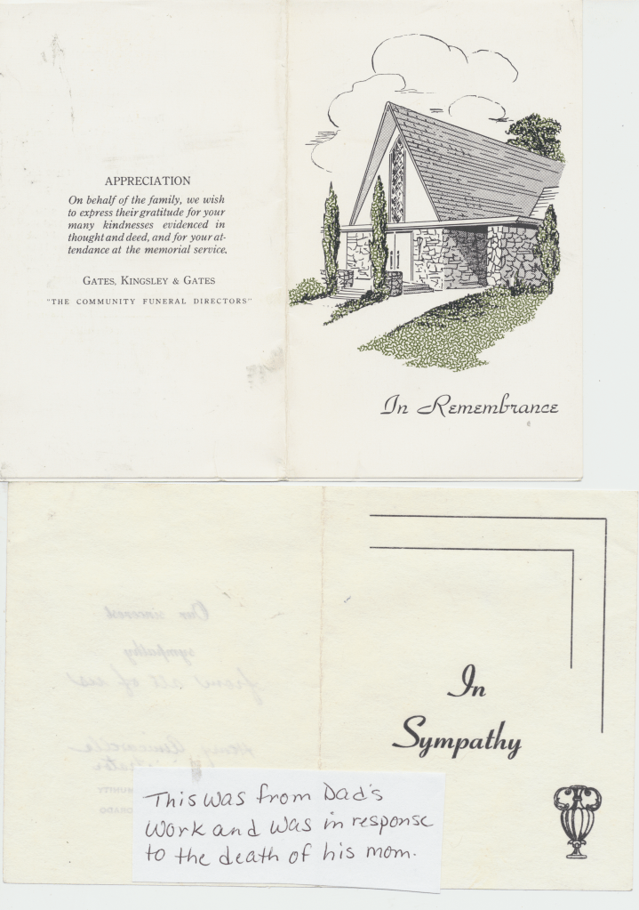 Dad: It’s just we knew the Robinson’s. They ran the funeral home. Your Aunt Joyce and I were always playing the piano together. We went by Clyde and Eulalia’s. They were the ones that ran the funeral home. So went by ta visit em and uh we wanted to play the organ and Joyce was scared to death of dead bodies and so Clyde whispered to me that there was one on the other side of the organ but we didn’t tell Joyce. So we went in there and we were playing popular tunes on the organ and having a big time. I never did tell her that this dead body was right on the other side of the divider between the organ and the dead body. Then she found out later and Eulalia, I think so, scared the heck out of her. But were playing boogies, ya know, shouldn’t of been played in a funeral home.
