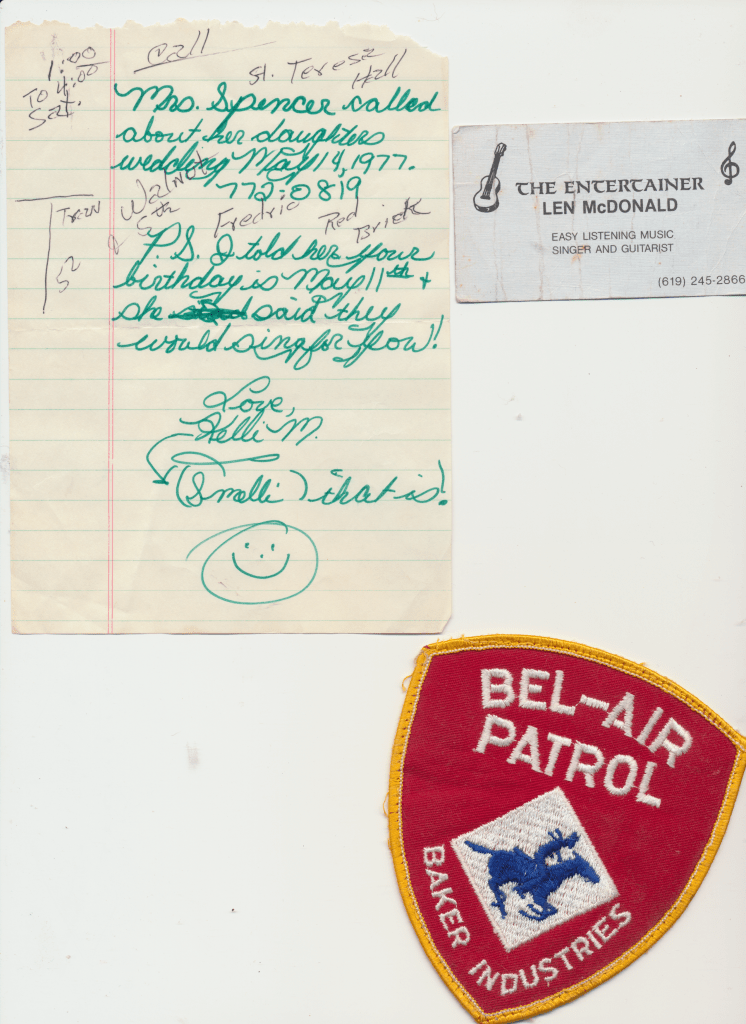 Len & Vicki’s honeymoon in Wrightwood, California. They were married September 15, 1962. Vicki’s 1st boyfriend was Eric Frischlaucher. His family had a cabin in Wrightwood. Both Vicki & Len tell the story from two different states (California & Utah) about how the guy in the adjoining unit was listening. They were both sick. Len sat in the rocking chair making it creek. They could hear the guy next door listening. So, Len put the chair next to the wall & purposely made it squeak!