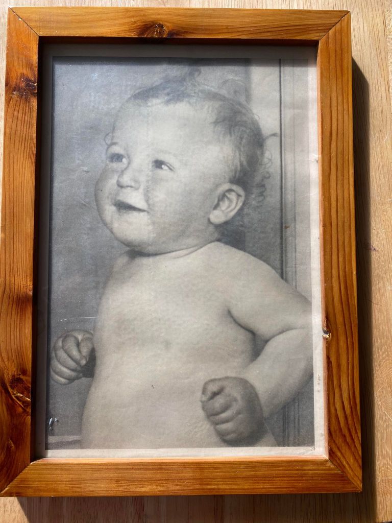 This picture is confusing. On the surface it looks as if it is a sweet picture of someone’s baby, which it, of course, it is. However, take off the back cover…and it is a magazine picture! A very old magazine picture. Why, then, would this be framed as it is in the following photo other than to try to sell the frame?