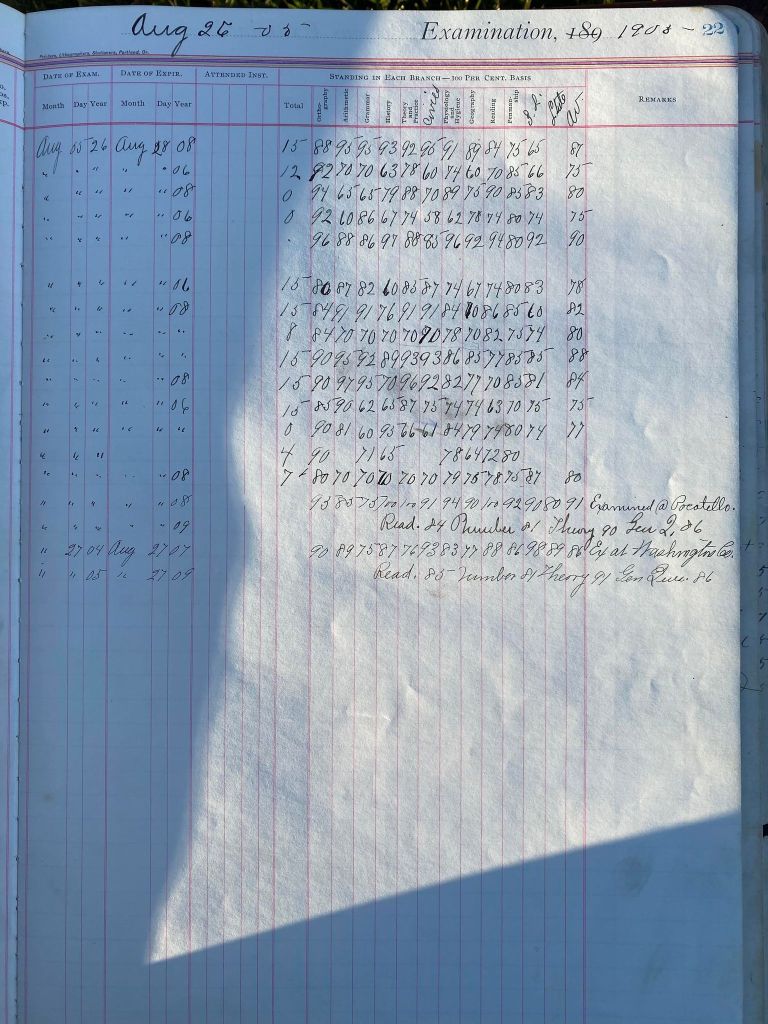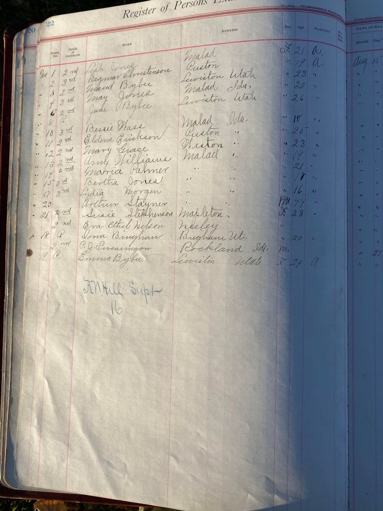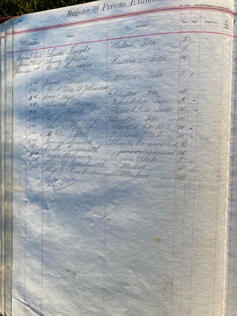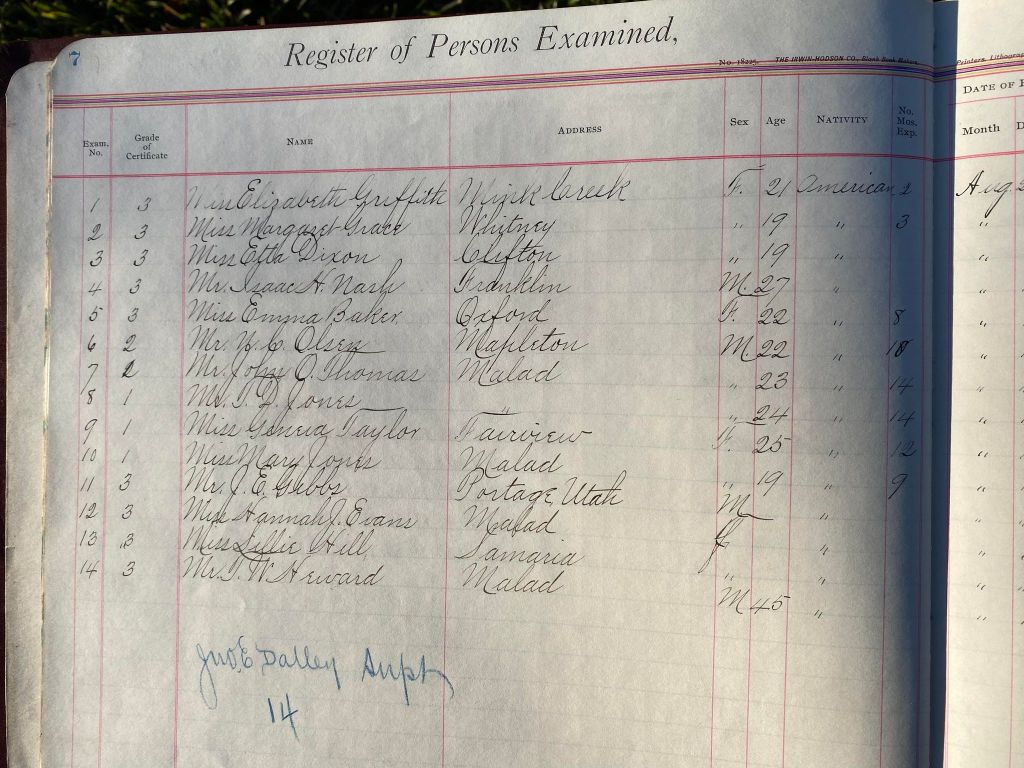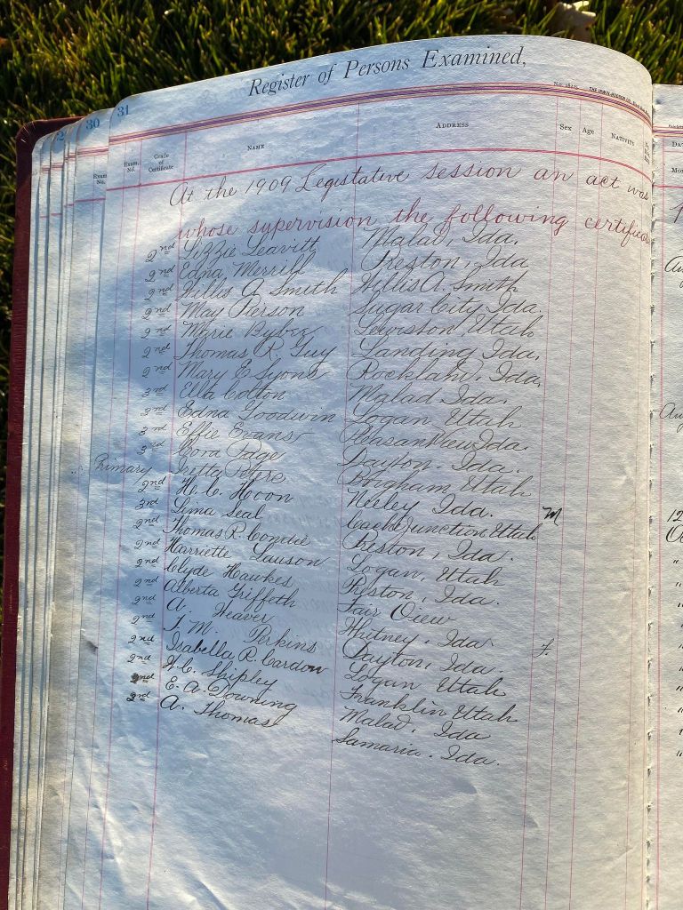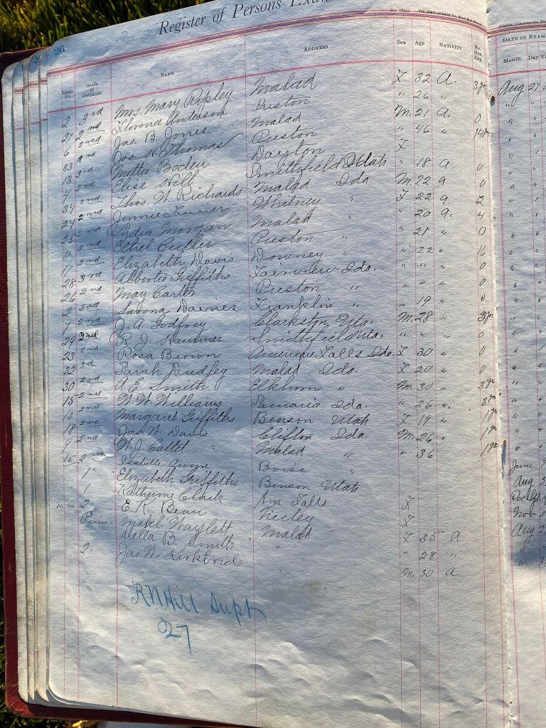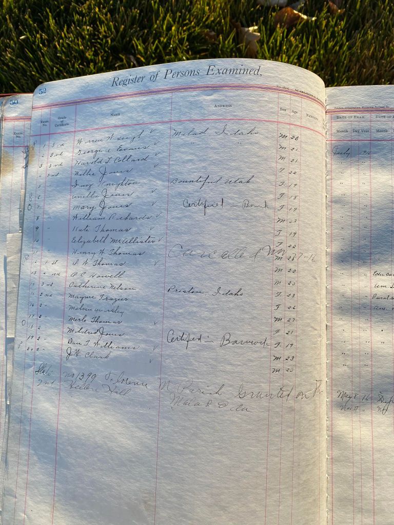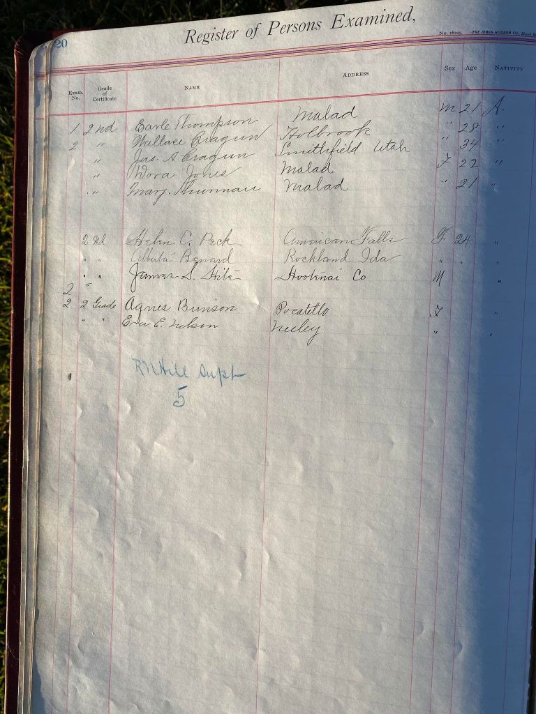 This is exciting information that was found at the old Malad High School before it was torn down. It has the teacher’s examination scores with information including: Name, Grade of Certificate, Address, Gender, Age, Nativity, Number of Months Experience, Date of Exam, Date of Expiration, Standing in Each Branch-100 Per Cent. Basis. At one point I thought that I could feel the presence of at least 2 women and 1 man while working on the dates between 1901 and 1905. It seemed that I could even discern the clothing they were wearing. This was in the evening while my children were in the room being overly silly.