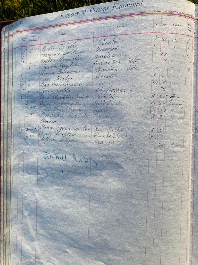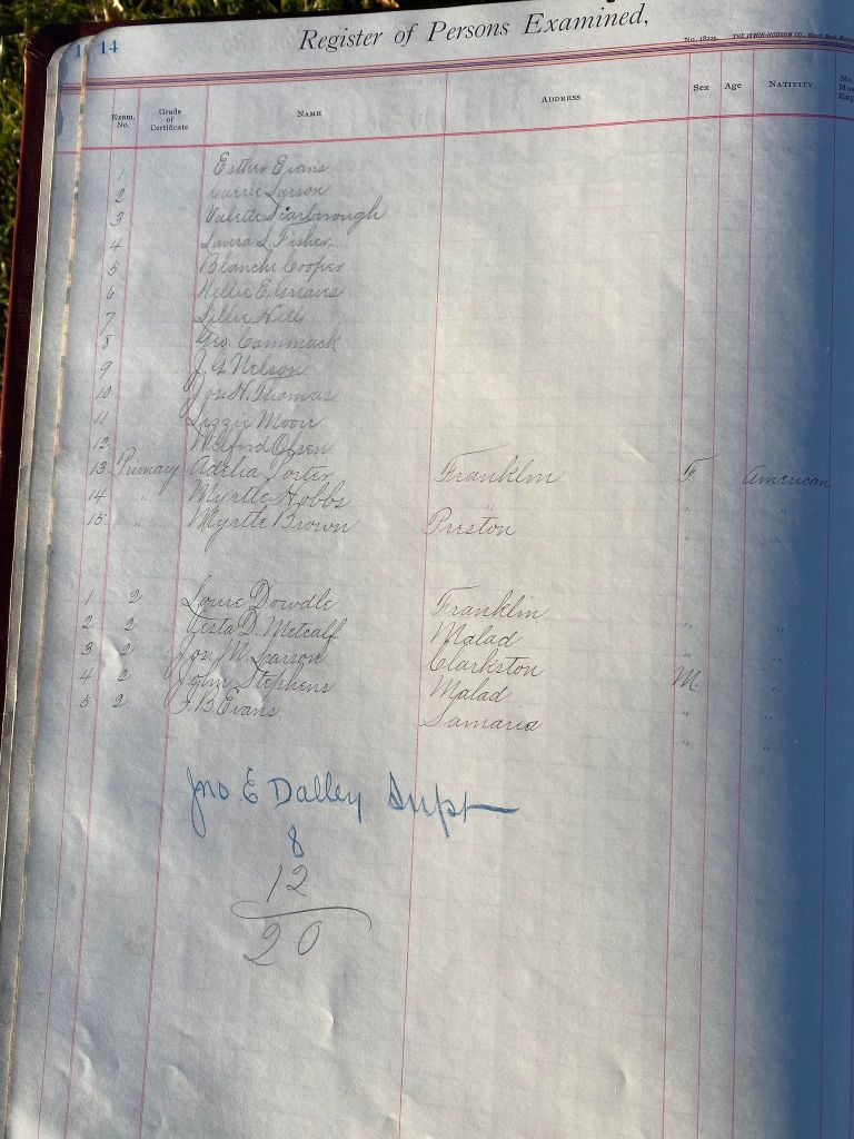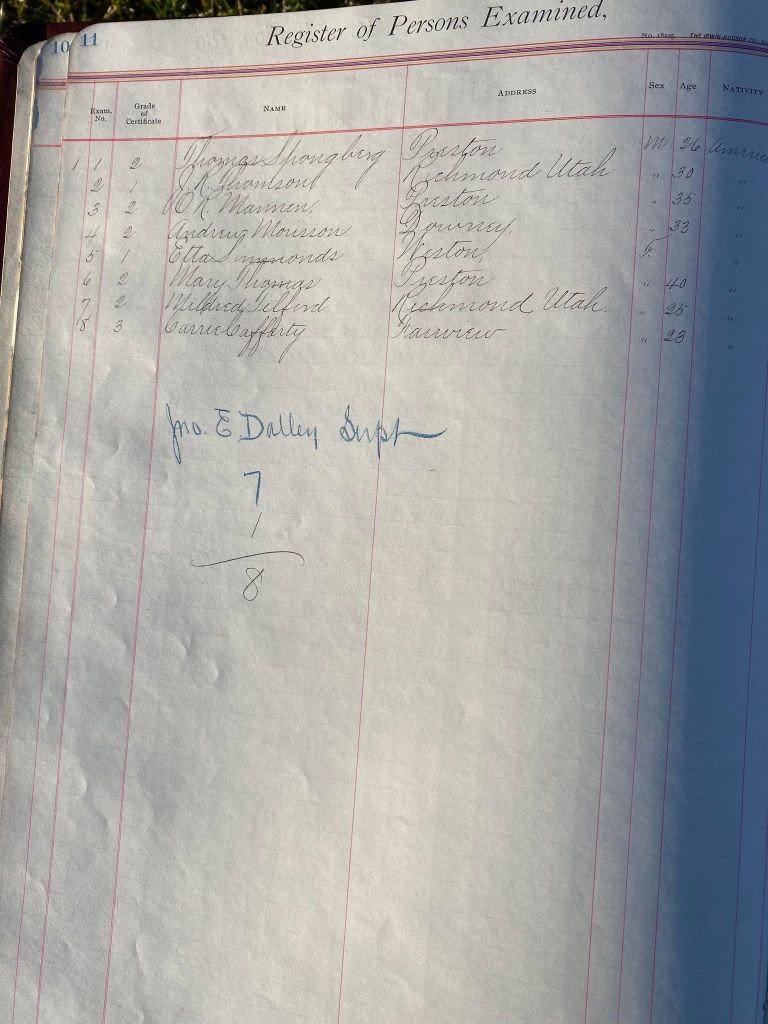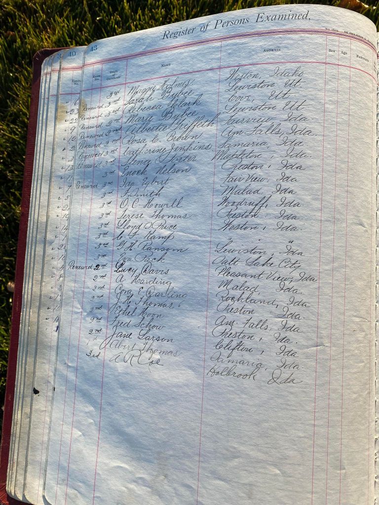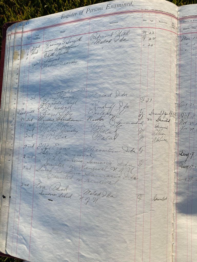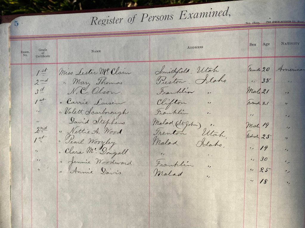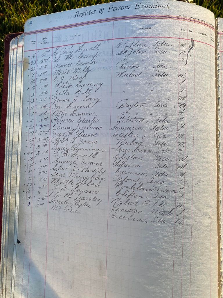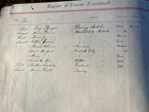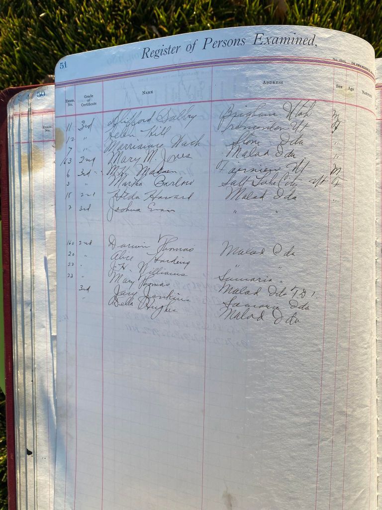 This is exciting information that was found at the old Malad High School before it was torn down. It has the teacher’s examination scores with information including: Name, Grade of Certificate, Address, Gender, Age, Nativity, Number of Months Experience, Date of Exam, Date of Expiration, Standing in Each Branch-100 Per Cent. Basis. At one point I thought that I could feel the presence of at least 2 women and 1 man while working on the dates between 1901 and 1905. It seemed that I could even discern the clothing they were wearing. This was in the evening while my children were in the room being overly silly.
