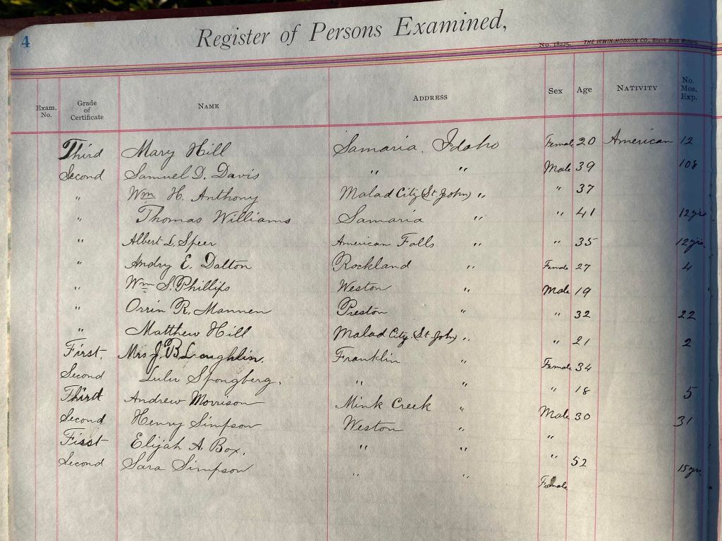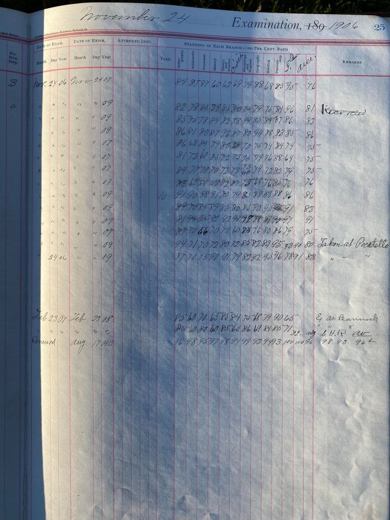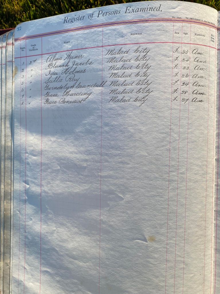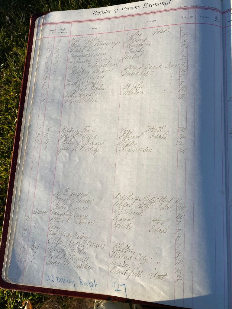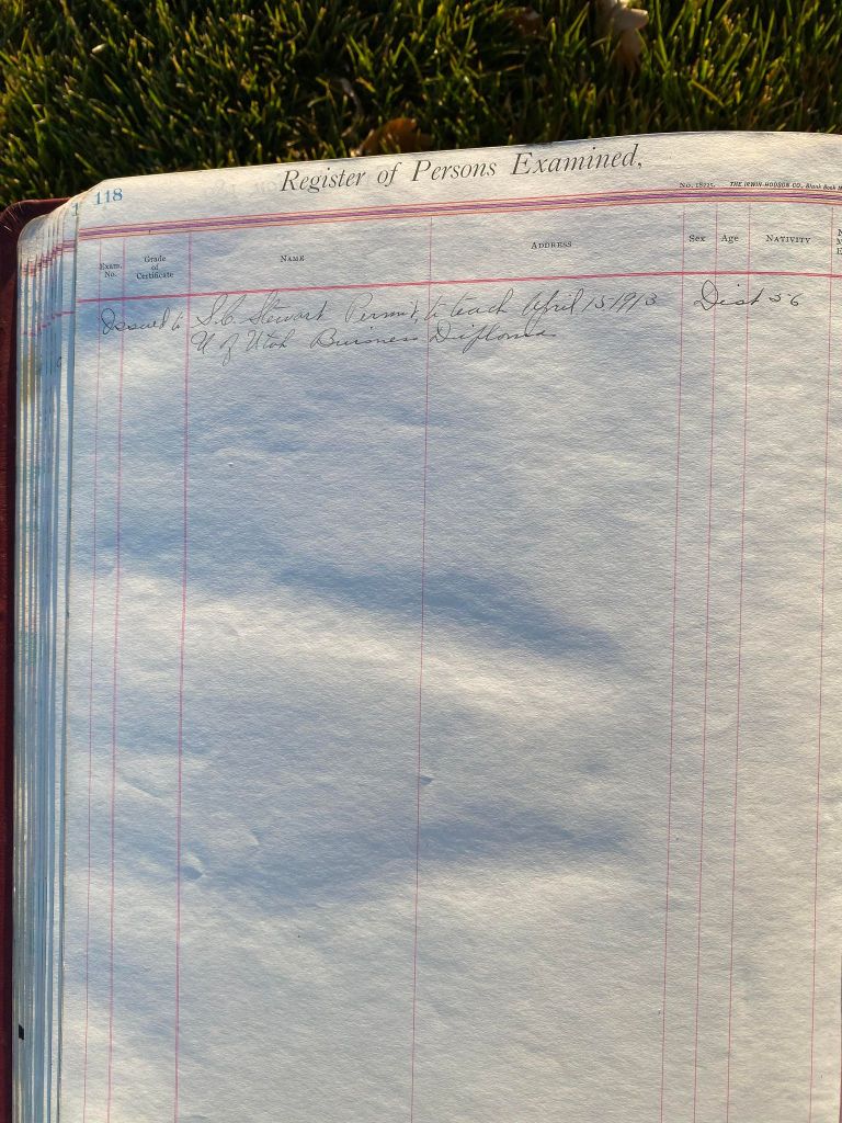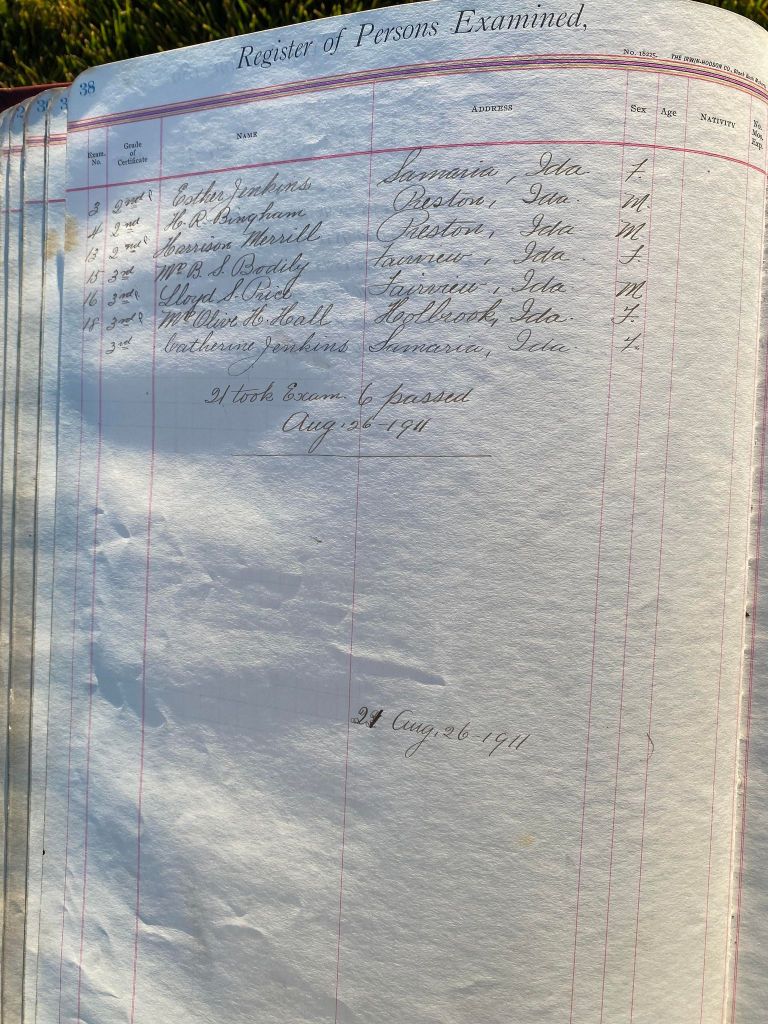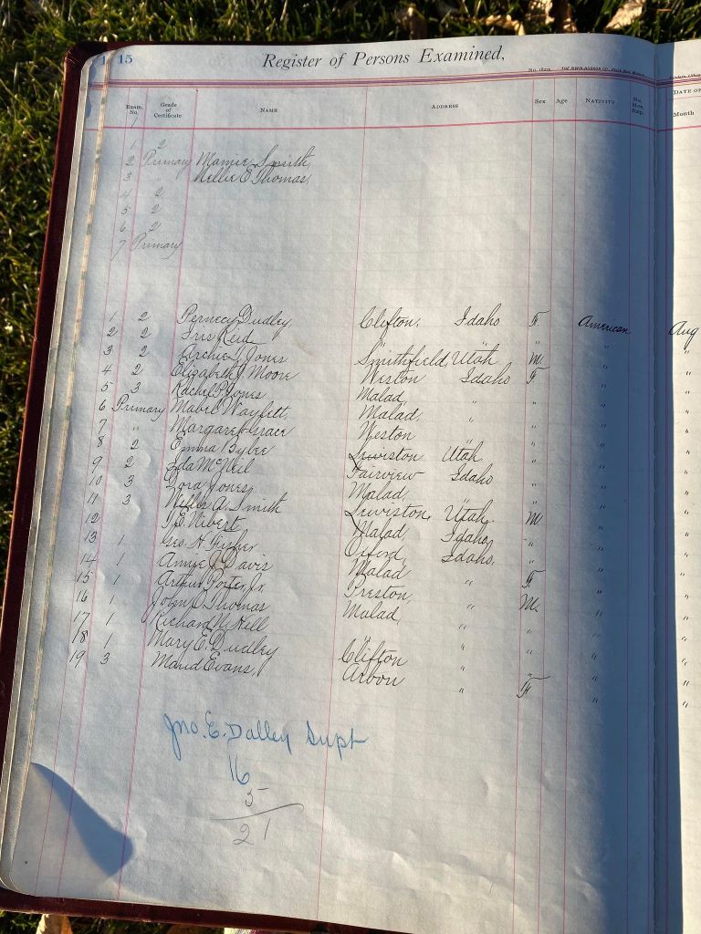 This is exciting information that was found at the old Malad High School before it was torn down. It has the teacher’s examination scores with information including: Name, Grade of Certificate, Address, Gender, Age, Nativity, Number of Months Experience, Date of Exam, Date of Expiration, Standing in Each Branch-100 Per Cent. Basis. At one point I thought that I could feel the presence of at least 2 women and 1 man while working on the dates between 1901 and 1905. It seemed that I could even discern the clothing they were wearing. This was in the evening while my children were in the room being overly silly.