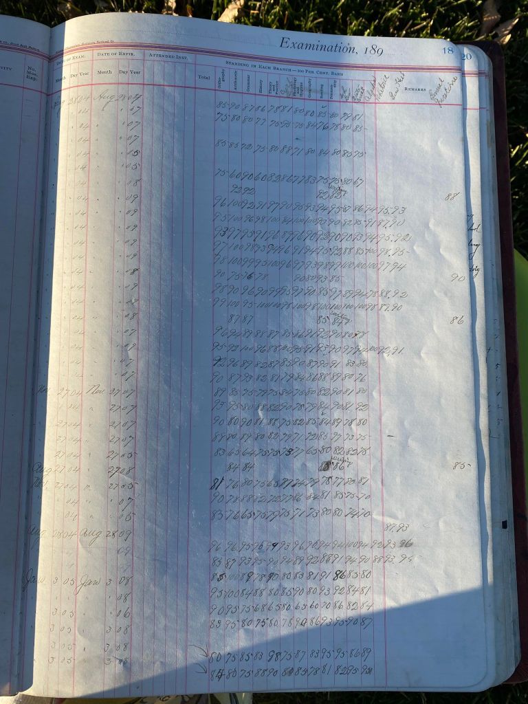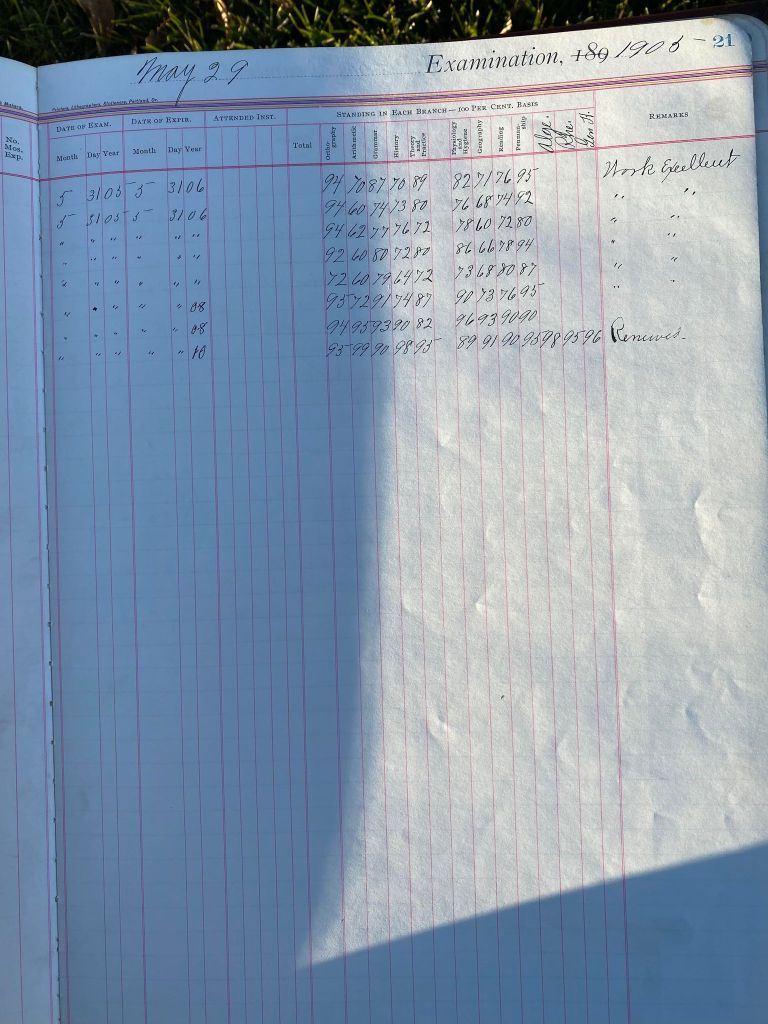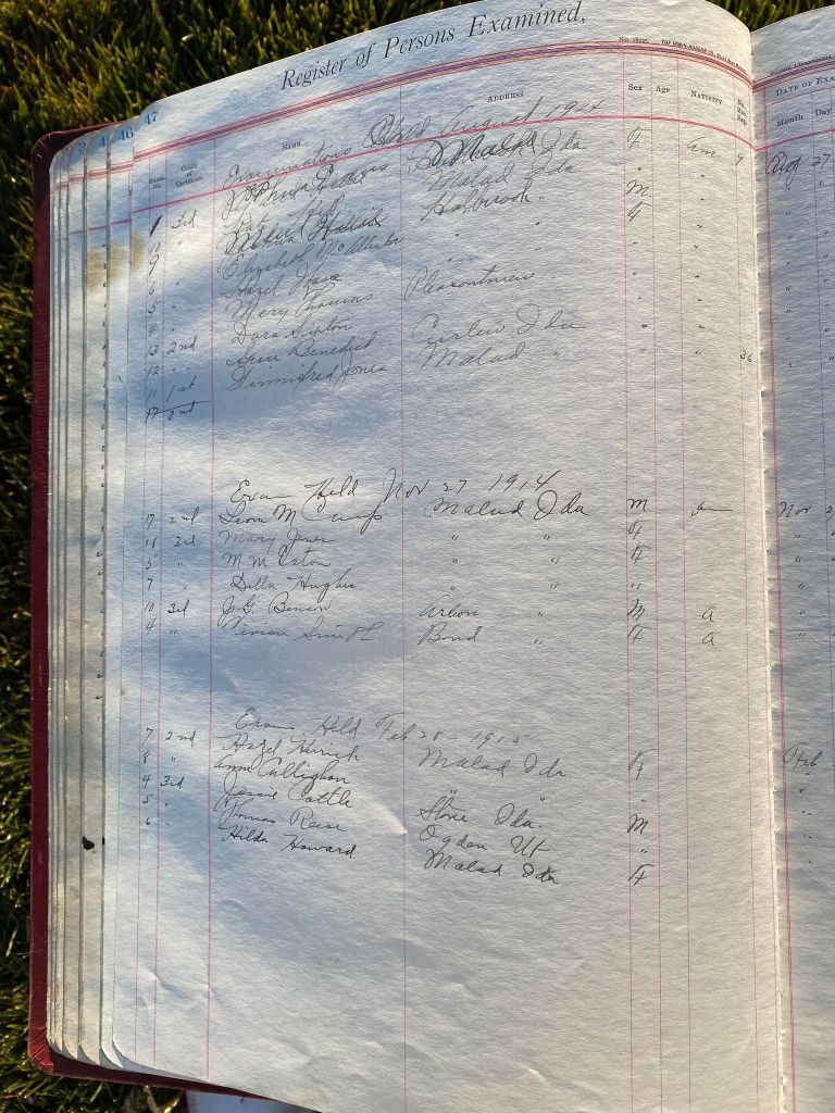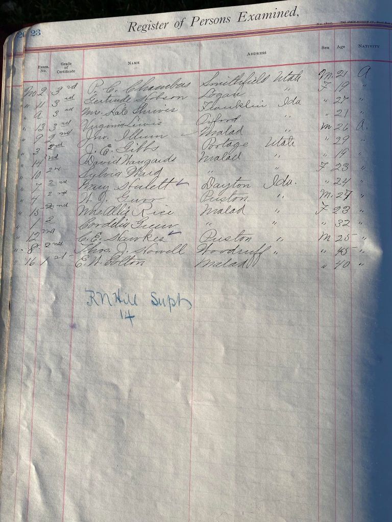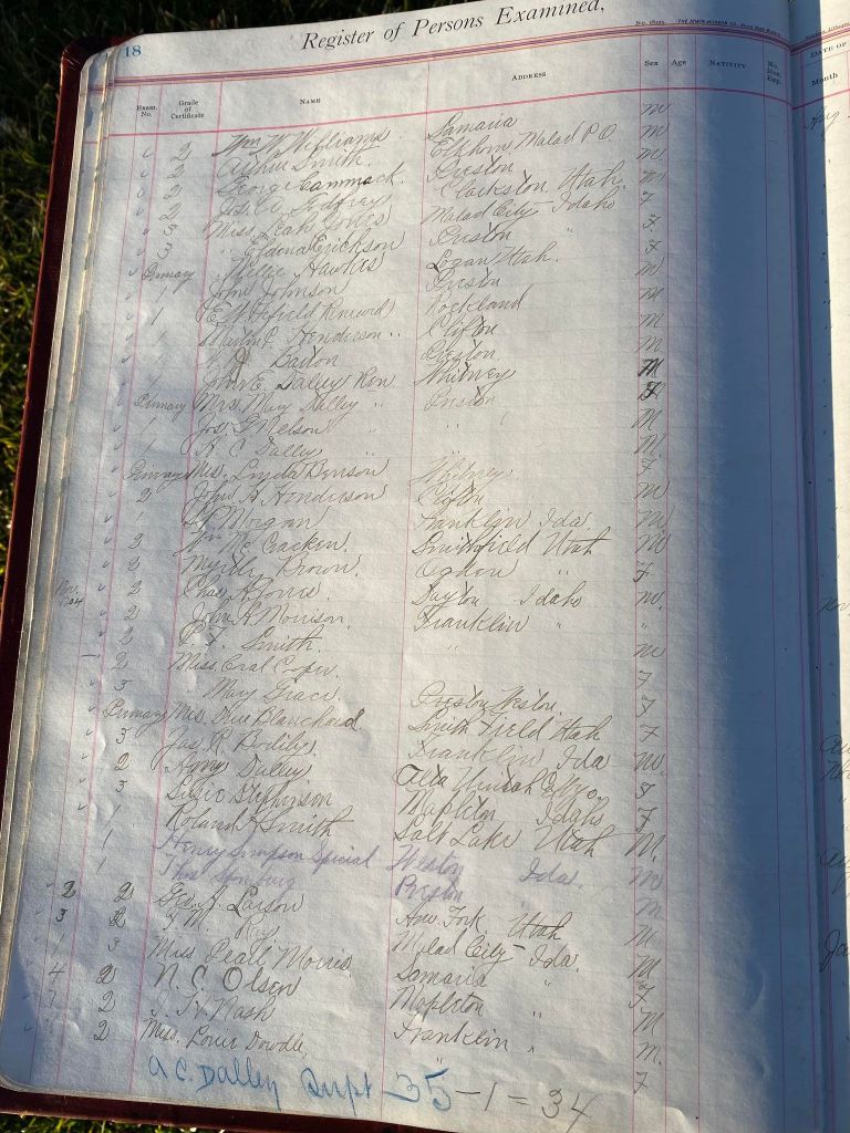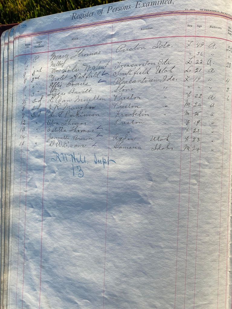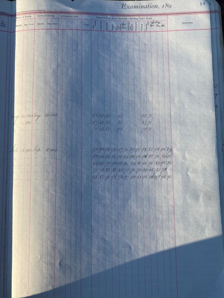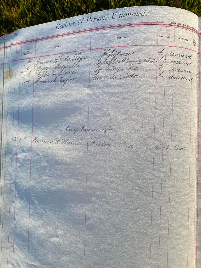 This is exciting information that was found at the old Malad High School before it was torn down. It has the teacher’s examination scores with information including: Name, Grade of Certificate, Address, Gender, Age, Nativity, Number of Months Experience, Date of Exam, Date of Expiration, Standing in Each Branch-100 Per Cent. Basis. At one point I thought that I could feel the presence of at least 2 women and 1 man while working on the dates between 1901 and 1905. It seemed that I could even discern the clothing they were wearing. This was in the evening while my children were in the room being overly silly.