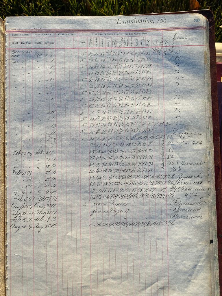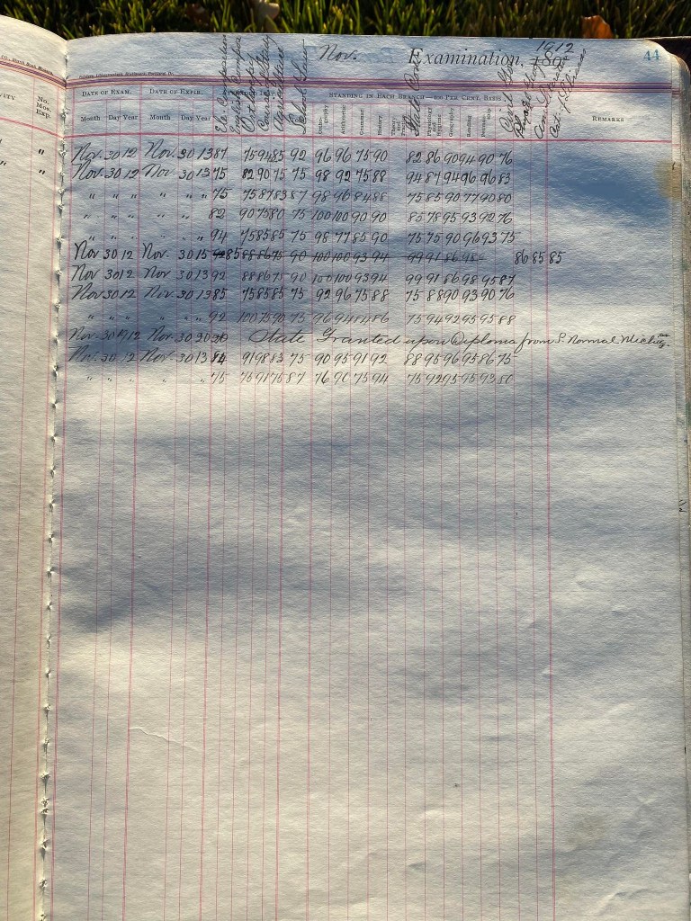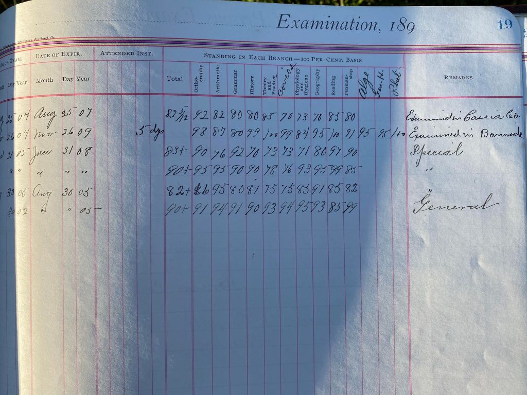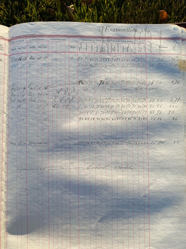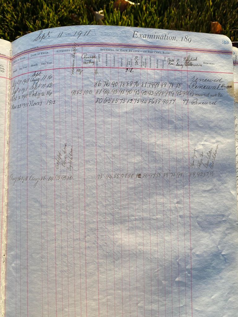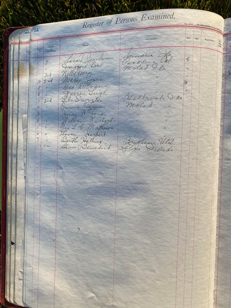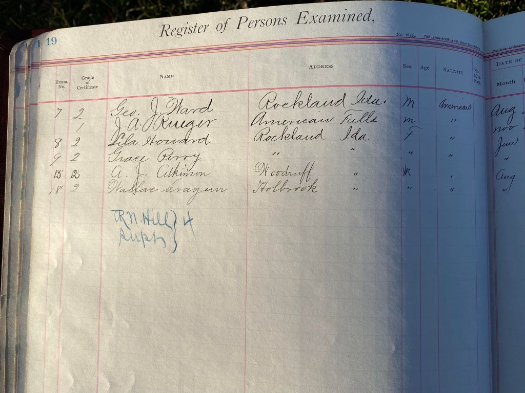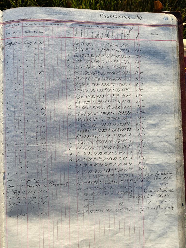 This is exciting information that was found at the old Malad High School before it was torn down. It has the teacher’s examination scores with information including: Name, Grade of Certificate, Address, Gender, Age, Nativity, Number of Months Experience, Date of Exam, Date of Expiration, Standing in Each Branch-100 Per Cent. Basis. At one point I thought that I could feel the presence of at least 2 women and 1 man while working on the dates between 1901 and 1905. It seemed that I could even discern the clothing they were wearing. This was in the evening while my children were in the room being overly silly.