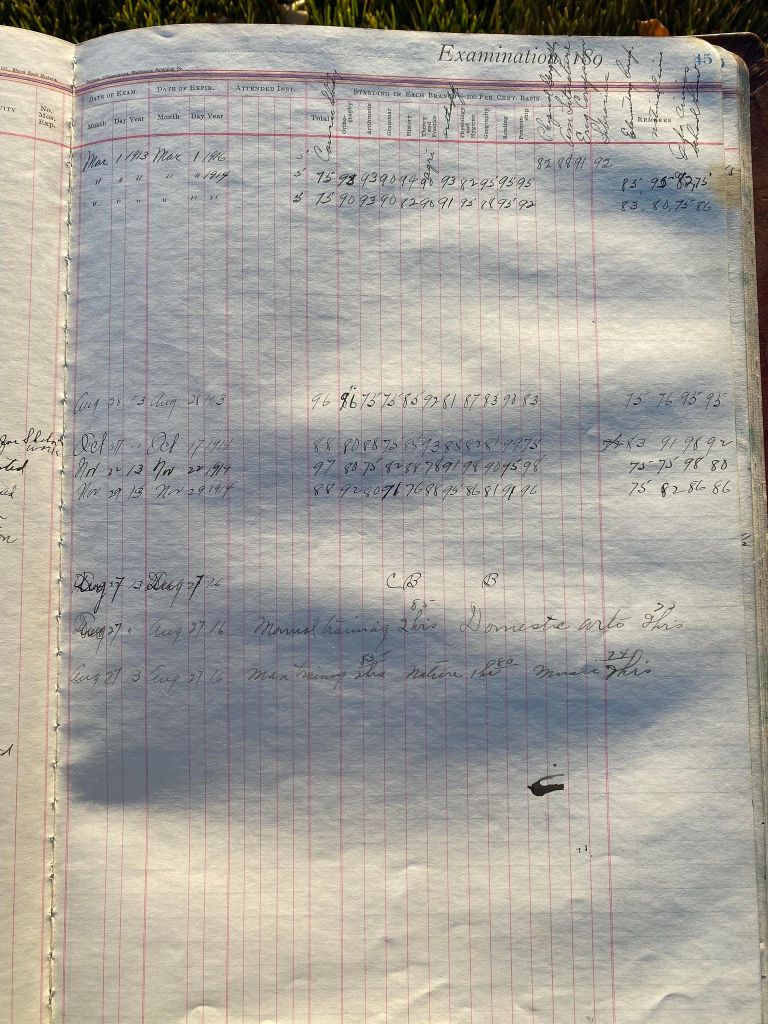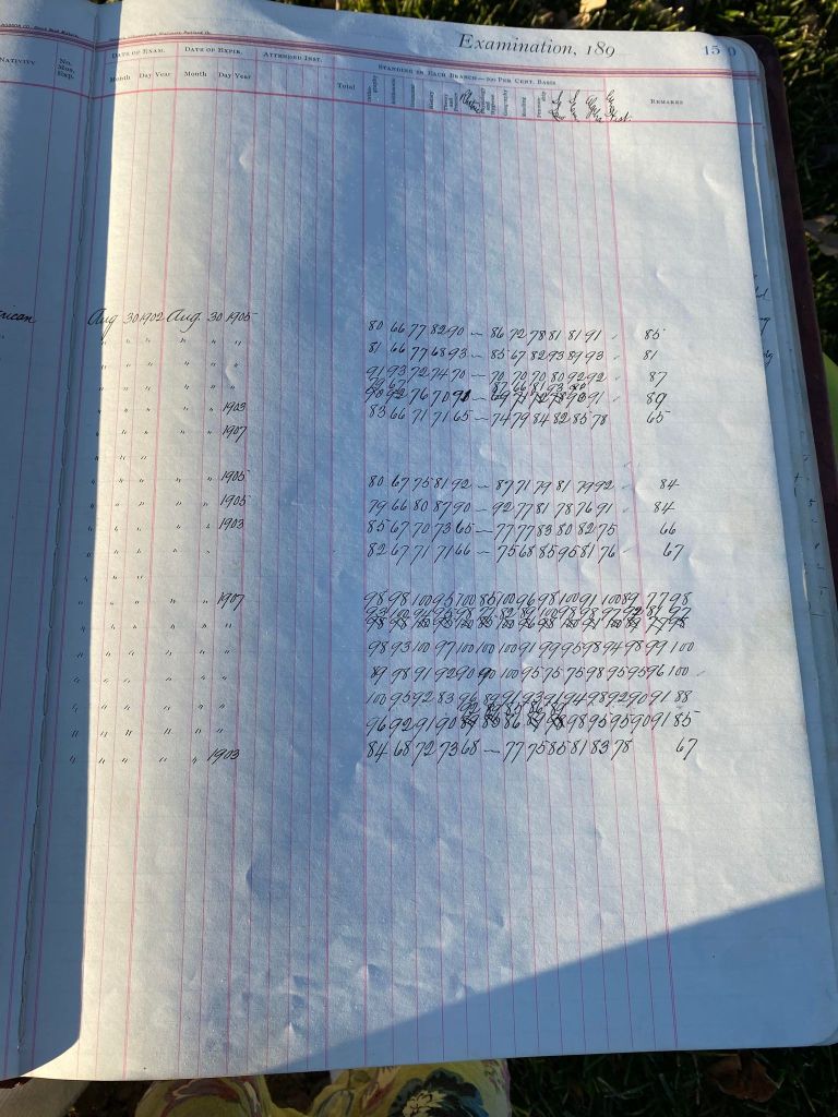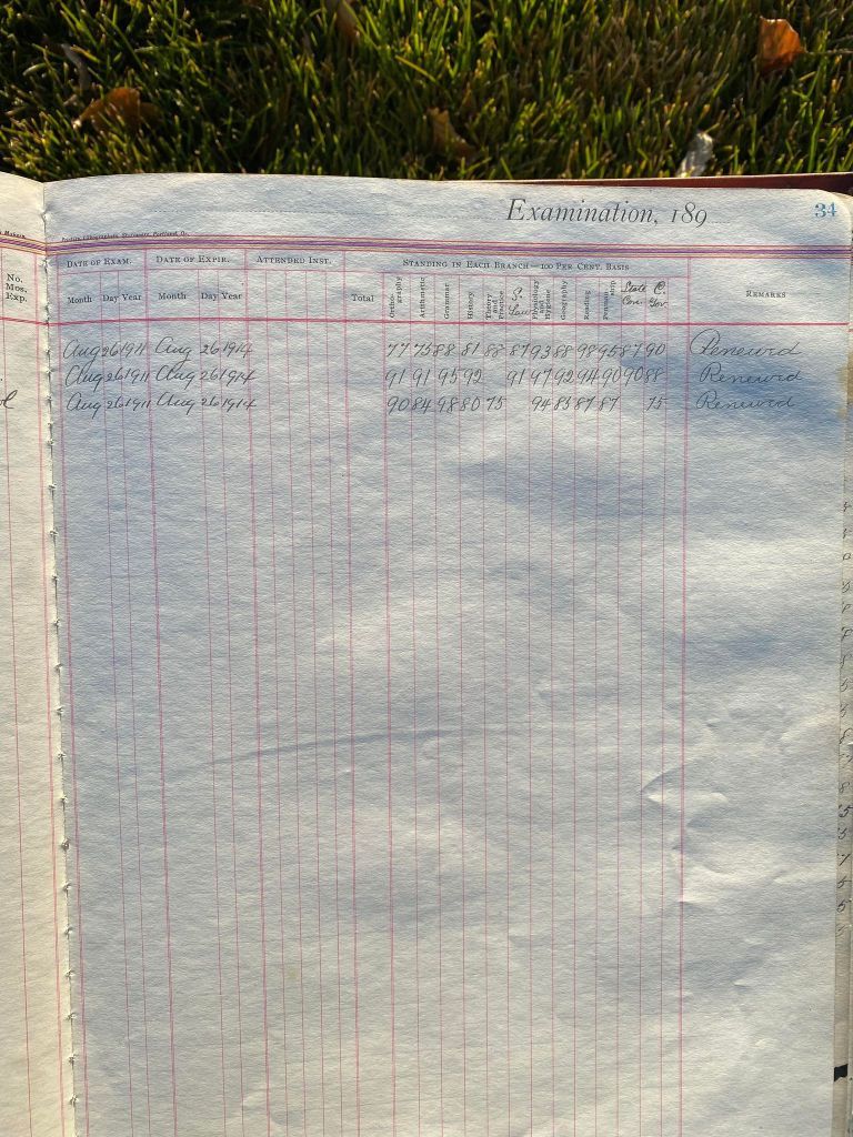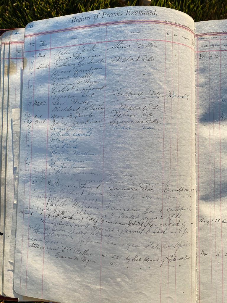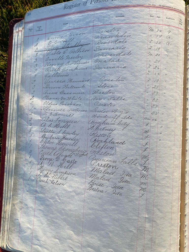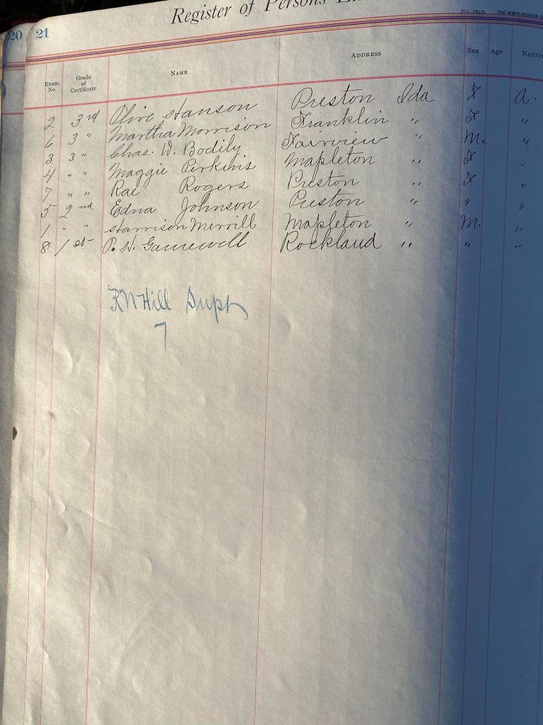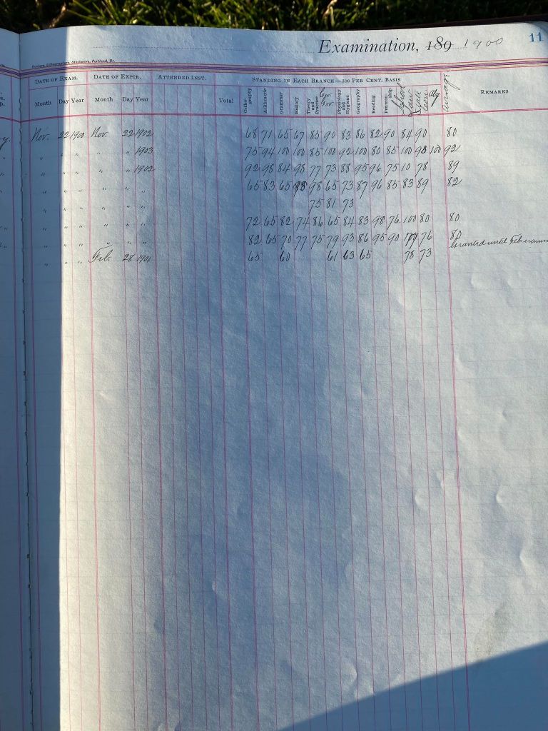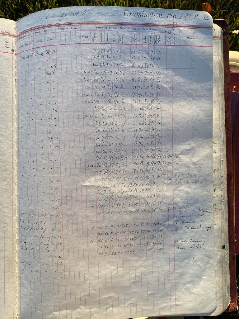 This is exciting information that was found at the old Malad High School before it was torn down. It has the teacher’s examination scores with information including: Name, Grade of Certificate, Address, Gender, Age, Nativity, Number of Months Experience, Date of Exam, Date of Expiration, Standing in Each Branch-100 Per Cent. Basis. At one point I thought that I could feel the presence of at least 2 women and 1 man while working on the dates between 1901 and 1905. It seemed that I could even discern the clothing they were wearing. This was in the evening while my children were in the room being overly silly.