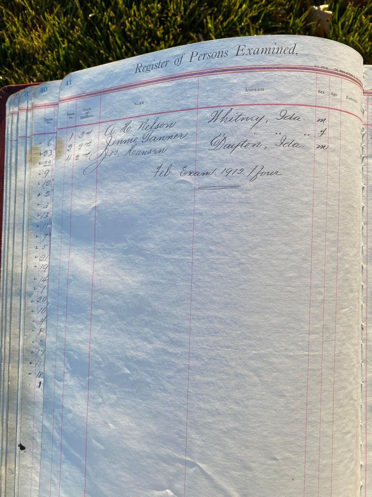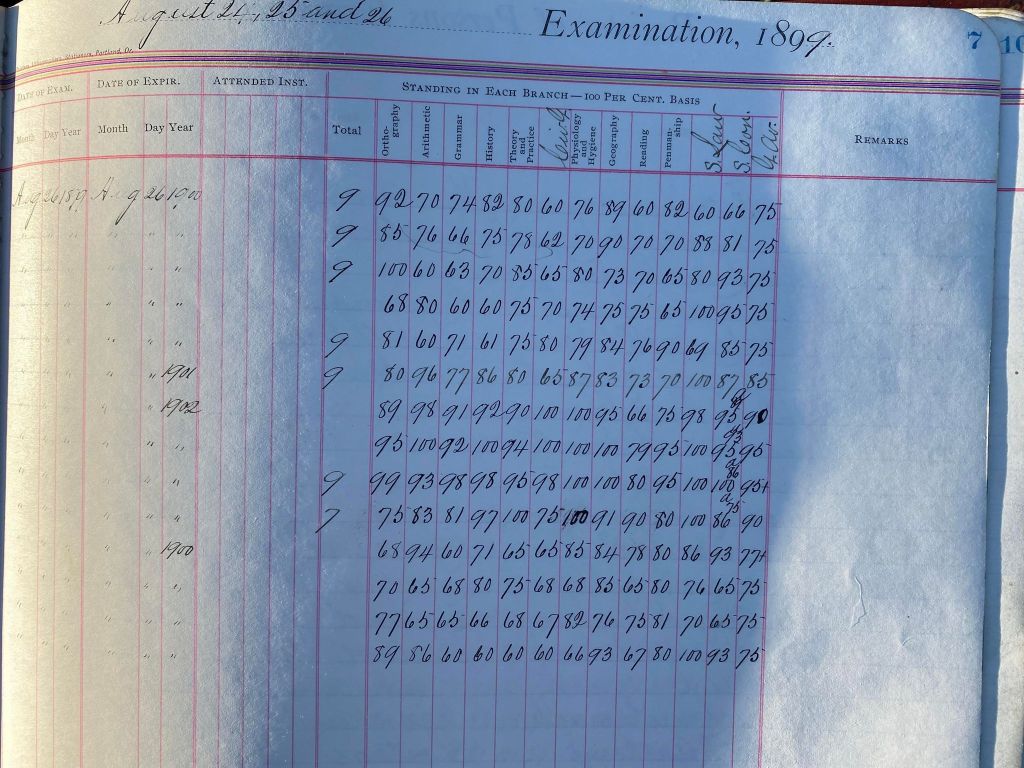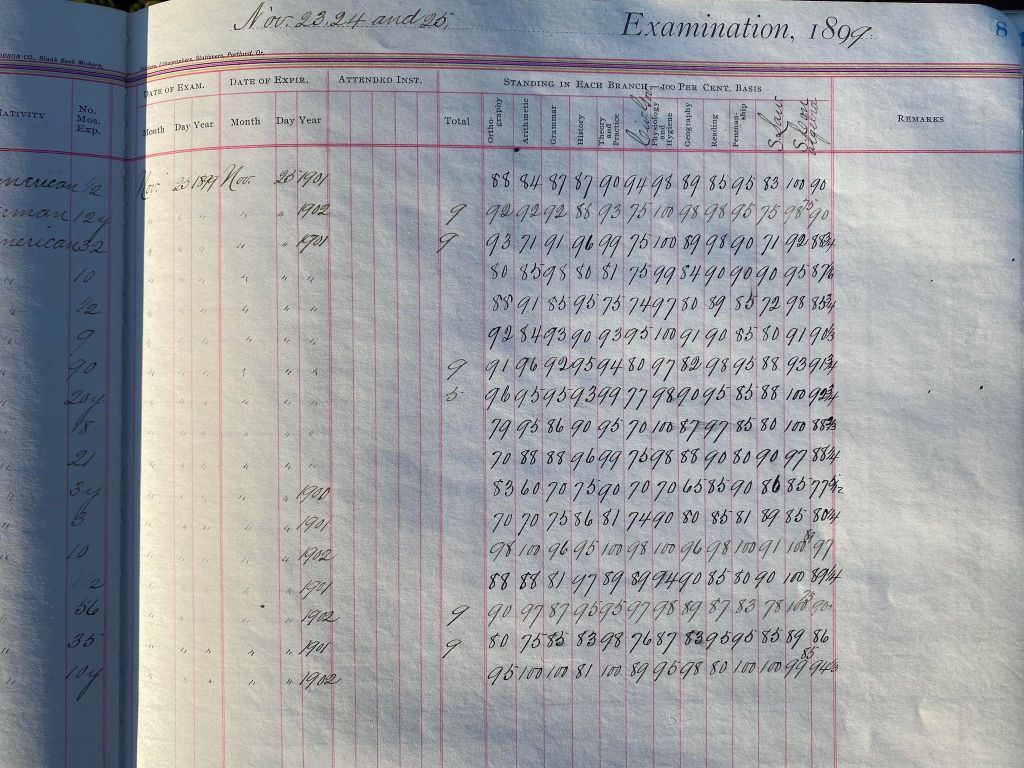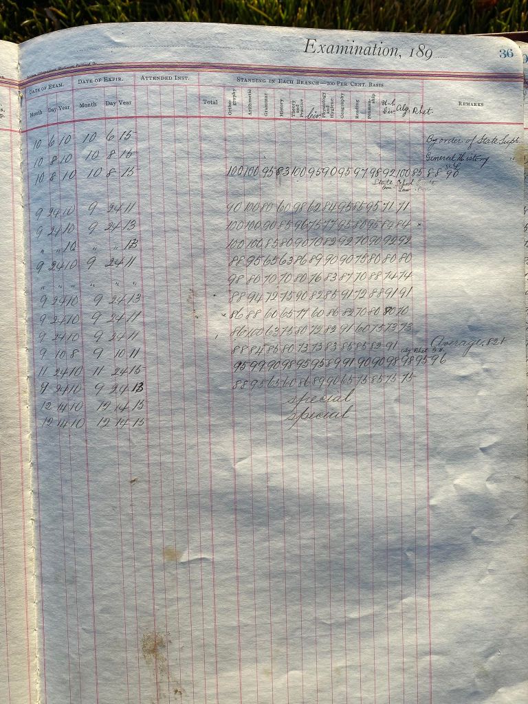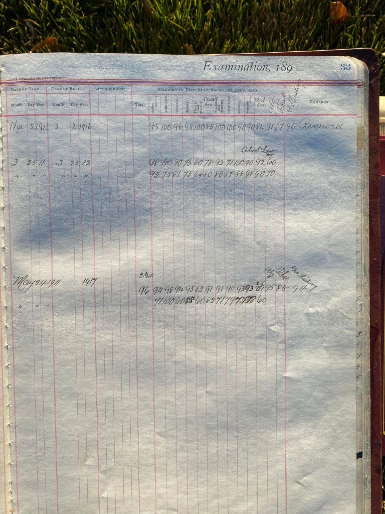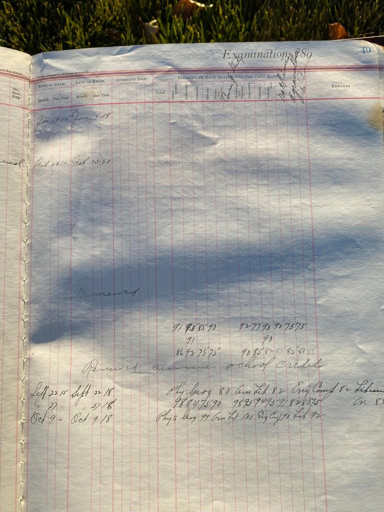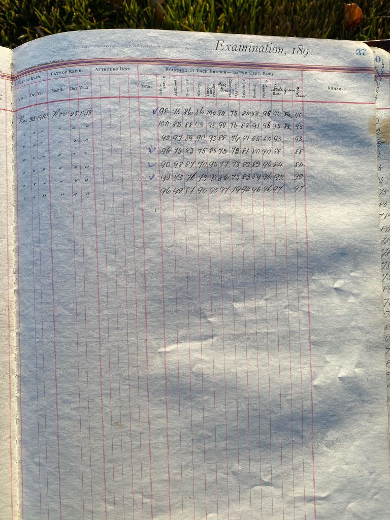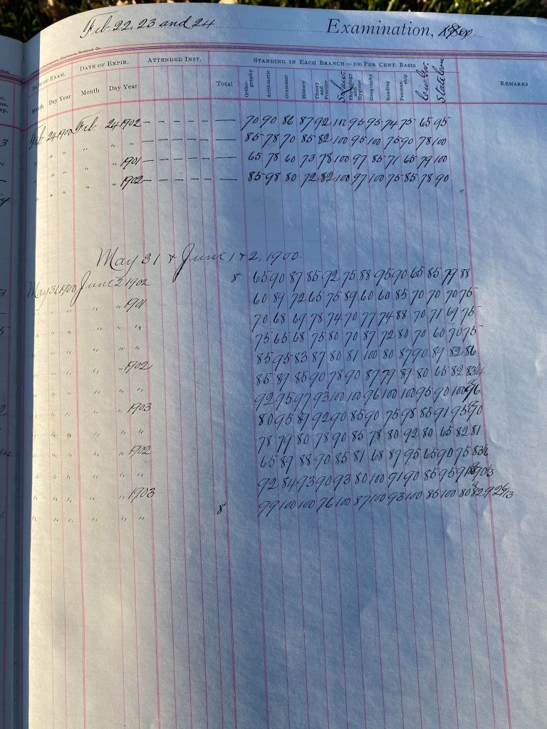 This is exciting information that was found at the old Malad High School before it was torn down. It has the teacher’s examination scores with information including: Name, Grade of Certificate, Address, Gender, Age, Nativity, Number of Months Experience, Date of Exam, Date of Expiration, Standing in Each Branch-100 Per Cent. Basis. At one point I thought that I could feel the presence of at least 2 women and 1 man while working on the dates between 1901 and 1905. It seemed that I could even discern the clothing they were wearing. This was in the evening while my children were in the room being overly silly.