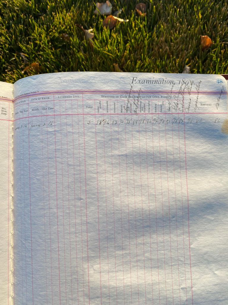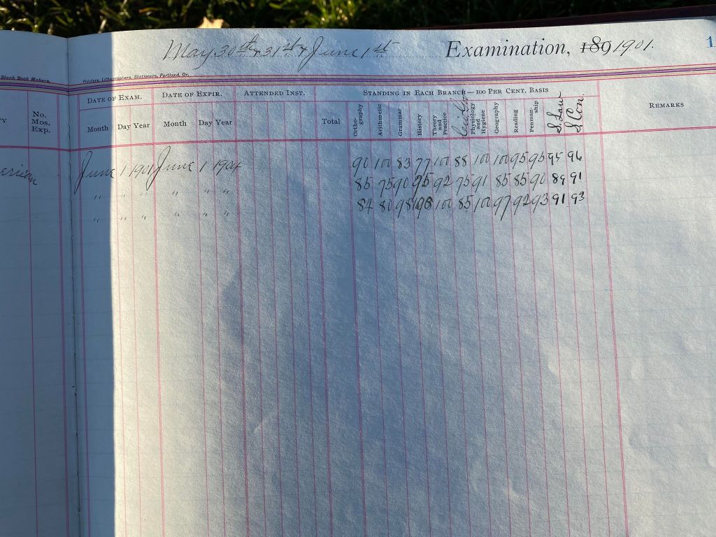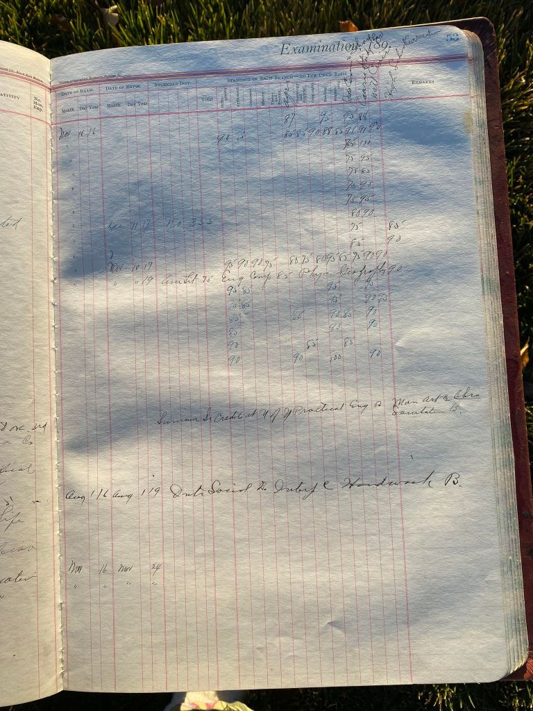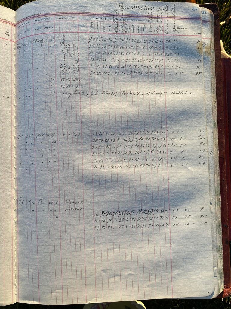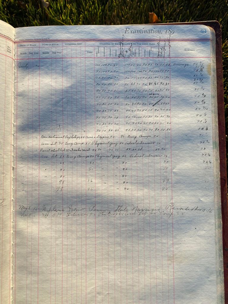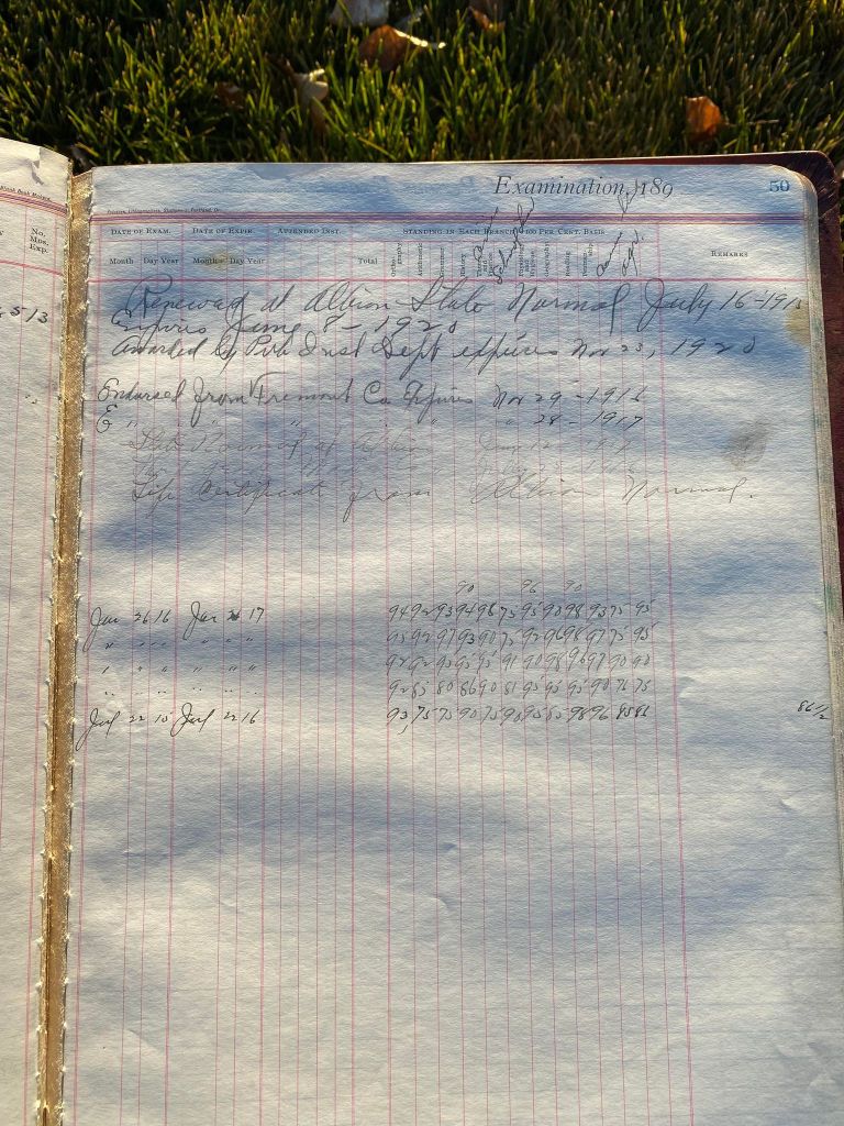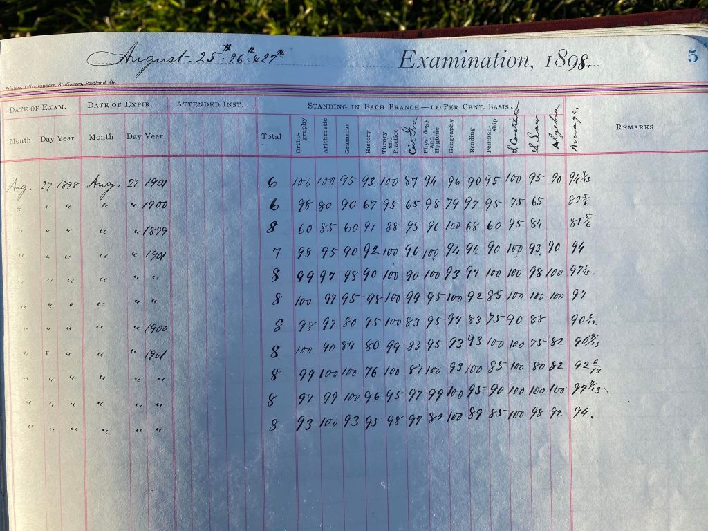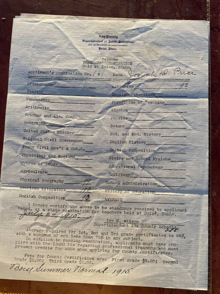 This is exciting information that was found at the old Malad High School before it was torn down. It has the teacher’s examination scores with information including: Name, Grade of Certificate, Address, Gender, Age, Nativity, Number of Months Experience, Date of Exam, Date of Expiration, Standing in Each Branch-100 Per Cent. Basis. At one point I thought that I could feel the presence of at least 2 women and 1 man while working on the dates between 1901 and 1905. It seemed that I could even discern the clothing they were wearing. This was in the evening while my children were in the room being overly silly.