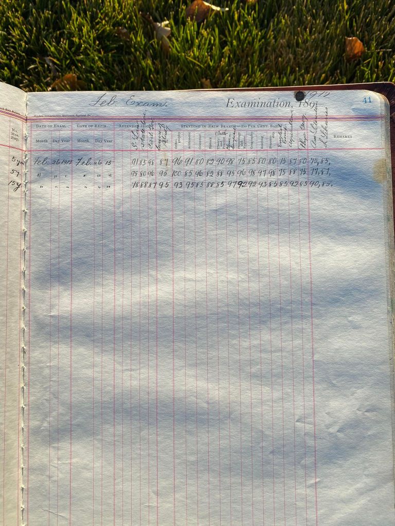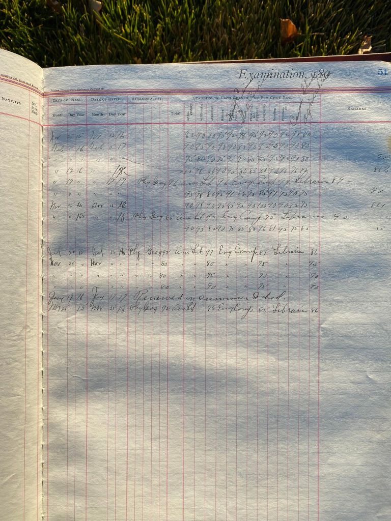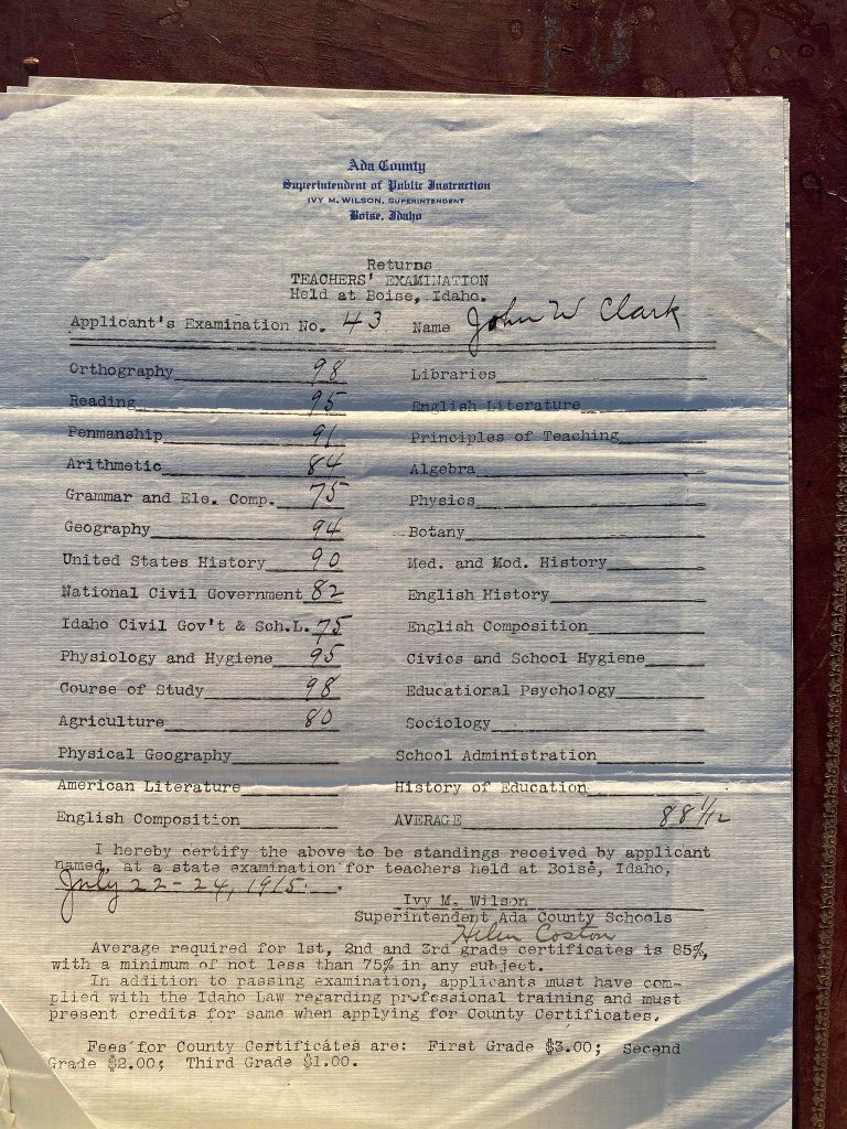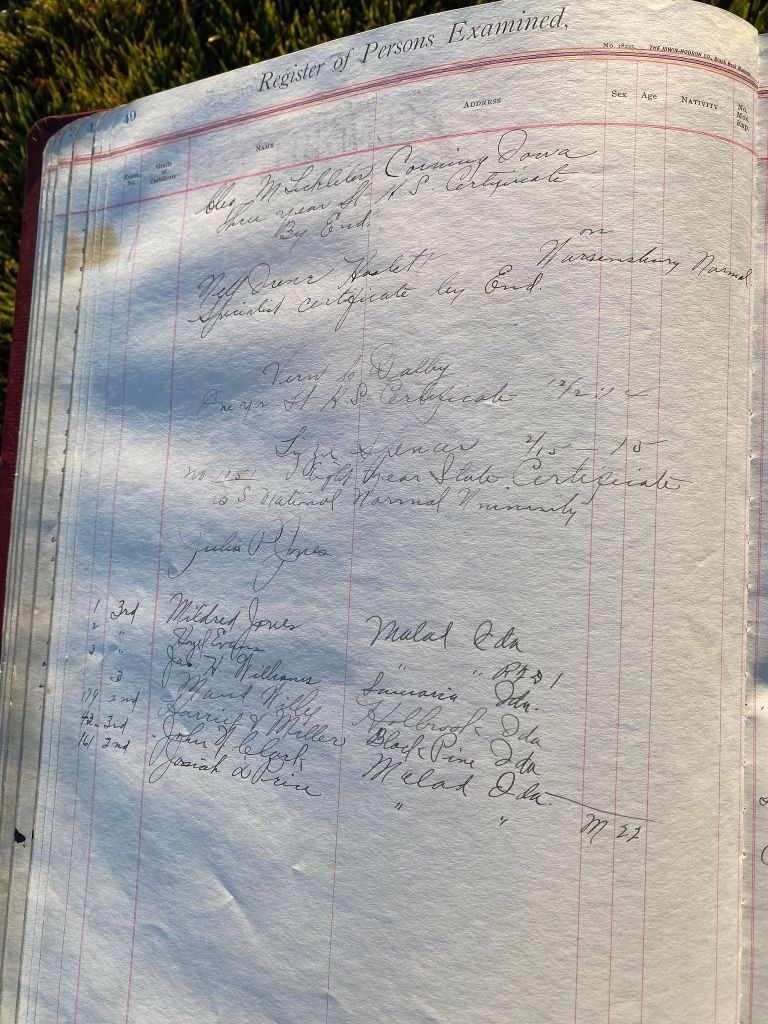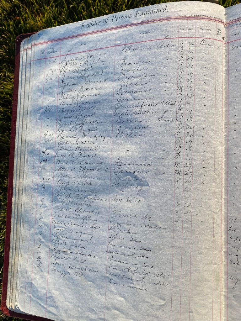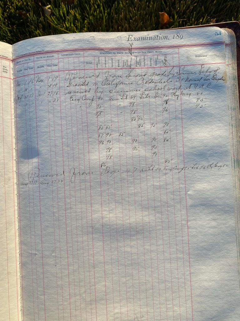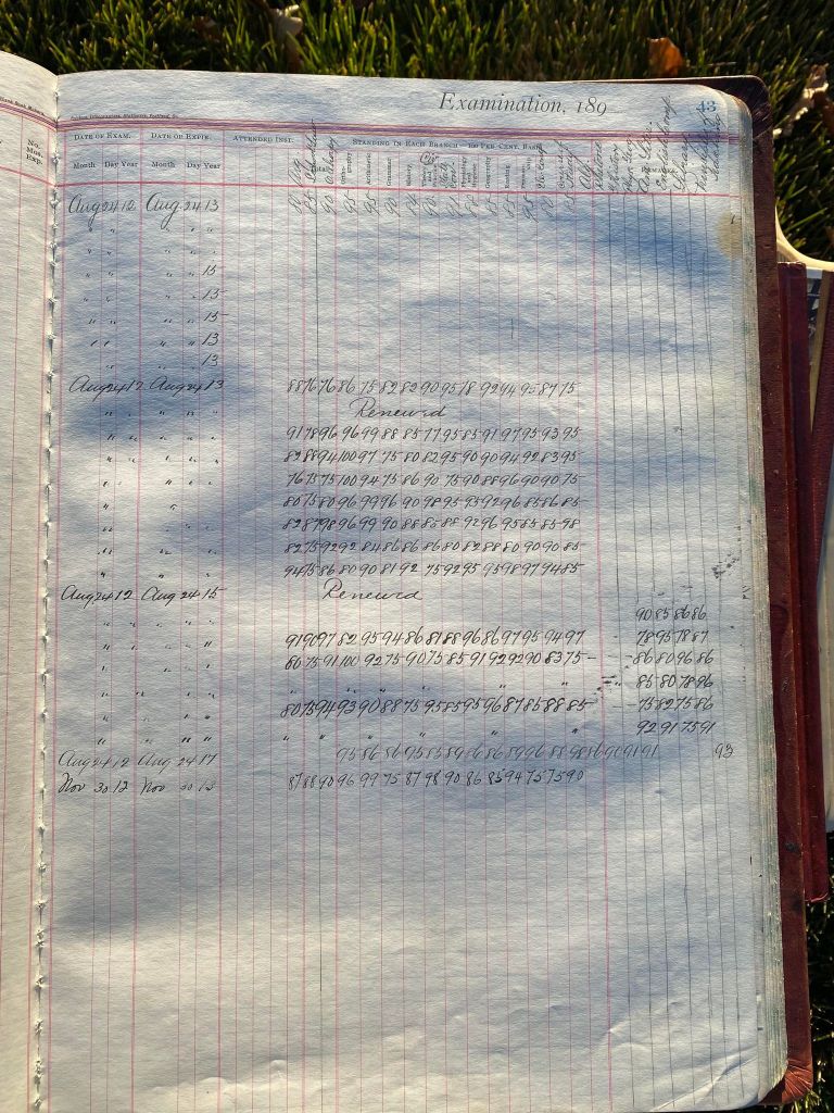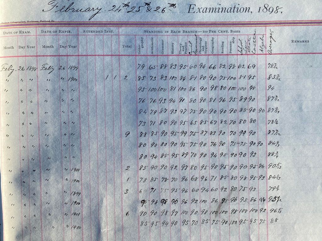 This is exciting information that was found at the old Malad High School before it was torn down. It has the teacher’s examination scores with information including: Name, Grade of Certificate, Address, Gender, Age, Nativity, Number of Months Experience, Date of Exam, Date of Expiration, Standing in Each Branch-100 Per Cent. Basis. At one point I thought that I could feel the presence of at least 2 women and 1 man while working on the dates between 1901 and 1905. It seemed that I could even discern the clothing they were wearing. This was in the evening while my children were in the room being overly silly.