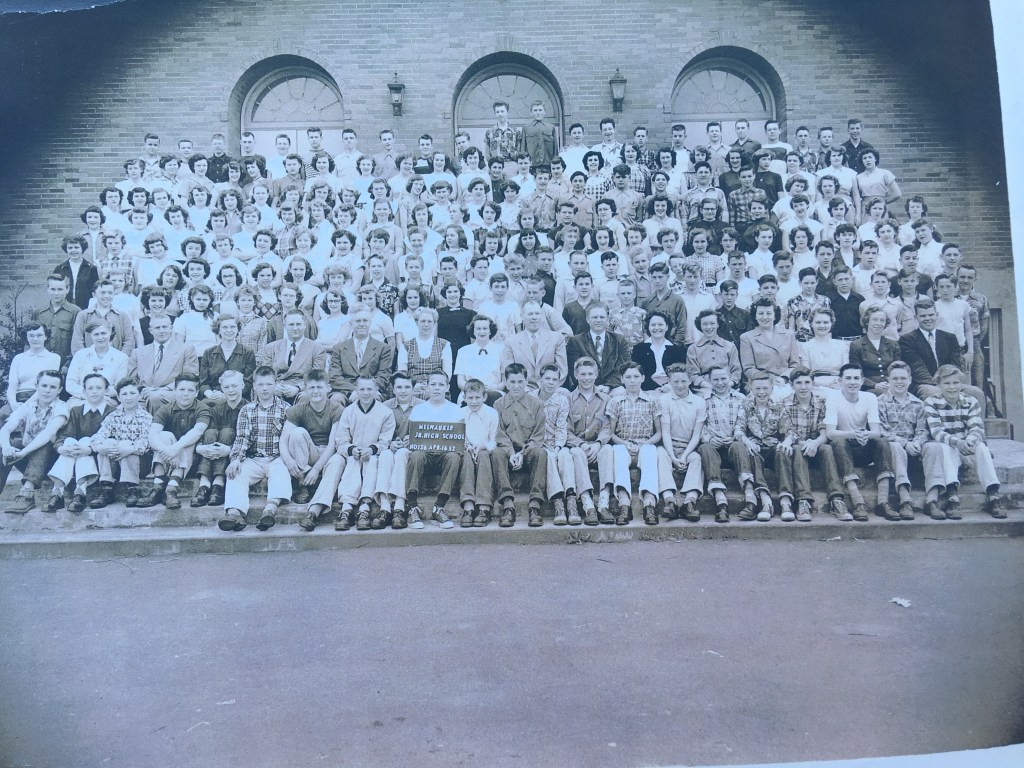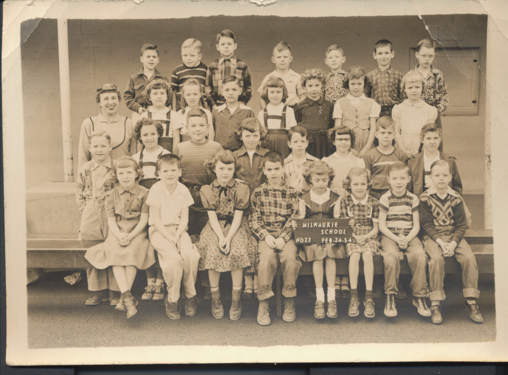 GerryCora Becker Marker (2nd from right), Jacob Becker (Cora’s father far right) with the minister and his wife of the Minthorn Community Church. Mary Alice, Don Wheeler, Lucile.Klamath, OregonMilwaukee Jr High School No 126 April 16, 1952