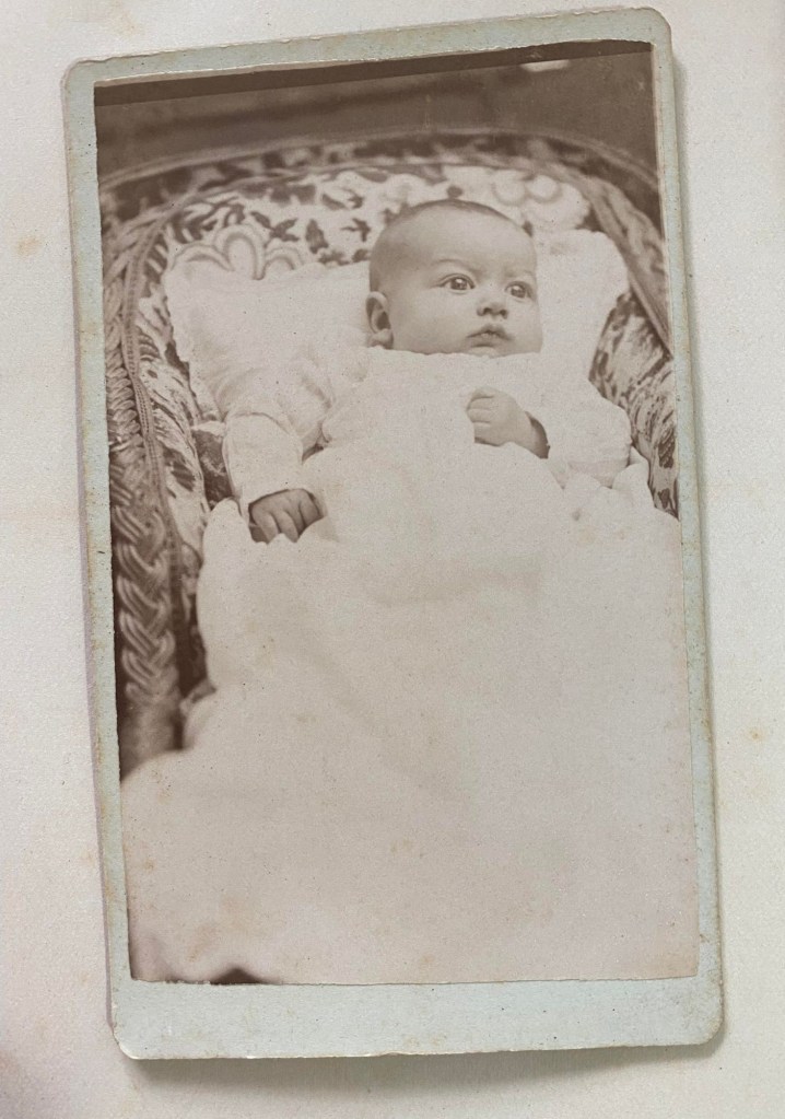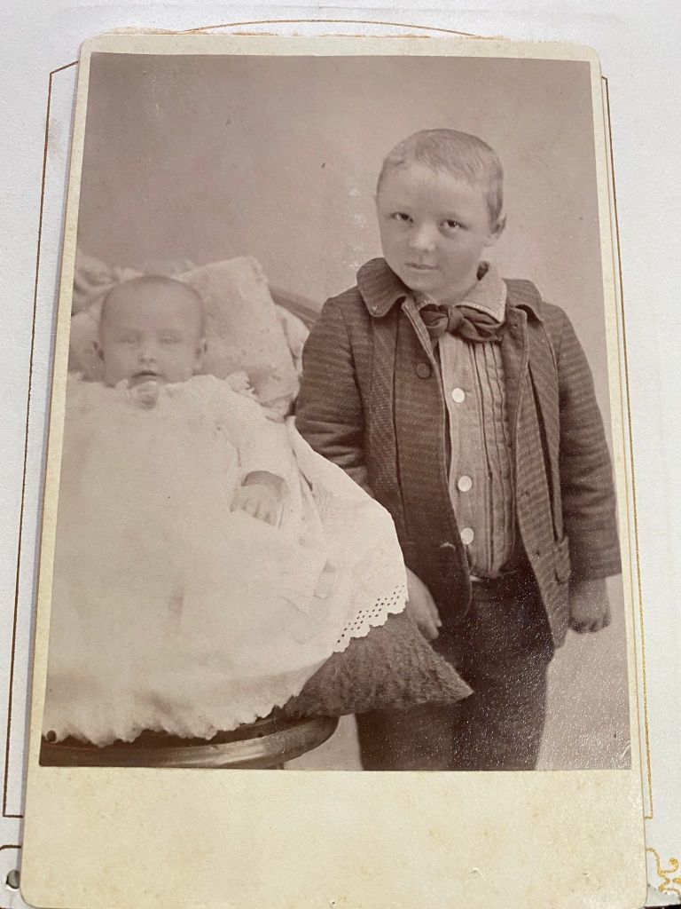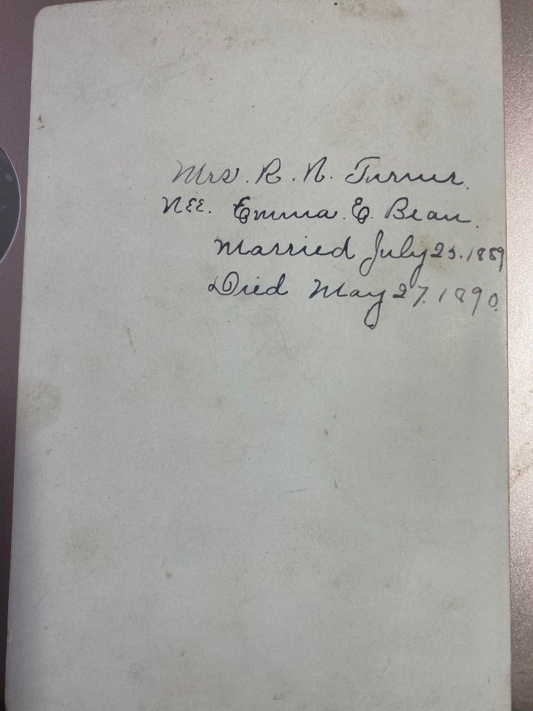 The next picture provides information about this good lady, Her name was Mrs. R.N. Turner(?). Nee Emma E Beau, Married July 25, 1889. Died May 27, 1890.The next picture provides information about this child. O.W. Snodderly, Elmo/a, Mo.This the backside of the previous photo. The two photos were side-by-side, His was slightly more faded. This photo belonged to the previous picture. I love this photo! She looks as if she has recently accomplished a great achievement.I suspect this young lady is the same person 18 or 19 frames prior to this. When viewing the baby carefully, they eyes are open with an expression of natural happiness. The little guy next to the baby seems to be showing caution with a glint of happiness as well. The love in this photo swells out into the future. The LOOK in that child’s eyes says it all!I can’t help wondering if the look in his face comes from confusion about the camera. Was this his first time in front of one?It looks as she has a deep scar on her face. I could be wrong. Notice the date as 1878. Could he have been a student at Princeton University?