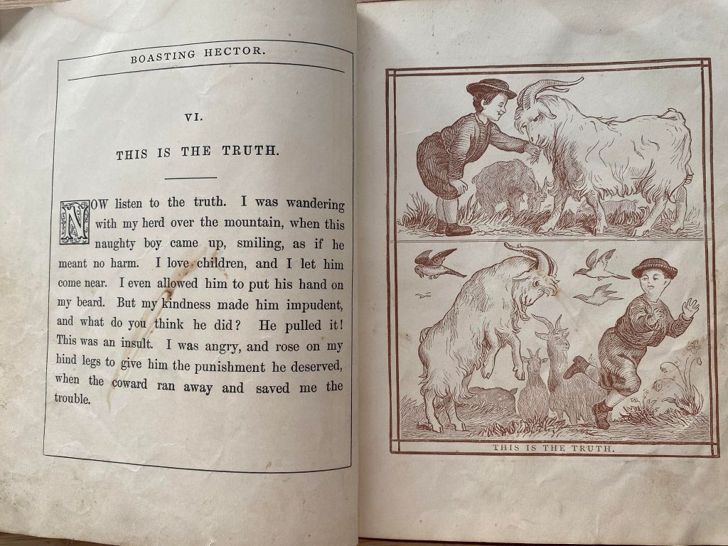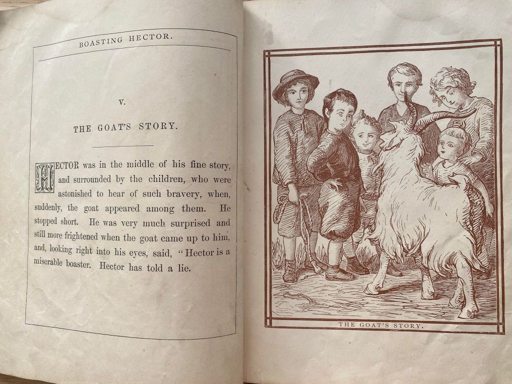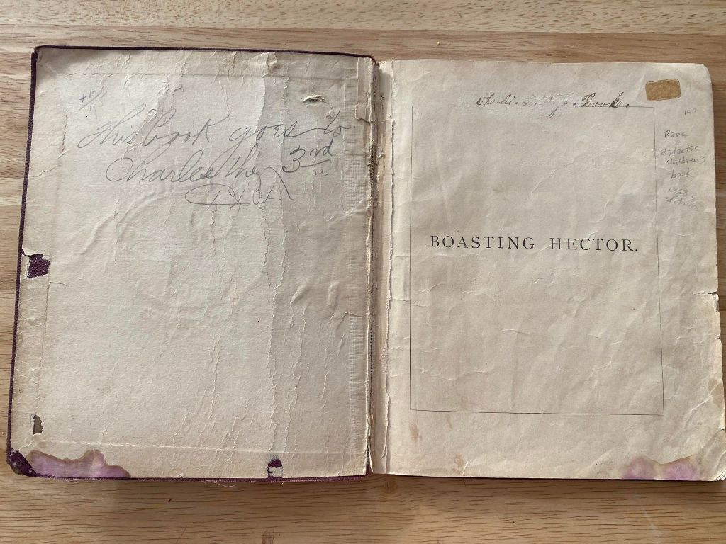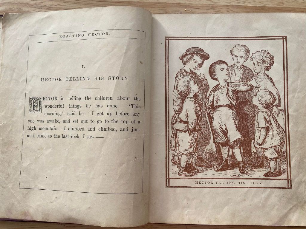 This cute little book was produced in 1868. It belonged to a young lad by the name of “Master Charlie …” Glorying in the tale of how he beat down to monster on hill to his amused chums, Hector is soon horrified by embarrassment of his lies and into submission of the truth.