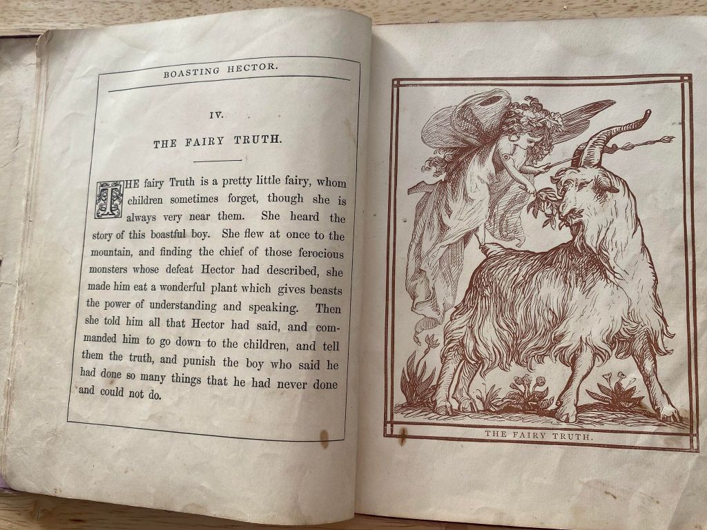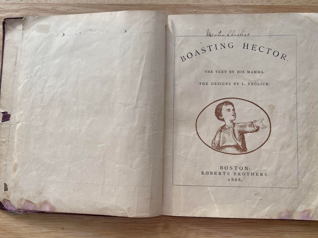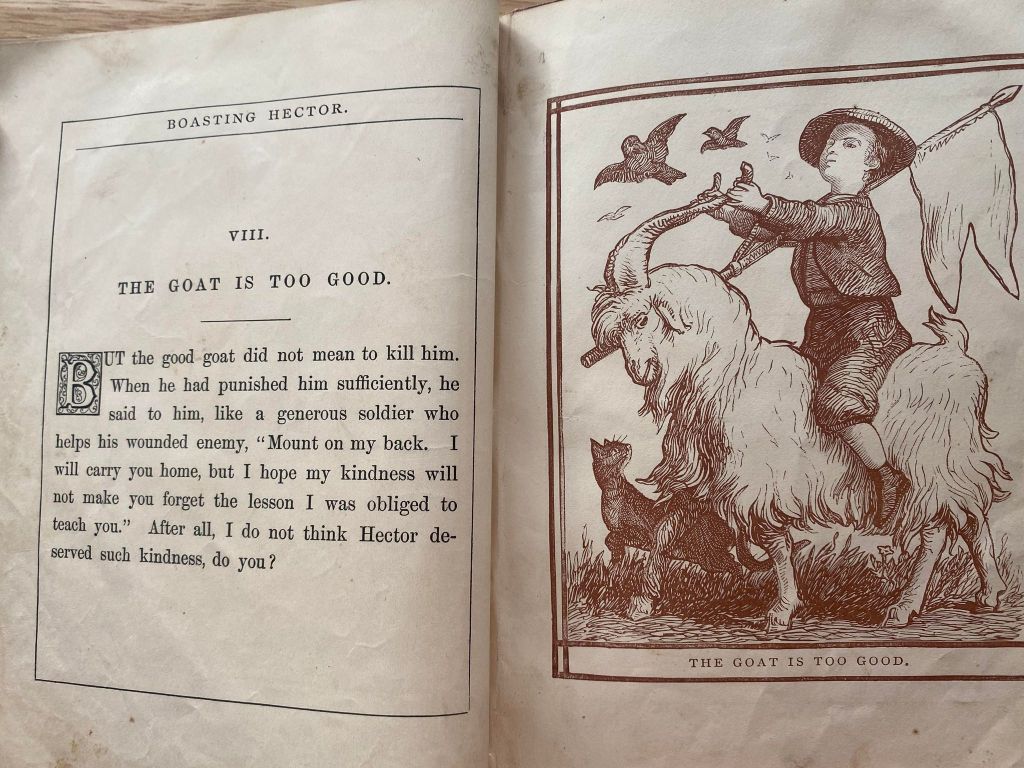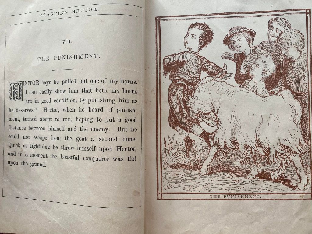 This cute little book was produced in 1868. It belonged to a young lad by the name of “Master Charlie …” Glorying in the tale of how he beat down to monster on hill to his amused chums, Hector is soon horrified by embarrassment of his lies and into submission of the truth.