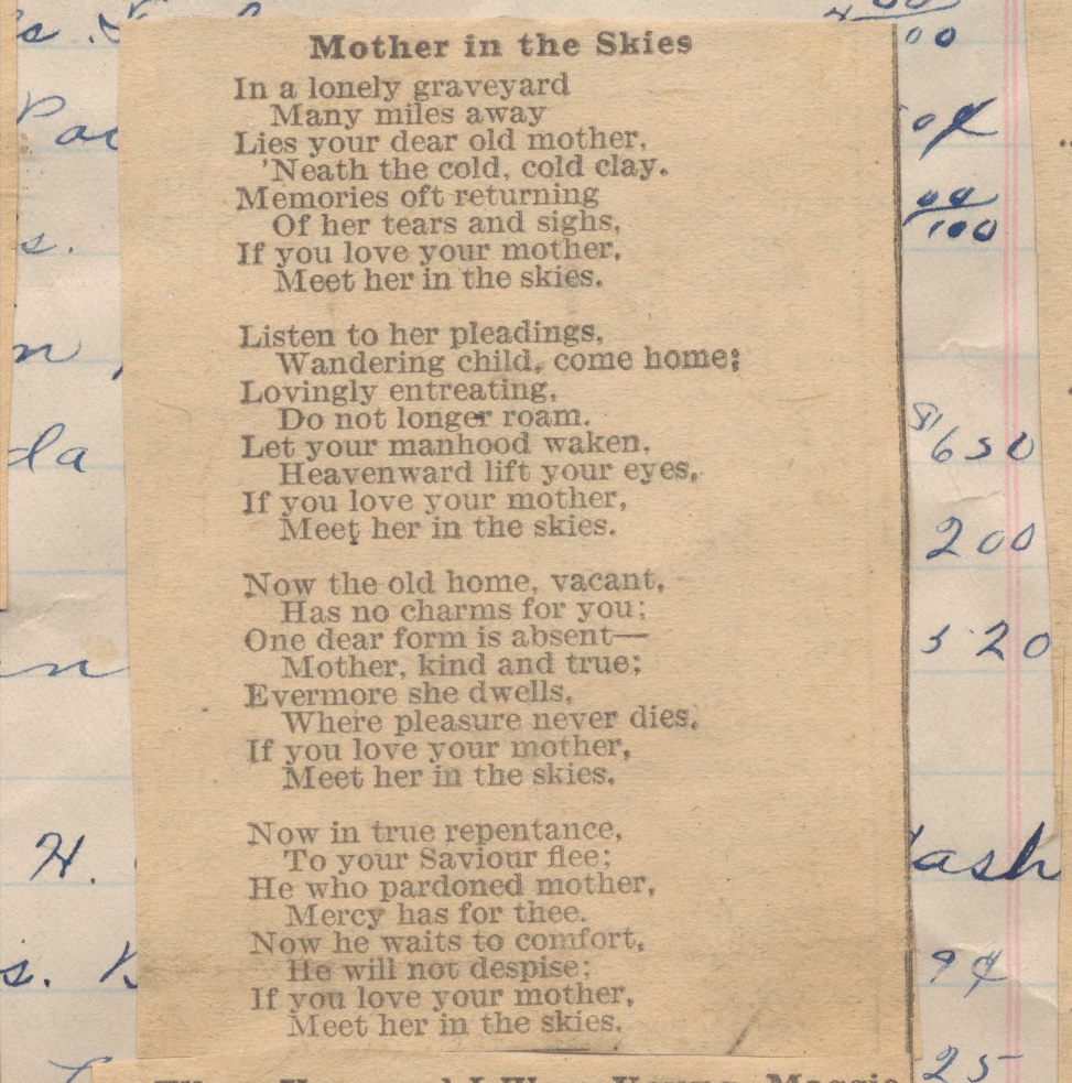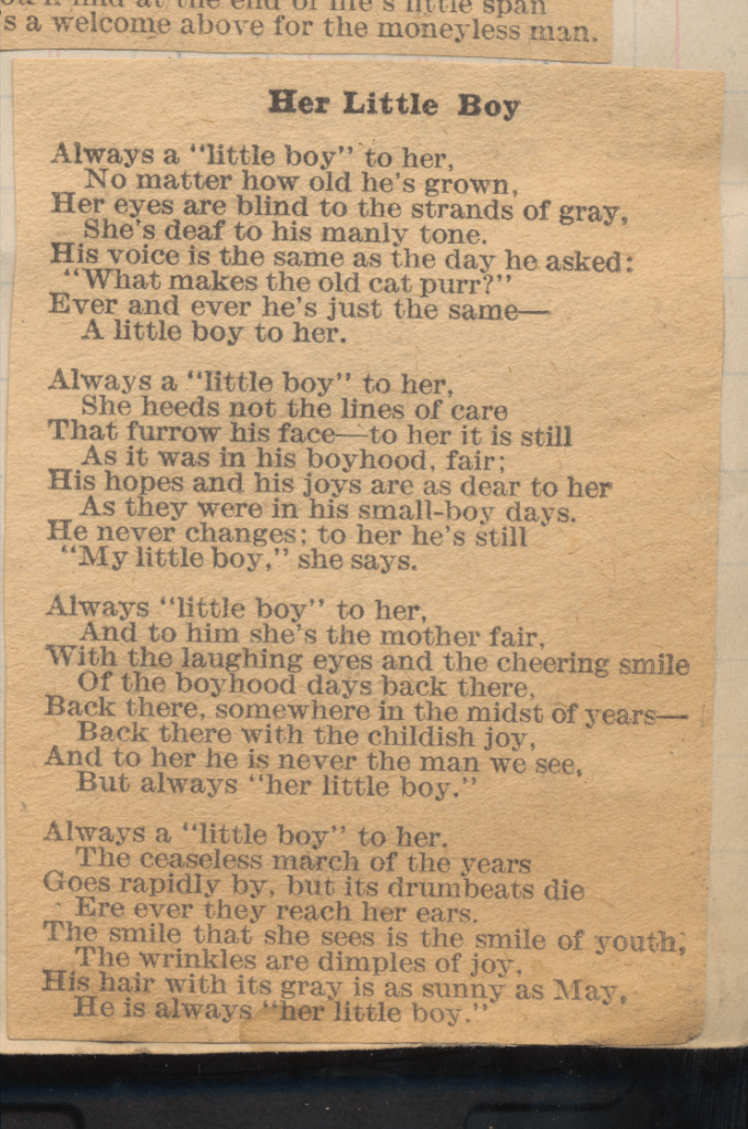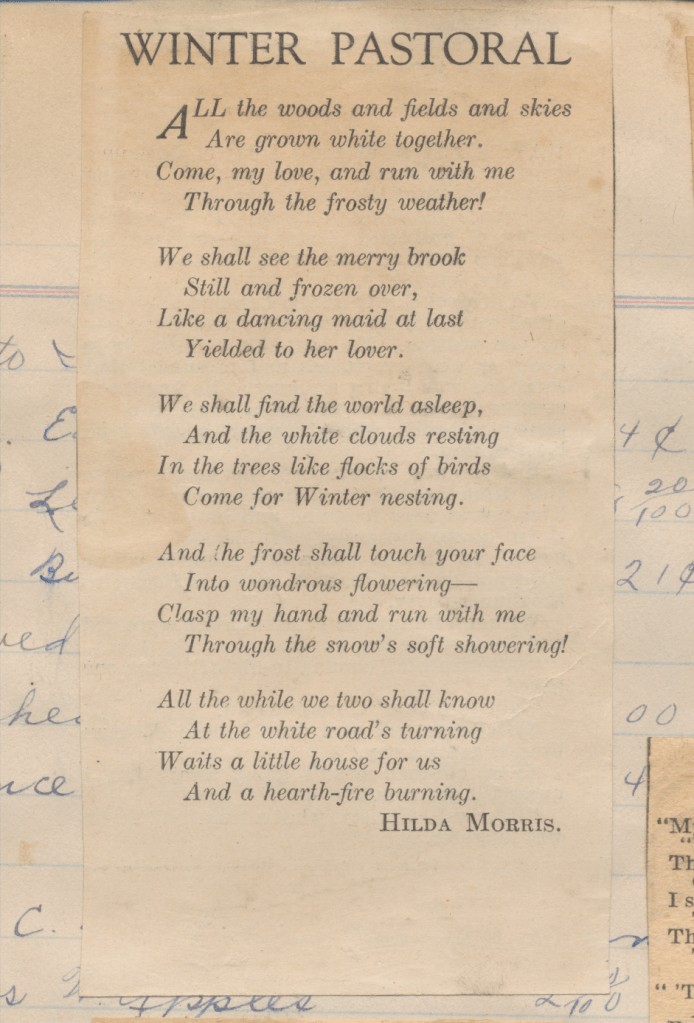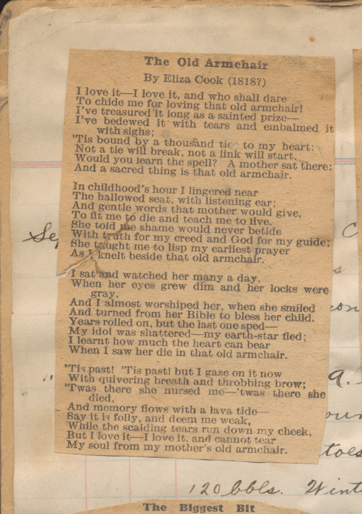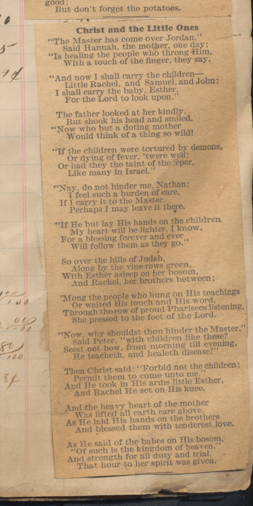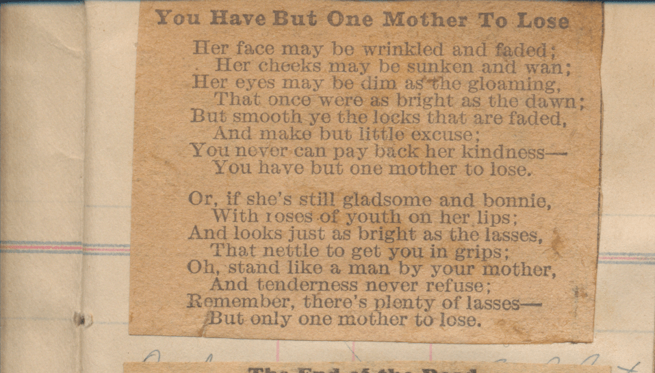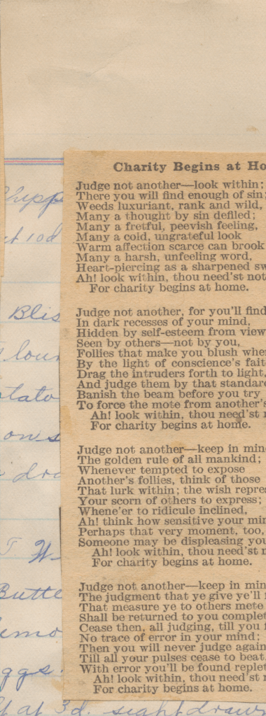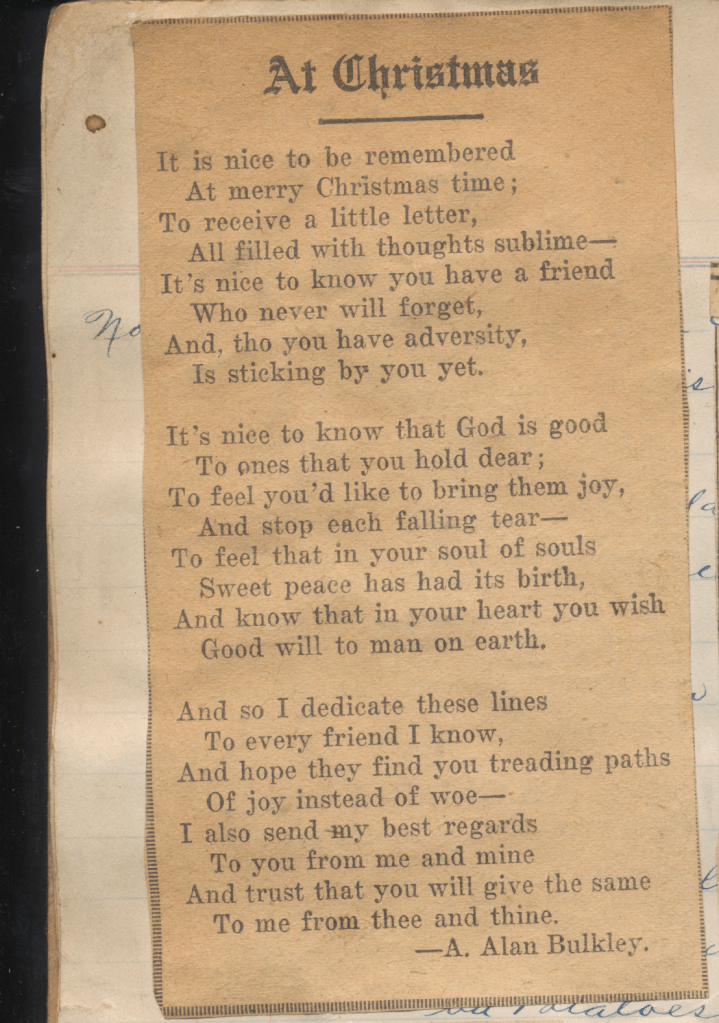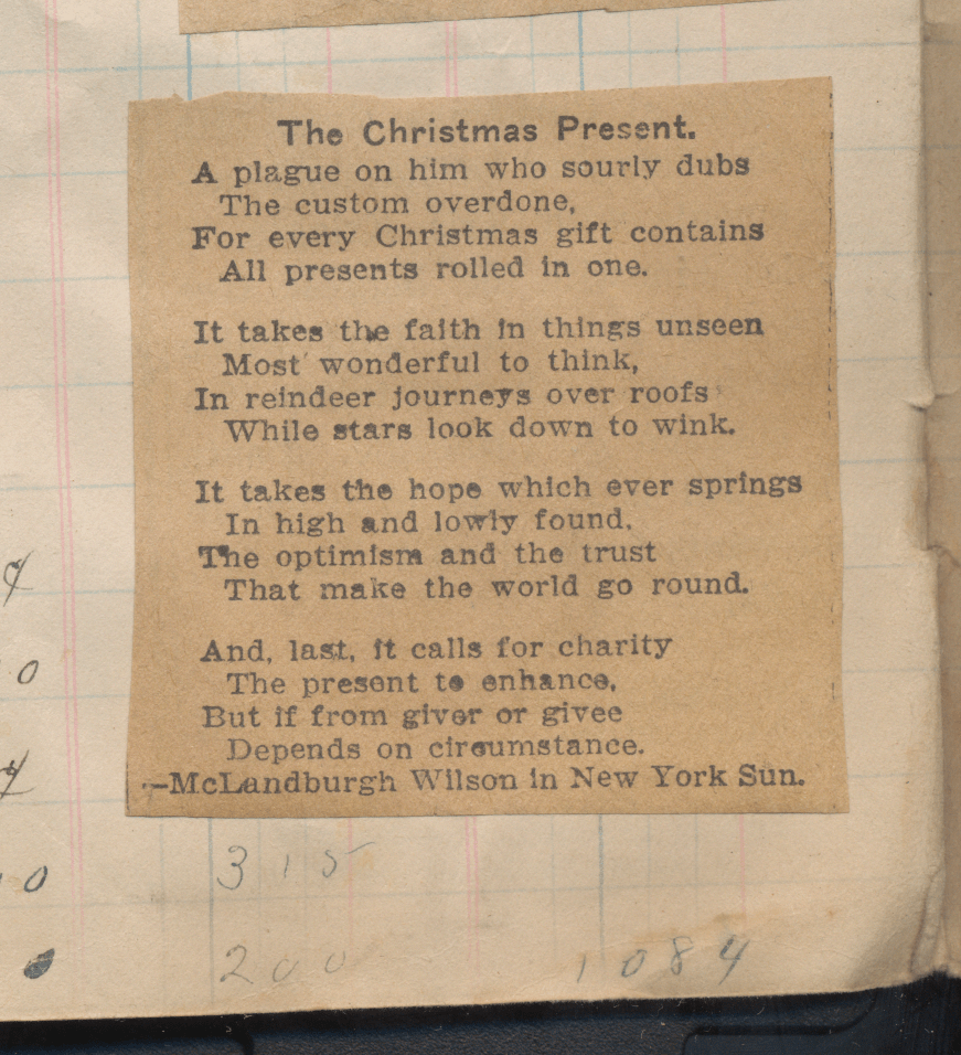 One can get a pretty good idea of what thoughts the person was immersed in when she cut this out of magazine, especially when the holidays were upon them and the individual was a mother. This particular piece and others like it were saved in a hand-written ledger. As you can see by other clippings, Cora has covered up the carefully written prices. Continues below