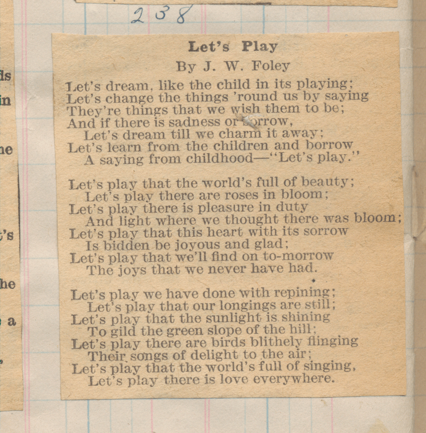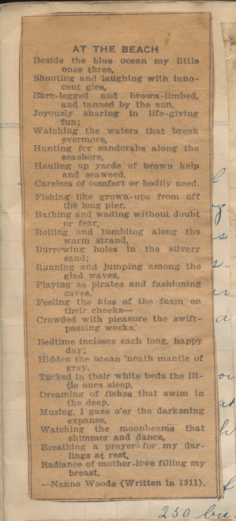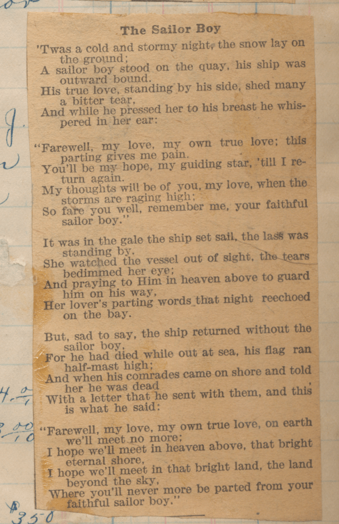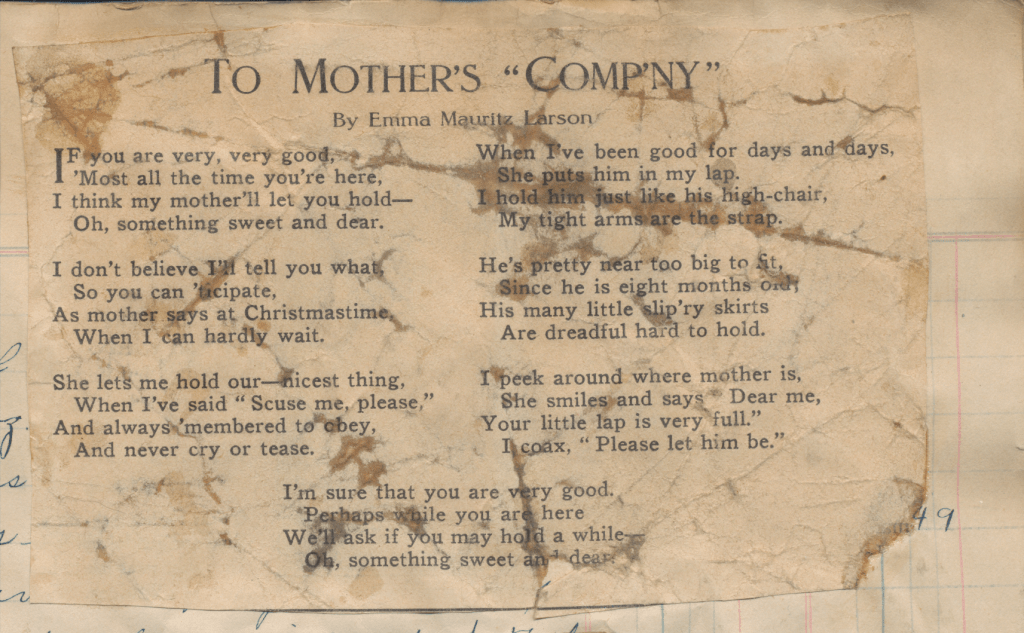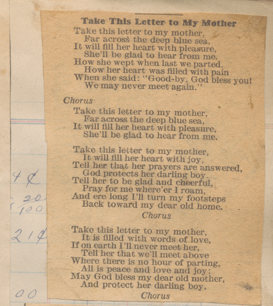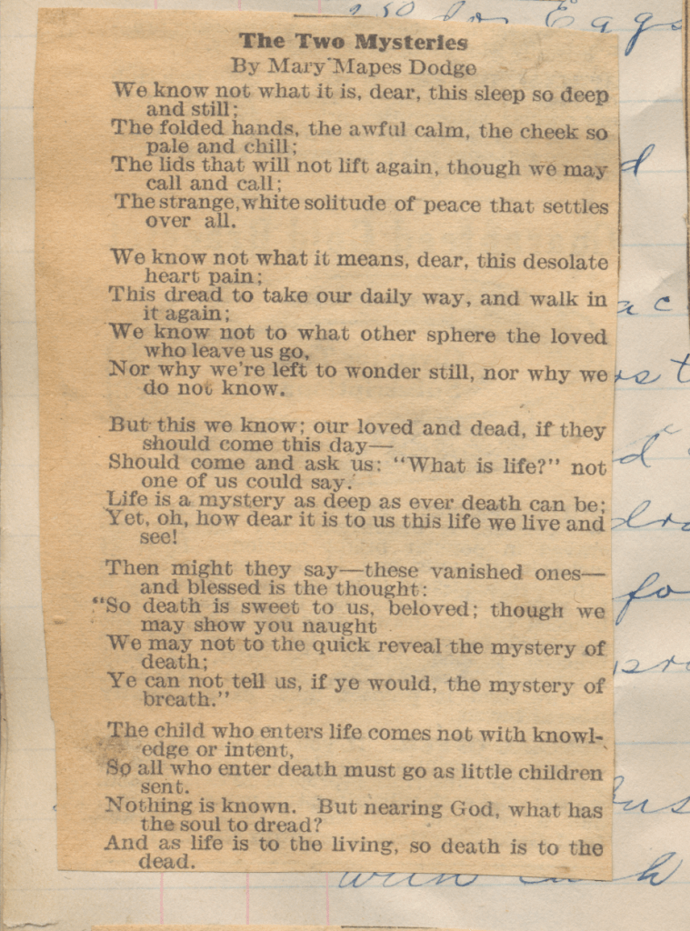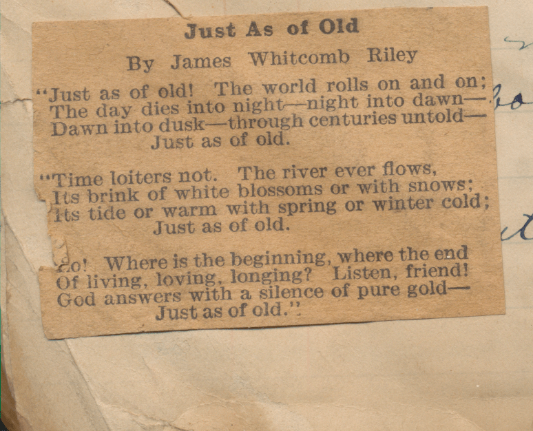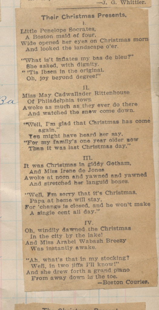 One can get a pretty good idea of what thoughts the person was immersed in when she cut this out of magazine, especially when the holidays were upon them and the individual was a mother. This particular piece and others like it were saved in a hand-written ledger. As you can see by other clippings, Cora has covered up the carefully written prices. Continues below